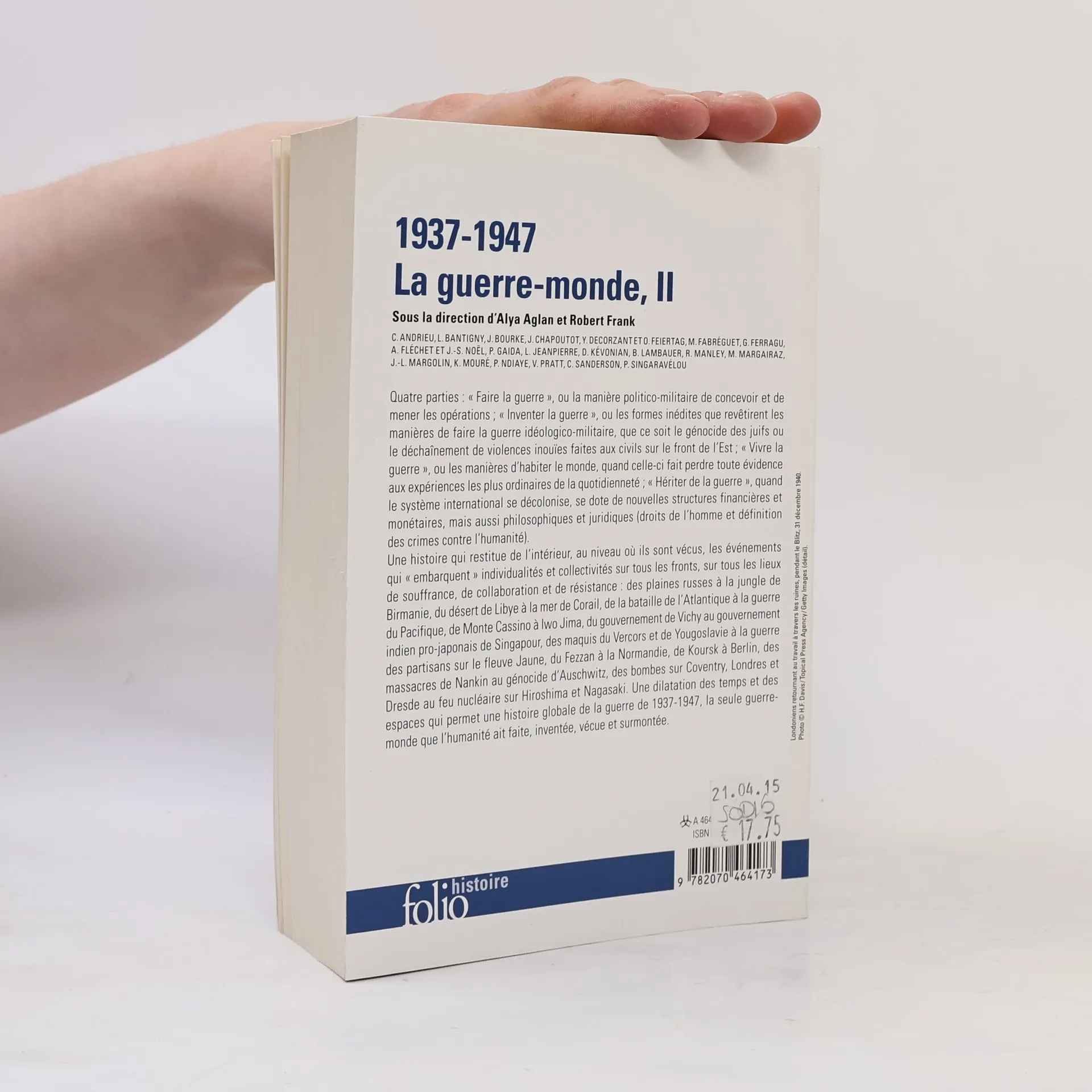 Quatre parties : "Faire la guerre", ou la manière politico-militaire de concevoir et de mener les opérations ; "Inventer la guerre", ou les formes inédites que revêtirent les manières de faire la guerre idéologico-militaire, que ce soit le génocide des juifs ou le déchaînement de violences inouïes faites aux civils sur le front de l'Est ; "Vivre la guerre", ou les manières d'habiter le monde, quand celle-ci fait perdre toute évidence aux expériences les plus ordinaires de la quotidienneté ; "Hériter de la guerre", quand le système international se décolonise, se dote de nouvelles structures financières et monétaires, mais aussi philosophiques et juridiques (droits de l'homme et définition des crimes contre l'humanité). Une histoire qui restitue de l'intérieur, au niveau où ils sont vécus, les événements qui "embarquent" individualités et collectivités sur tous les fronts, sur tous les lieux de souffrance, de collaboration et de résistance : des plaines russes à la jungle de Birmanie, du désert de Libye à la mer de Corail, de la bataille de l'Atlantique à la guerre du Pacifique, de Monte Cassino à Iwo Jima, du gouvernement de Vichy au gouvernement indien pro-japonais de Singapour, des maquis du Vercors et de Yougoslavie à la guerre des partisans sur le fleuve Jaune, du Fezzan à la Normandie, de Koursk à Berlin, des massacres de Nankin au génocide d'Auschwitz, des bombes sur Coventry, Londres et Dresde au feu nucléaire sur Hiroshima et Nagasaki. Une dilatation des temps et des espaces qui permet une histoire globale de la guerre de 1937-1947, la seule guerre-monde que l'humanité ait faite, inventée, vécue et surmontée.