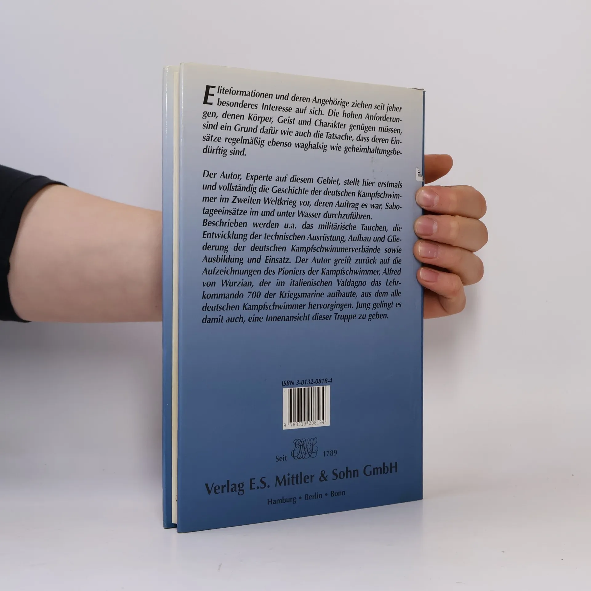 Sie gelten bis heute als legendenumwobene Elitetruppe in einer außergewöhnlichen Disziplin. Erstmals und vollständig werden hier Entstehung, Aufbau, Ausrüstung und Ausbildung der deutschen Kampfschwimmerverbände dargestellt. Der Autor greift zurück auf die Aufzeichnungen des Pioniers Alfred von Wurzian, der im italienischen Valdagno das Lehrkommando 700 aufbaute, aus dem alle deutschen Kampfschwimmer hervorgingen.