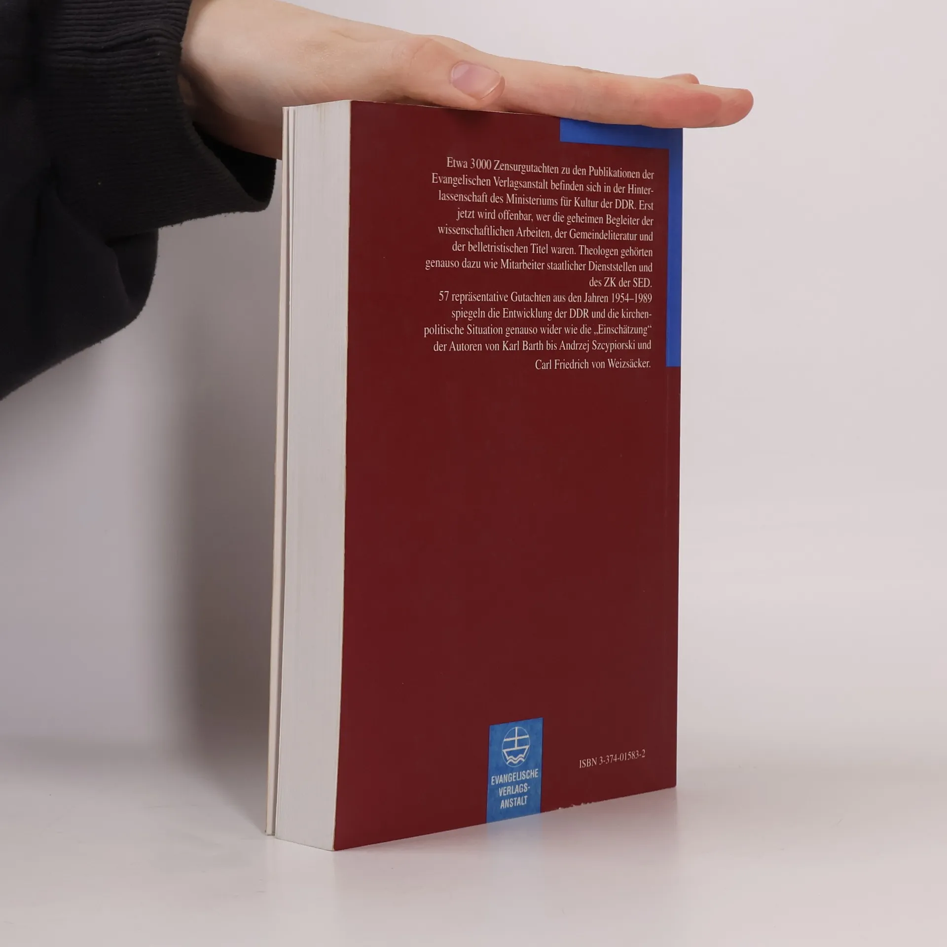 Etwa 3000 Zensurgutachten zu den Publikationen der Evangelischen Verlagsanstalt befinden sich in der Hinterlassenschaft des Ministeriums für Kultur der DDR. Erst jetzt wird offenbar, wer die geheimen Begleiter der wissenschaftlichen Arbeiten, der Gemeindeliteratur und der belletristischen Titel waren. Theologen gehörten genauso dazu wie Mitarbeiter staatlicher Dienststellen und des ZK der SED. 57 repräsentative Gutachten aus den Jahren 1954-1989 spiegeln die Entwicklung der DDR und die kirchenpolitische Situation genauso wider wie die „Einschätzung“ der Autoren Karl Barth bis Andrzej Szcypiorski und Carl Friedrich von Weizsäcker.