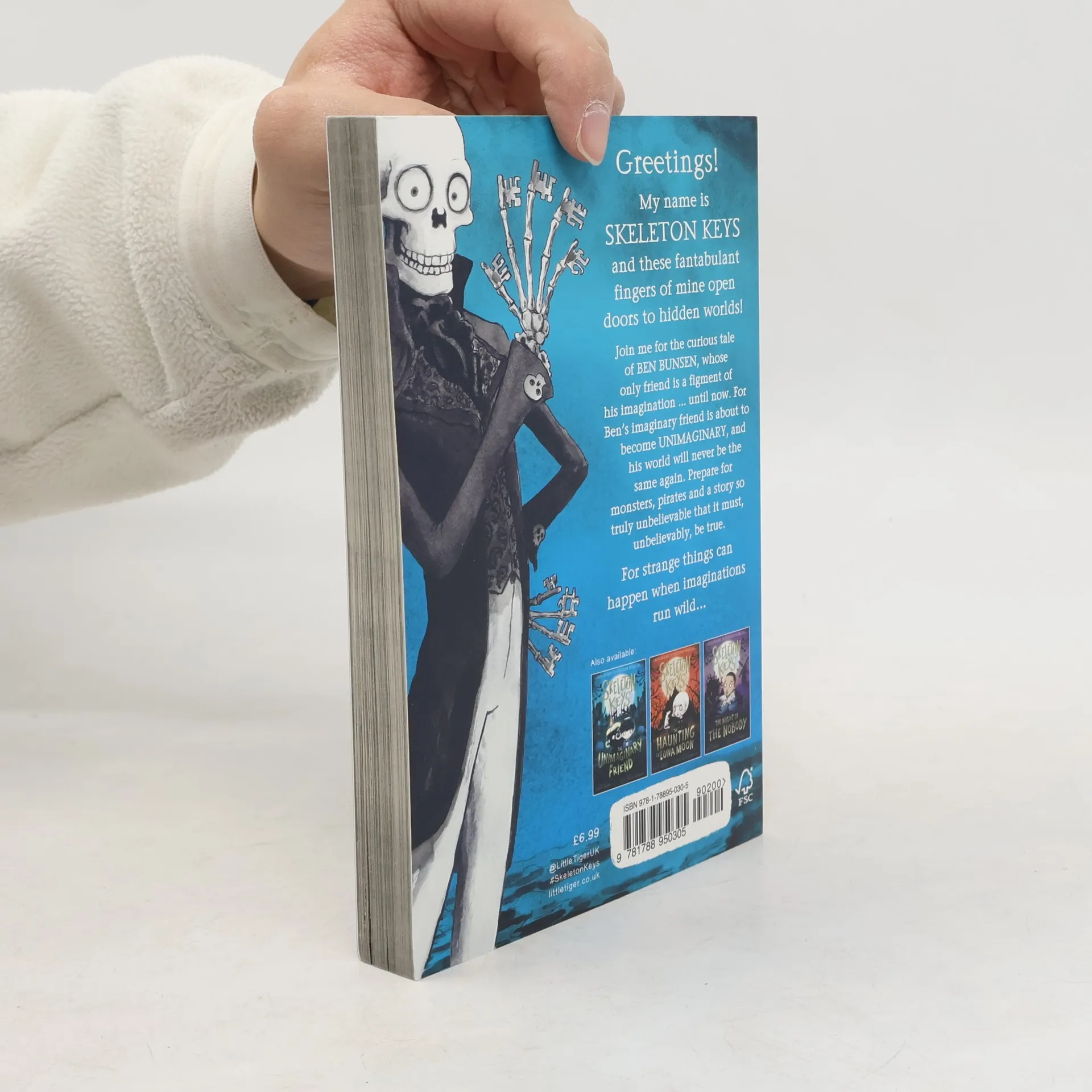 "Greetings! To the imaginary and the unimaginary! To the living, the dead and everyone in between, my name is Keys... Skeleton Keys. And these fantabulant fingers of mine can open doors to hidden worlds and secret places ... doors to the limitless realm of all the imagination." Ben can't believe it when his imaginary friend the Gorblimey becomes unimaginary. The Gorblimey is loyal and kind ... and real! But Skeleton Keys is far from convinced by the Gorblimey's friendly ways. He's got the twitch, which is (almost) never wrong, and it's telling him the Gorblimey is dangerous and needs banishing to the endless void of Oblivion. To send him packing, all he needs to do is open the door with his key-shaped bony finger ... and order will be restored. But as Ben battles to save his new friend from Oblivion, the Gorblimey is soon the least of Skeleton Keys' worries. For strange things happen when imaginations run wild and it seems that there's more than one unimaginary in town. And the other unimaginary is definitely dangerous and out for revenge... The first book in a darkly comic new series from the award-winning duo behind STITCH HEAD. Perfect for fans of THE NOTHING TO SEE HERE HOTEL, IGUANA BOY and MAUDLIN TOWERS.