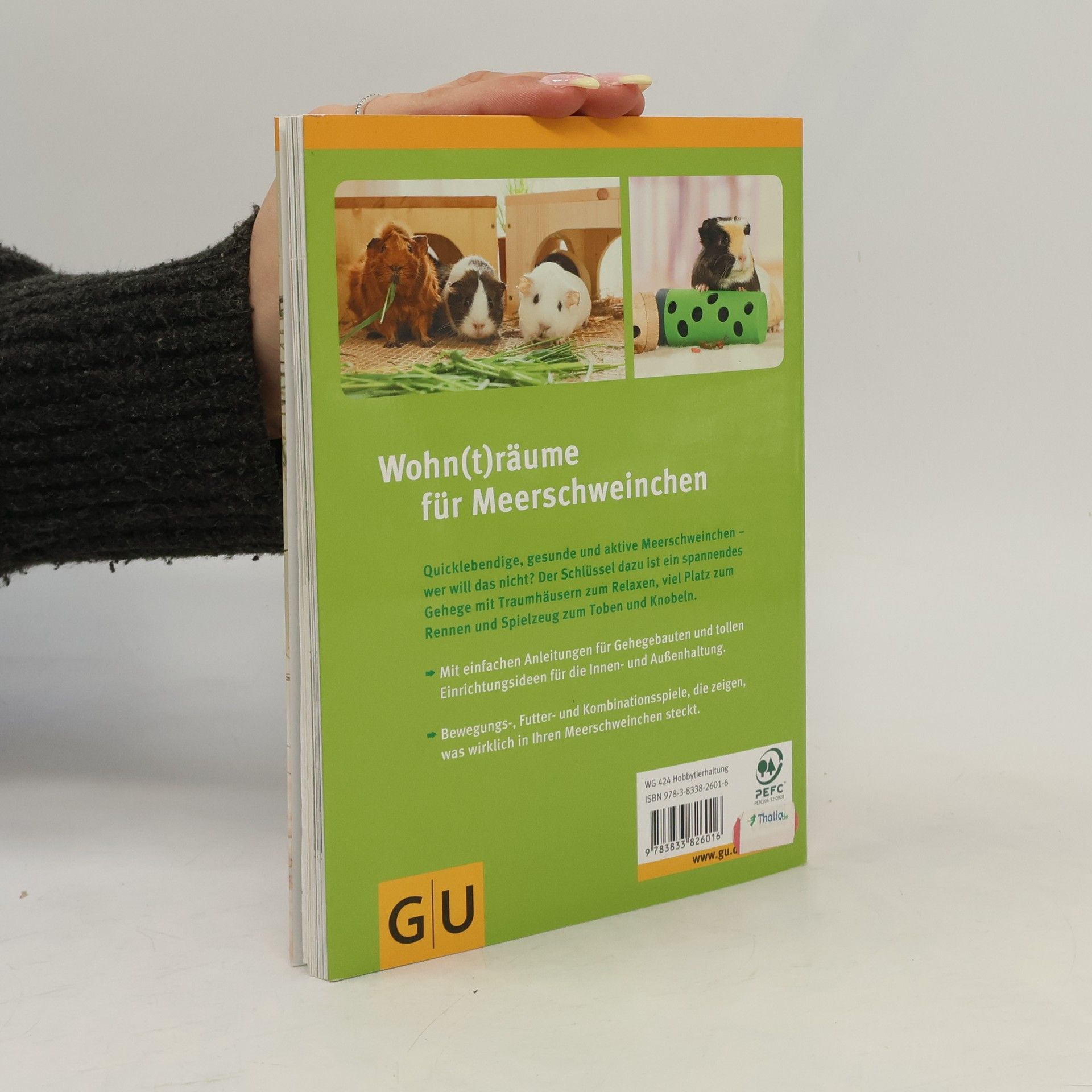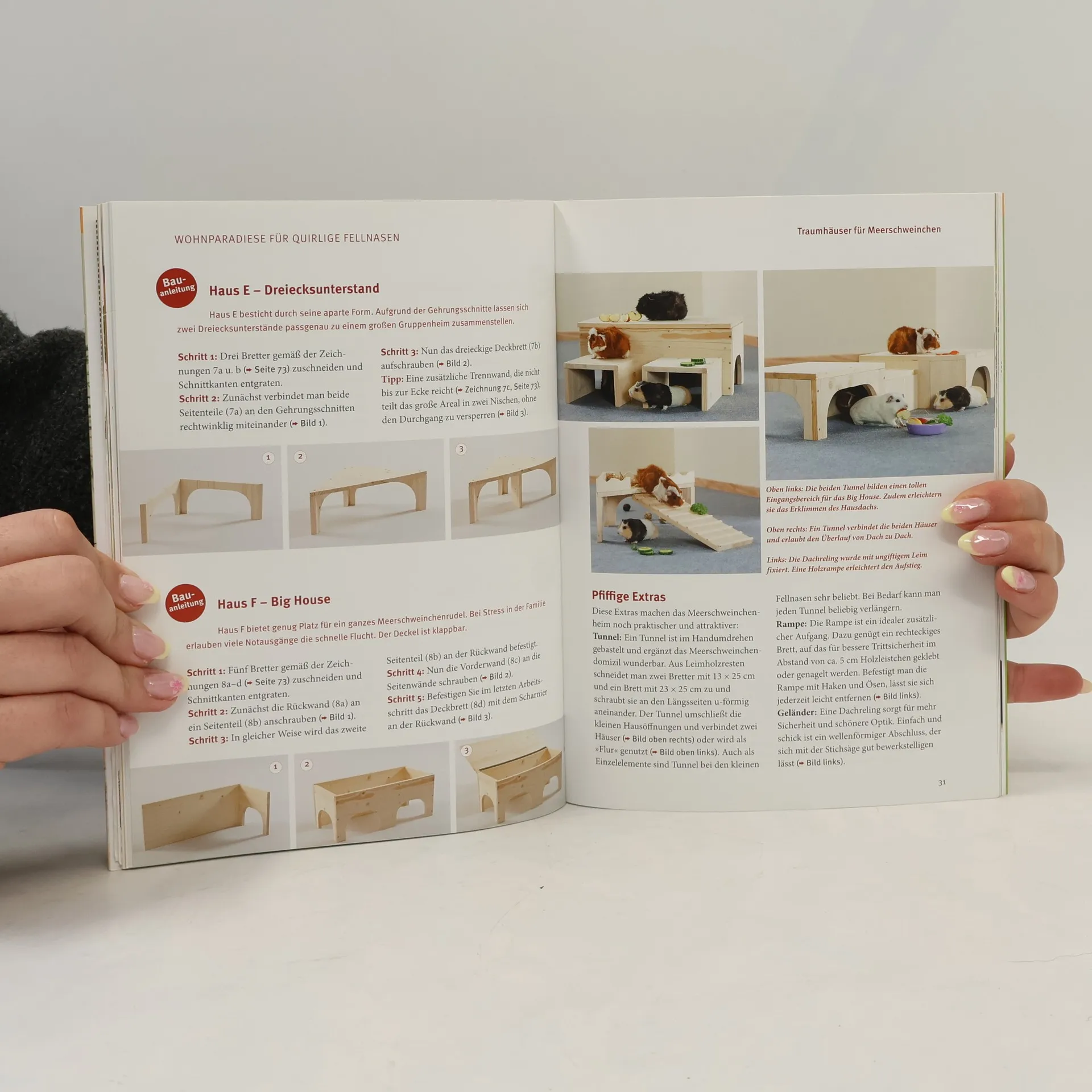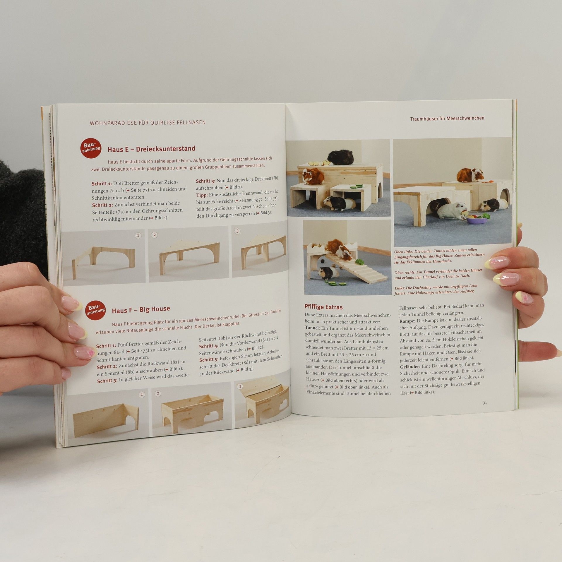 Meerschweinchen sind weit mehr als kleine Fellbündel, die nur am Fressen interessiert sind und sich die meiste Zeit in ihren Häuschen verstecken. Ihren wahren vorwitzigen Charakter und ihr verblüffendes Verhaltensrepertoire zeigen die geselligen Kleinnager erst unter den richtigen Haltungsbedingungen mit abwechslungsreichen Beschäftigungsangeboten. Dieser Ratgeber zeigt wie es geht: Er stellt außergewöhnliche Traumhäuser und Wohnungseinrichtungen für Drinnen und Draußen vor, die sich vielfältig kombinieren lassen. Zu den Wohnideen gibt es detaillierte Schritt-für-Schritt-Bauanleitungen, mit denen auch ungeübte Heimwerker zu erfolgreichen Wohnungsbauern werden. Die zahlreichen Spiel- und Beschäftigungsideen wurden speziell für diesen Ratgeber getestet. Hier können die Meerschweinchen gemeinsam mit Ihnen in Fitness-, und Knobelspielen ihre körperlichen Fähigkeiten und ihr Köpfchen beweisen. So sind die kleinen Nager garantiert artgerecht beschäftigt und bleiben nebenbei auch noch fit.