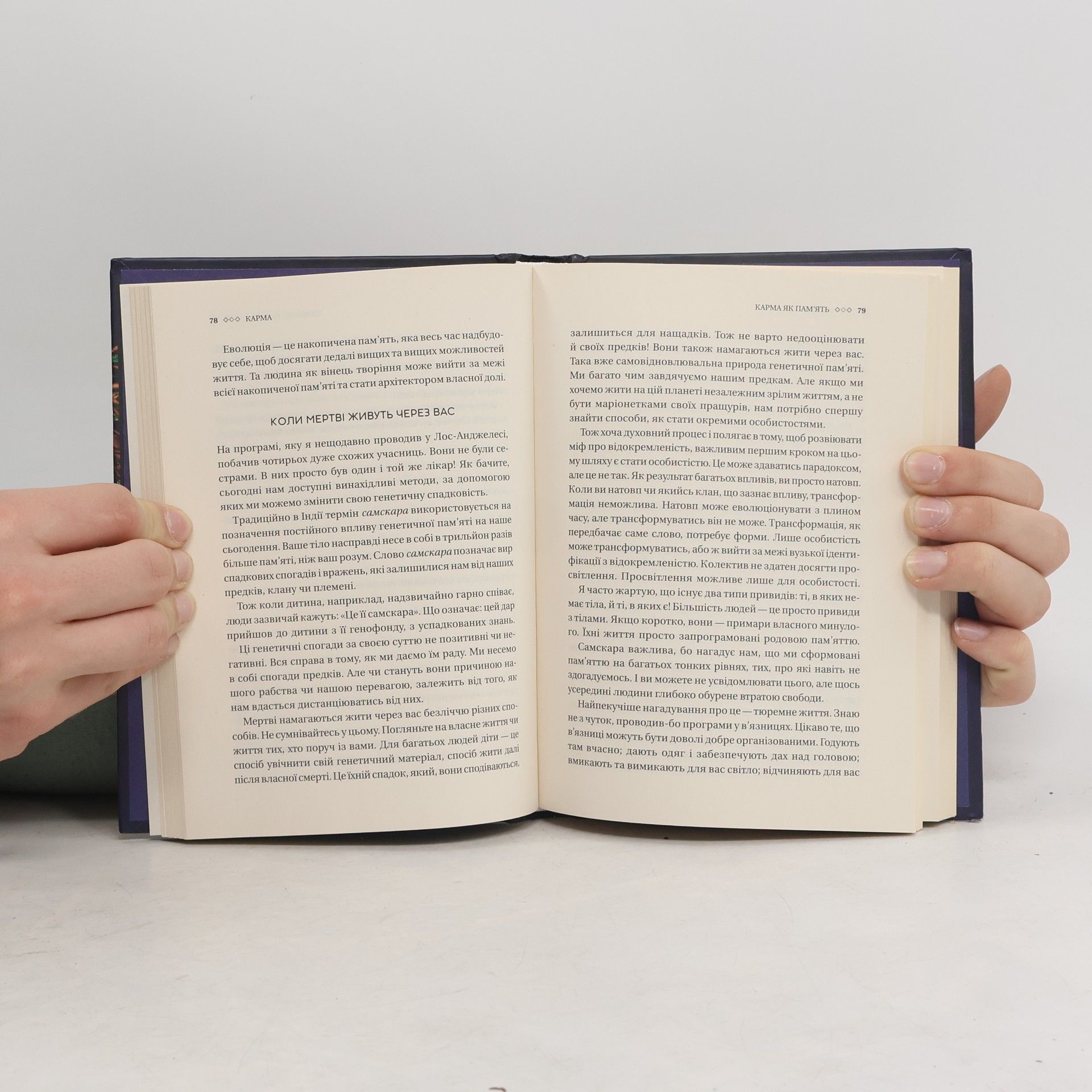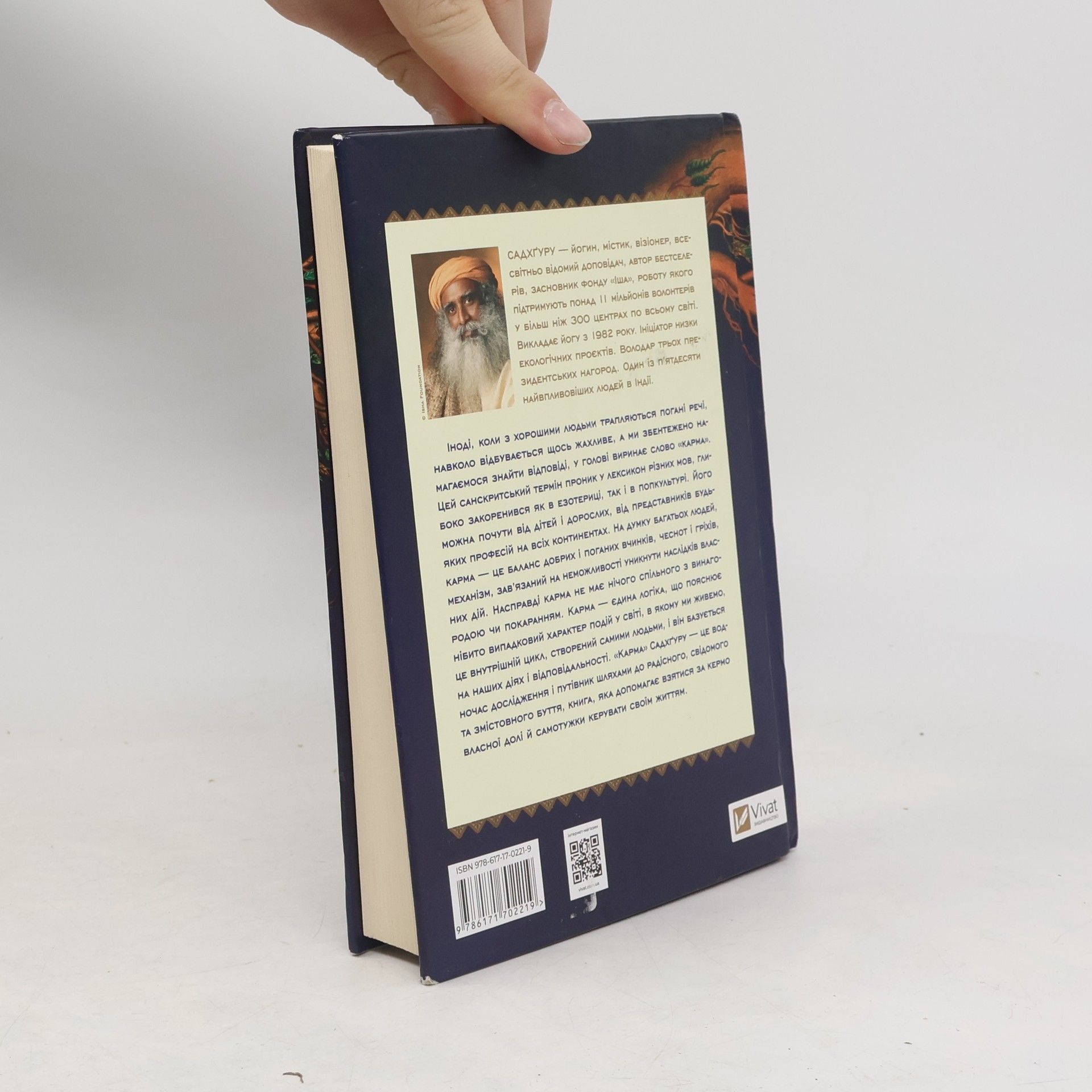 "Іноді, коли з хорошими людьми трапляються погані речі, навколо відбувається щось жахливе, а ми збентежено намагаємося знайти відповіді, у голові виринає слово 'карма.' Цей санскритський термін проник у лексикон різних мов, глибоко закоренився як в езотериці, так і в попкультурі. Його можна почути від дітей і дорослих, від представників будь-яких професій на всіх континентах. На думку багатьох людей, карма -- це баланс добрих і поганих вчинків, чеснот і гріхів, механізм, зав'язаний на неможливості уникнути наслідків власних дій. Насправді карма не має нічого спільного з винагородою чи покаранням. Карма -- єдина логіка, що пояснює нібито випадковий характер подій у світі, в якому ми живемо, це внутрішній цикл, створений самими людьми, і він базується на наших діях і відповідальності. 'Карма' Садхґуру -- це водночас дослідження і путівник шляхами до радісного, свідомого та змістовного буття, книга, яка допомагає взятися за кермо власної долі й самотужки керувати своїм життям."--