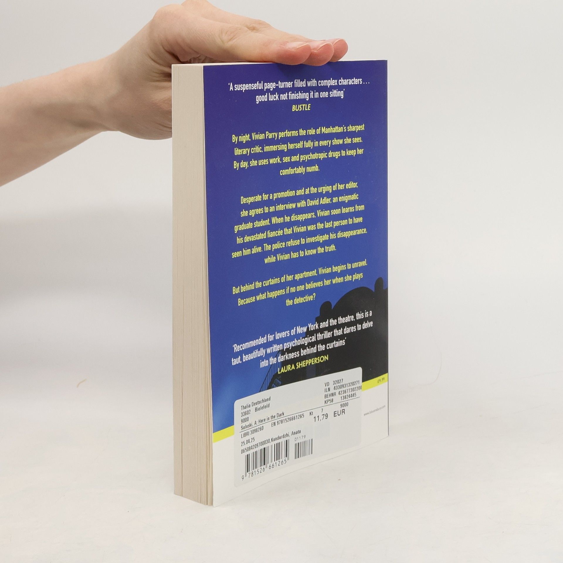 'Impressive' Financial Times 'Terrific' Guardian 'Elegant' Laura Shepperson By night, Vivian Parry performs the role of Manhattan's sharpest literary critic, immersing herself fully in every show she sees. By day, she uses work, sex and psychotropic drugs to keep her comfortably numb. Desperate for a promotion and at the urging of her editor, she agrees to an interview with David Adler, an enigmatic graduate student. When he later disappears, Vivian soon learns from his devastated fiancée that she was the last person to have seen him alive. The police refuse to investigate his disappearance and Vivian finds herself obsessed with what happened, assuming the role of amateur investigator. But as she gets closer to the truth about David Adler, she finds that the boundaries between theatre and reality are more tenuous than even she could have believed.