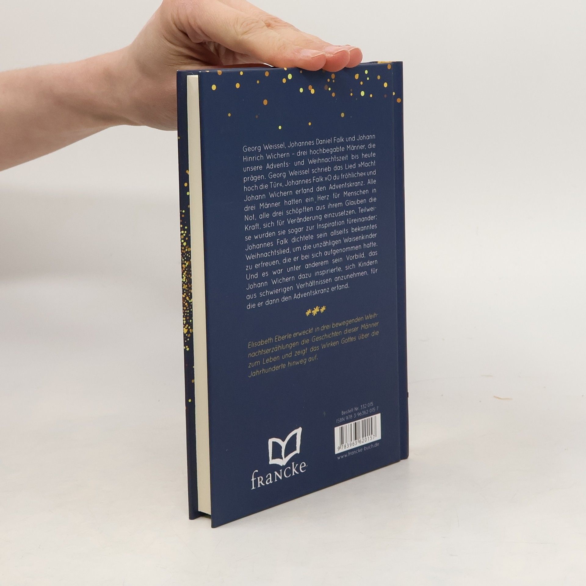 Georg Weissel, Johannes Daniel Falk und Johann Hinrich Wichern – drei hochbegabte Männer, die unsere Adventsund Weihnachtszeit bis heute prägen. Georg Weissel schrieb das Lied »Macht hoch die Tür«, Johannes Falk »O du fröhliche« und Johann Wichern erfand den Adventskranz. Alle drei Männer hatten ein Herz für Menschen in Not, alle drei schöpften aus ihrem Glauben die Kraft, sich für Veränderung einzusetzen. Teilweise wurden sie sogar zur Inspiration füreinander: Johannes Falk dichtete sein allseits bekanntes Weihnachtslied, um die unzähligen Waisenkinder zu erfreuen, die er bei sich aufgenommen hatte. Und es war unter anderem sein Vorbild, das Johann Wichern dazu inspirierte, sich Kindern aus schwierigen Verhältnissen anzunehmen, für die er dann den Adventskranz erfand. Elisabeth Eberle erweckt in ihrem literarisch ausgereiften Stil die Geschichten dieser Männer zum Leben und zeigt das Wirken Gottes über die Jahrhunderte hinweg auf.