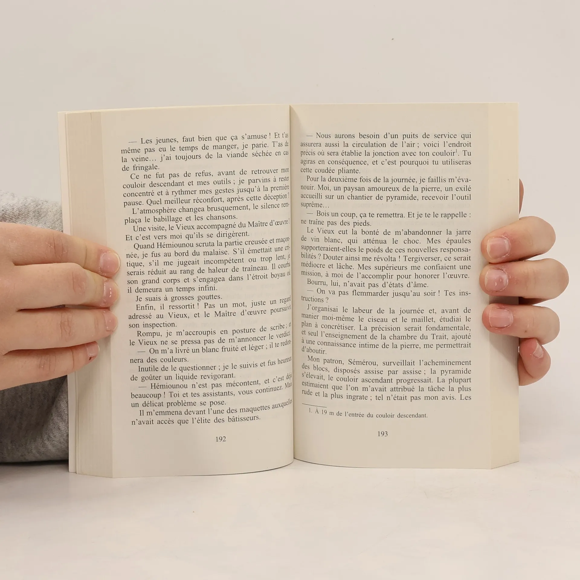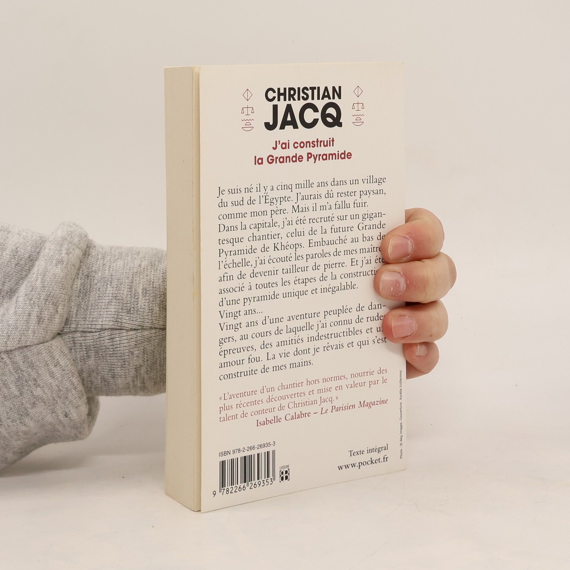 Je suis né il y a cinq mille ans dans un village du sud de l’Égypte. J’aurais dû rester paysan, comme mon père. Mais je me suis révolté contre un scribe de la corvée, le Profiteur, et je me suis enfui pour échapper à la prison. Dans la capitale, j’ai eu la chance d’être recruté sur un gigantesque chantier, celui de la future Grande Pyramide de Khéops. Embauché au bas de l’échelle, j’ai écouté les paroles de mes maîtres afin de devenir tailleur de pierre. Et j’ai été associé à toutes les étapes de la construction d’une pyramide unique et inégalable. Vingt ans… Vingt ans d’une aventure peuplée de dangers, au cours de laquelle j’ai connu de rudes épreuves, des amitiés indestructibles et un amour fou. La vie dont je rêvais et qui s’est construite par mes mains. Christian Jacq nous fait vivre la formidable aventure d’un tailleur de pierre prêt à donner sa vie pour que s’élève, à jamais, la Grande Pyramide : la dernière des Sept Merveilles du monde encore visible. Il nous révèle les secrets de ce chef-d’œuvre érigé il y a cinq mille ans, qui devait permettre à l’âme de Khéops, le pharaon, de rejoindre les paradis de l’autre monde.
