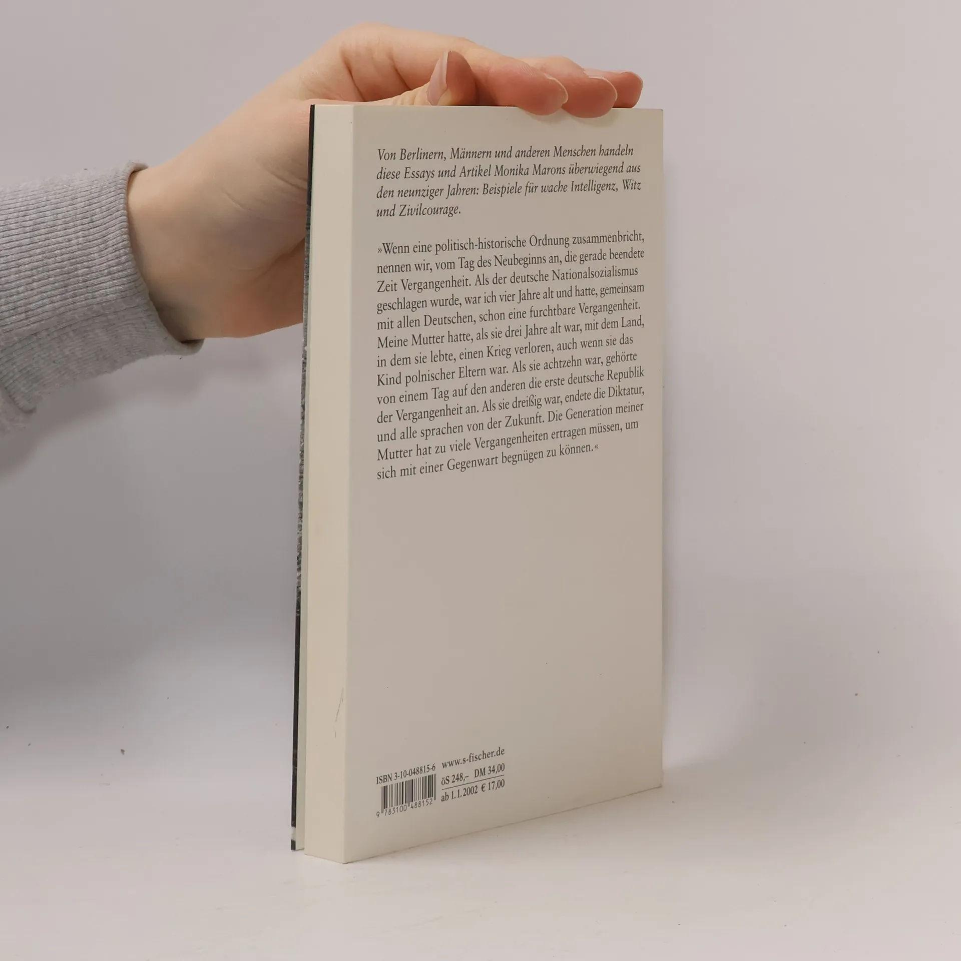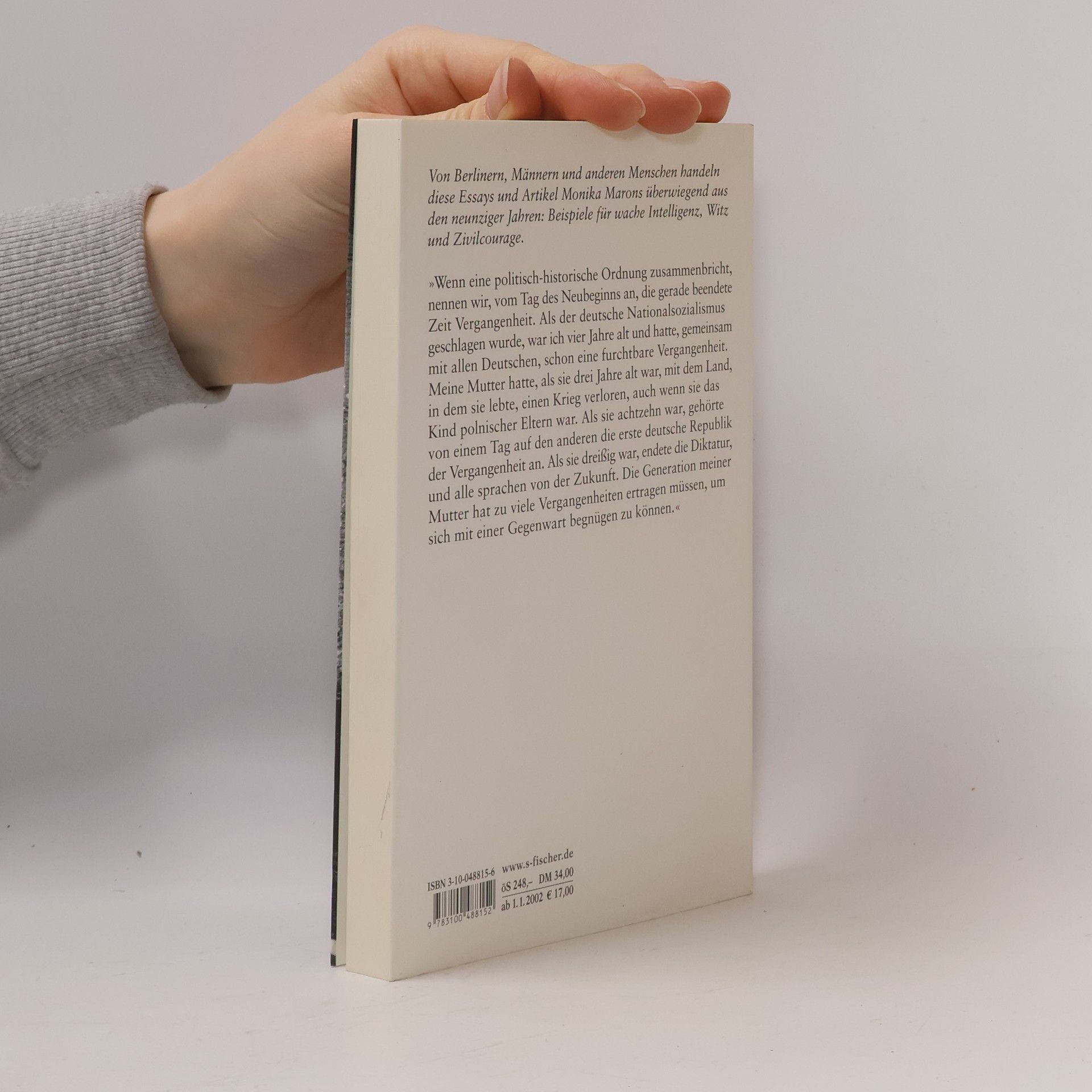 Monika Maron denkt gegen den Strom. Ob sie die Ostmenschen vor der Ignoranz der Westmenschen in Schutz nimmt und vice versa die Männer vor den Hilfsangeboten der Pharmaindustrie - „Ein Mann ohne Versagensangst ist ein Alptraum“ - oder die Generation der Mütter und Großmütter vor den Girlys: fast immer wirken Marons Kommentare im Sinne einer Richtigstellung und der Parteinahme. Das Spektrum dieser Texte reicht von ironischen Glossen bis hin zu essayistischen Diskursen und zum literarischen Porträt. Ein Thema, das sich wie ein roter Faden durch alle Texte zieht, ist die Frage nach dem Wesen und dem Wirken der Erinnerung. Der Verdächtigung, der eigenen Erinnerung gegenüber nur eine selektive Wahrnehmung zuzulassen, begegnet Monika Maron, indem sie die beiden Berichte aus dem Jahr 1976 vorlegt, die ihr 1995 den Vorwurf, für die Staatssicherheit gearbeitet zu haben, eintrugen. Monika Maron erweist sich in diesen Texten einmal mehr als eine mutige Meisterin des Hinterfragens, die auch und gerade dann auf ihren Fragen besteht, wenn der Konflikt mit dem, was jeweils politisch korrekt und opportun ist, vorgegeben ist.