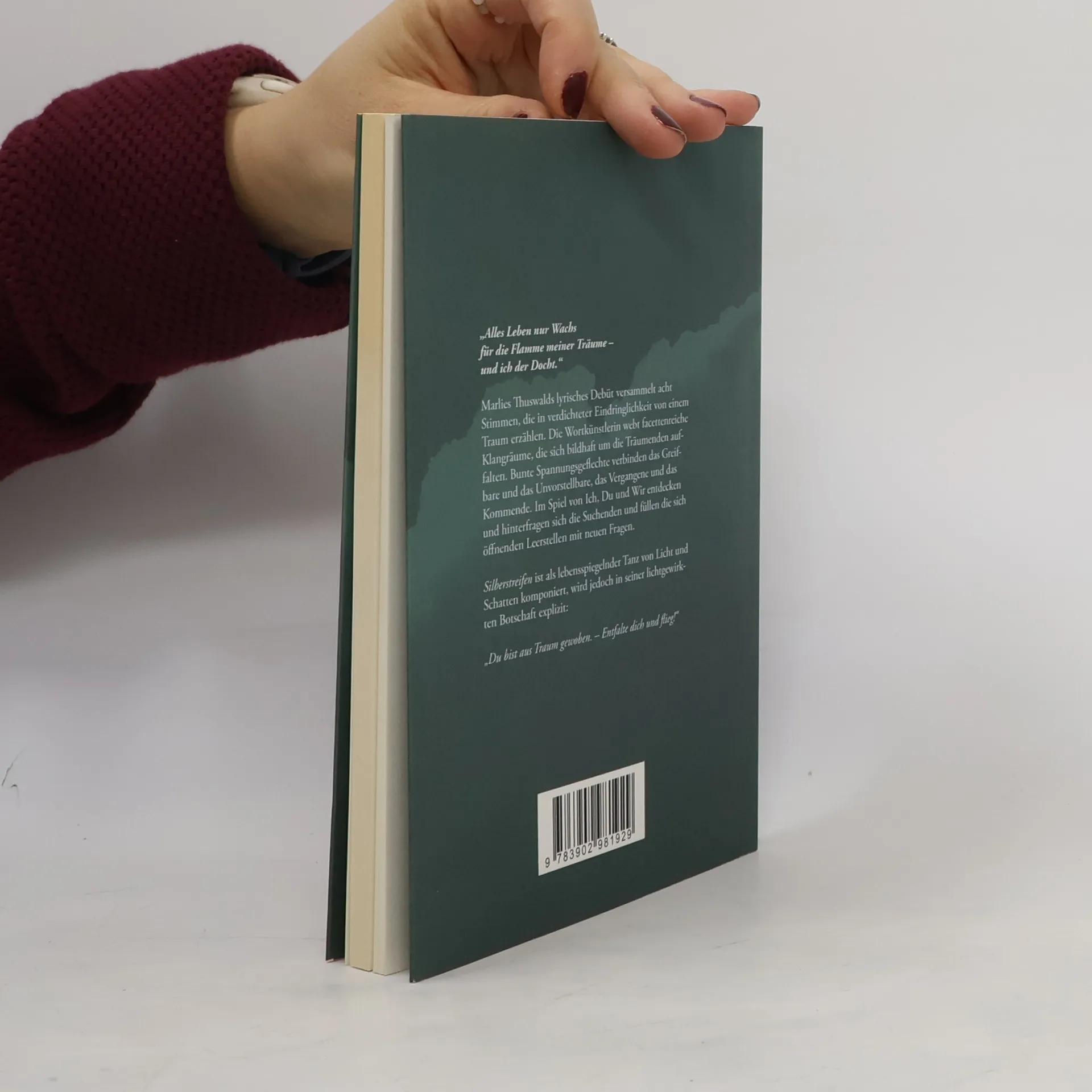 „Alles Leben nur Wachs für die Flamme meiner Träume – und ich der Docht.“ Marlies Duswalds lyrisches Debüt versammelt acht Stimmen, die in verdichteter Eindringlichkeit von einem Traum erzählen. Die Wortkünstlerin webt facettenreiche Klangräume, die sich bildhaft um die Träumenden auffalten. Bunte Spannungsgeflechte verbinden das Greifbare und das Unvorstellbare, das Vergangene und das Kommende. Im Spiel von Ich, Du und Wir entdecken und hinterfragen sich die Suchenden und füllen die sich öffnenden Leerstellen mit neuen Fragen. Silberstreifen ist als lebensspiegelnder Tanz von Licht und Schatten komponiert, wird jedoch in seiner lichtgewirkten Botschaft explizit: „Du bist aus Traum gewoben. – Entfalte dich und flieg!“
