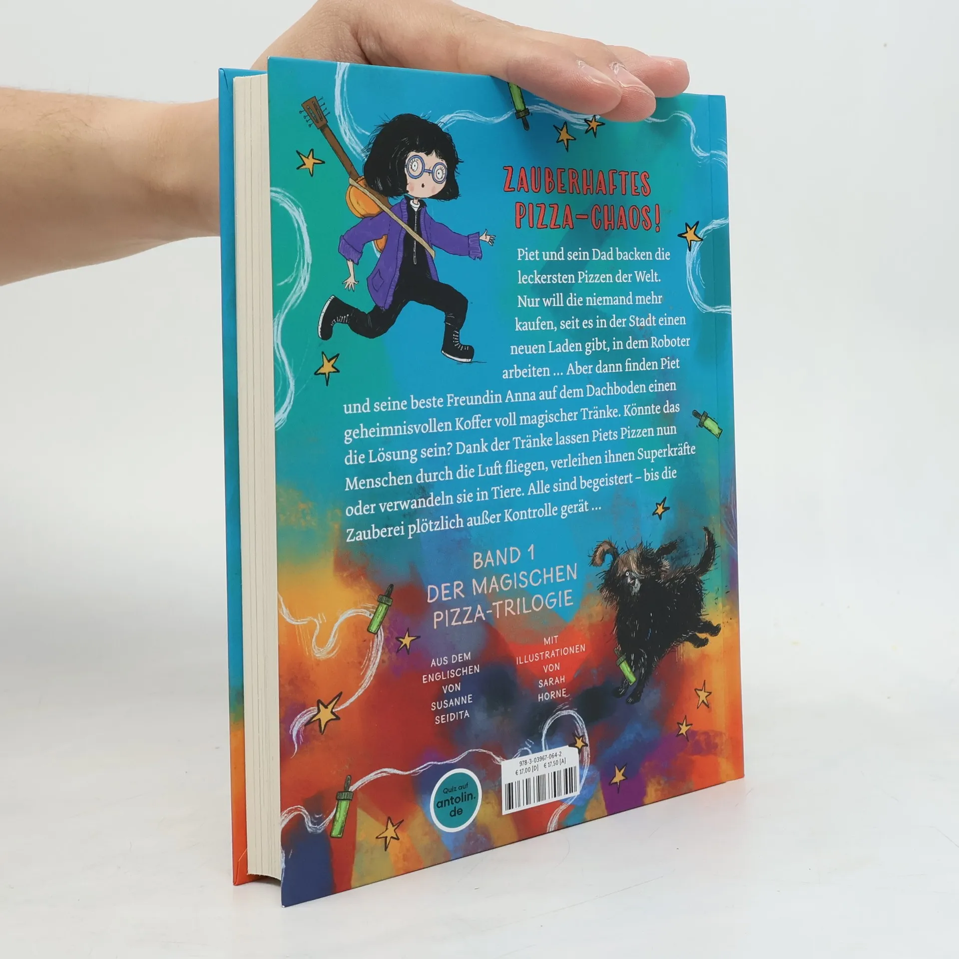 Magische Pizza für alle! Piet hat alles, was er braucht: ein gemütliches Zuhause, eine supercoole beste Freundin und seinen Dad, der die leckerste Pizza der Welt macht. Als in der Stadt jedoch eine neue Pizzeria öffnet, in der man Robotern beim Kochen zusehen kann, verliert das Restaurant von Piets Vater die Kundschaft und bald reicht das Geld nicht mehr für die Miete. Aber dann finden Piet, seine Freundin Anna und ihr Hund Nutzlos auf dem Dachboden einen geheimnisvollen Koffer voller Glasfläschchen, die sich als magische Tränke herausstellen. Könnte das die Lösung sein? Dank der Tränke lassen Piets Pizzen nun Menschen durch die Luft fliegen, verleihen ihnen Superkräfte oder verwandeln sie in Tiere. Der Ansturm ist überwältigend – bis alles schiefgeht und Piet sich nicht mehr sicher ist, ob er dieses Chaos jemals wieder in den Griff bekommen wird ...