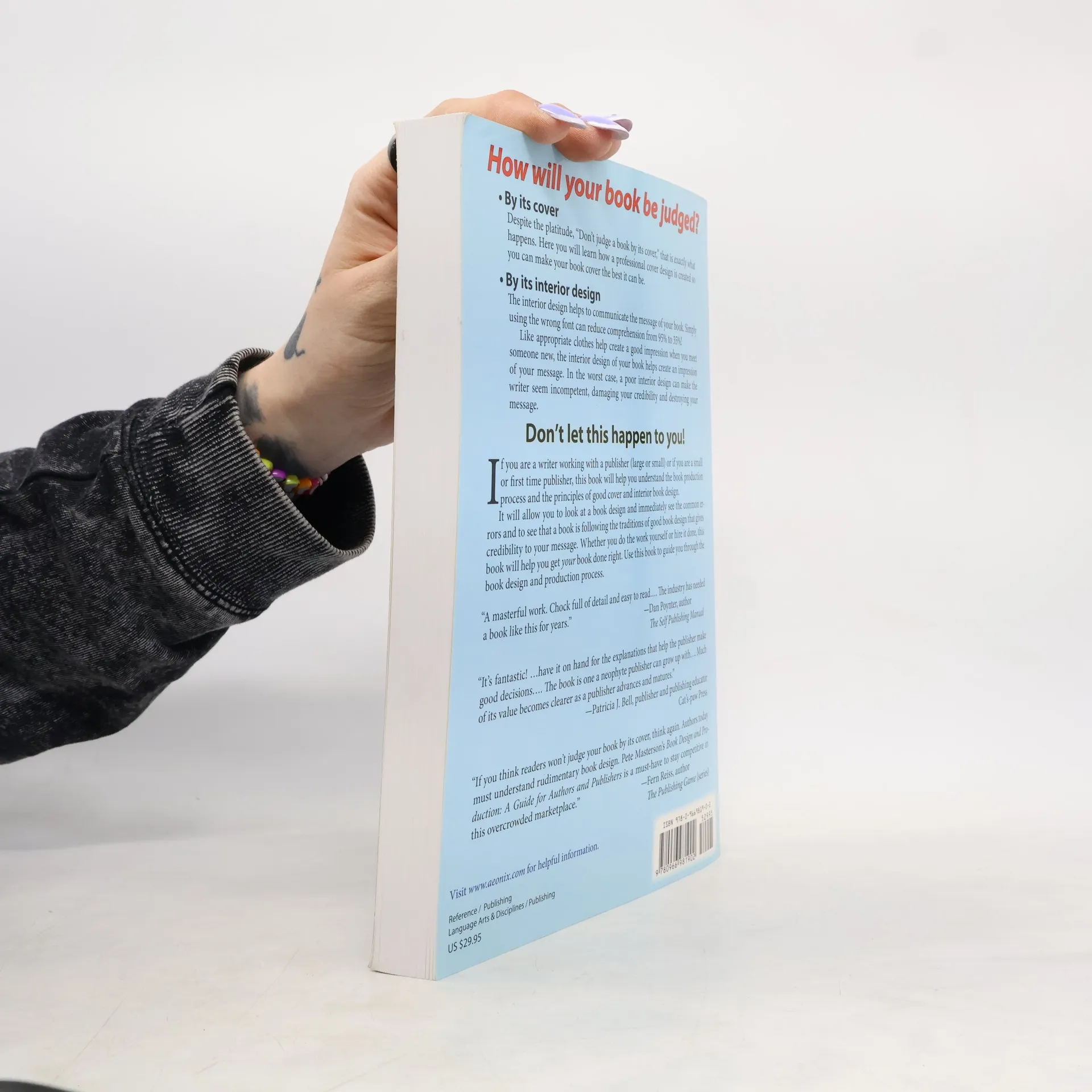 If you are a writer working with a publisher (large or small) or if you are a small or first time publisher, this book will help you understand the book production process and the principles of good cover and interior book design. It will allow you to look at a book design and immediately see the common errors and to see that a book is following the traditions of good book design that gives credibility to your message. Whether you do the work yourself or hire it done, this book will help you get your book done right. Use this book to guide you through the bookd design and production process.