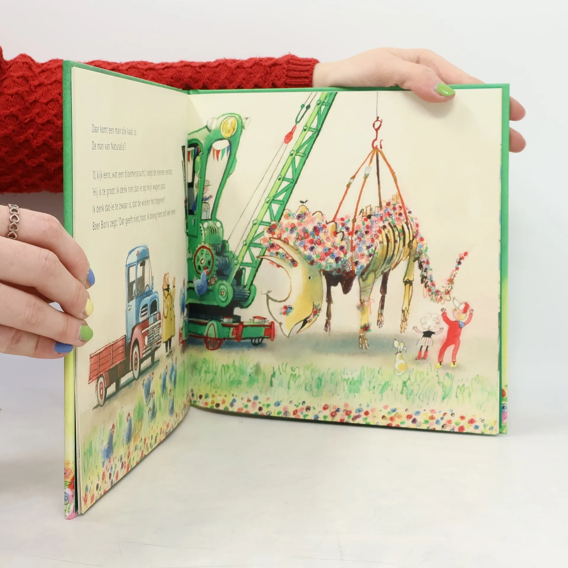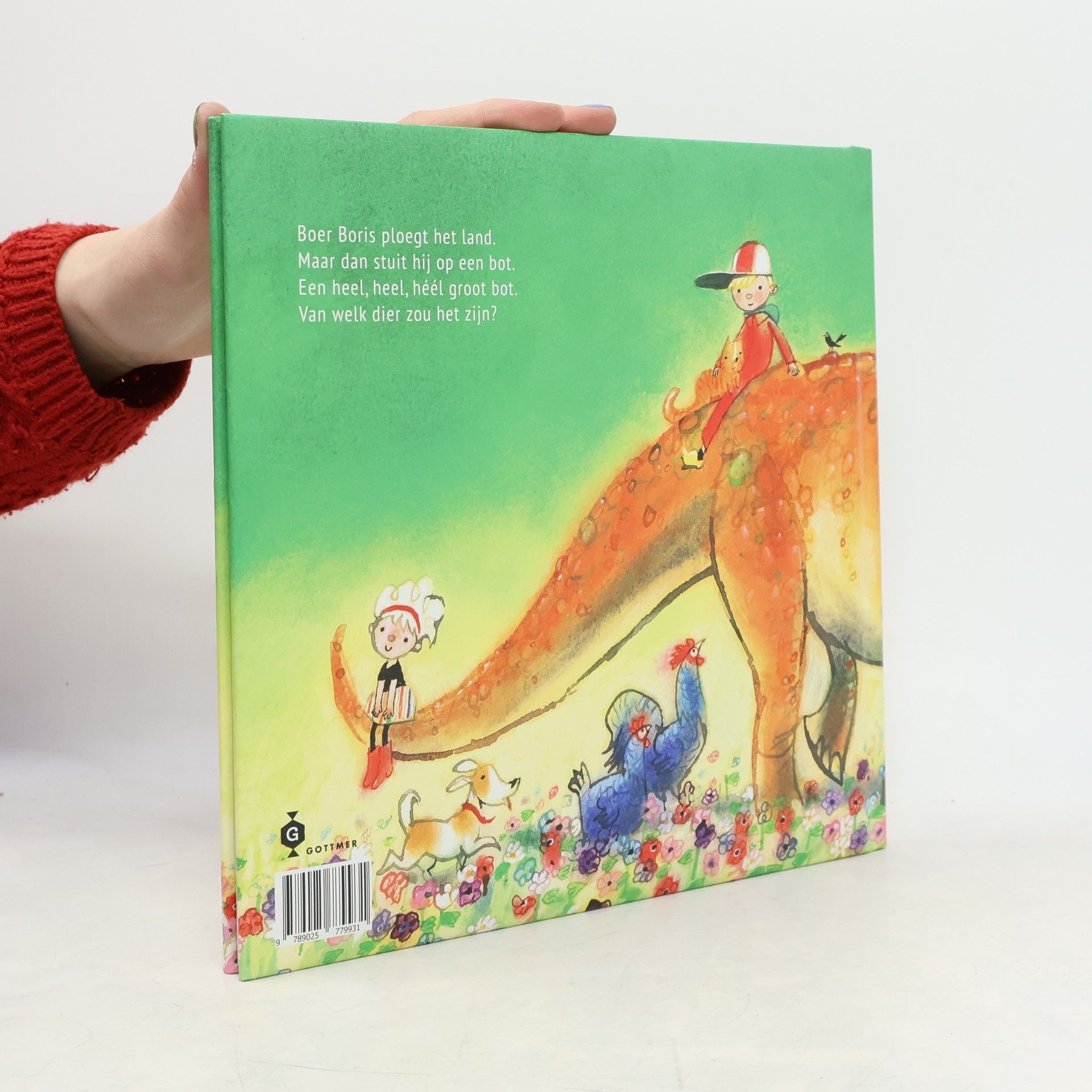 Boer Boris ploegt zijn land om. Dan vindt hij een heel groot bot. Niet één maar nog veel meer! Het zijn de botten van een dinosaurus. Boer Boris belt Naturalis om de dinosaurus op te halen. Maar dan heeft Sam een plan! Vierkant prentenboek met paginagrote, vrolijk gekleurde illustraties en tekst op rijm. Vanaf ca. 3 jaar.