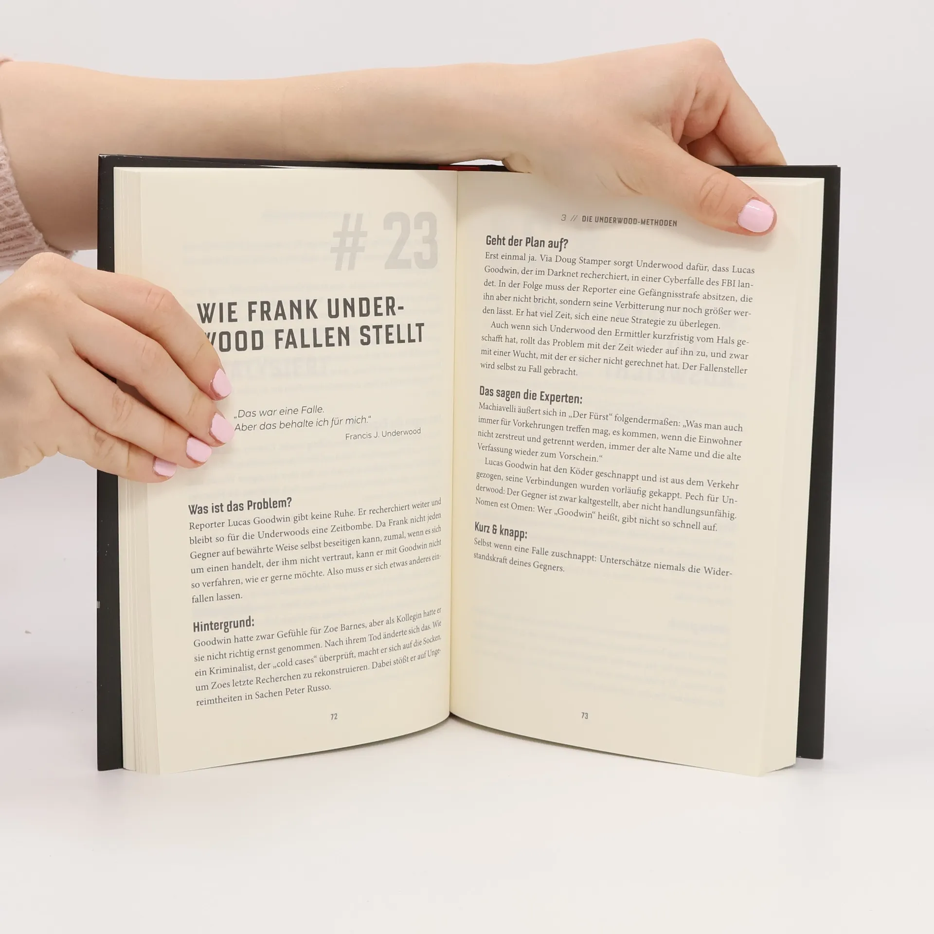 Der inoffizielle Ratgeber für alle machthungrigen HoC-Fans. Welche Strategien verfolgt Frank Underwood? Welche Mechanismen nutzt er? Wo finden sich die Schlüsselszenen in der Serie? Dieses Buch lüftet die letzten Geheimnisse und zeigt, wie jeder von uns – ob genervter Mitarbeiter oder gestresster Vereinskollege – seinen Zielen mit der richtigen Methode sehr schnell sehr viel näher kommen kann. In der Tradition des Klassikers „Der Fürst“ von Niccolò Machiavelli.