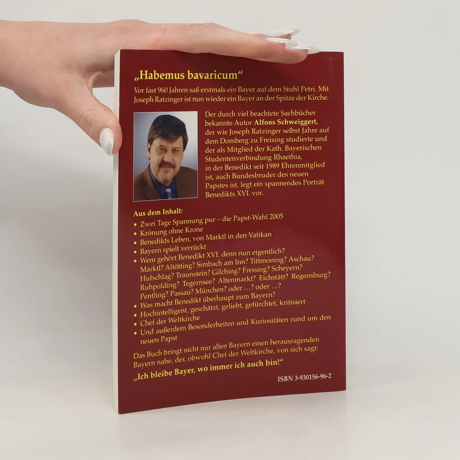 „Er ist Bayer“, staunte die Welt, als Kardinal Joseph Ratzinger Mitte April 2005 zum neuen Papst gewählt worden war. Er gab sich den Namen Benedikt XVI. Damit wurde erstmals seit nahezu 500 Jahren wieder ein Deutscher Oberhaupt der römisch-katholischen Kirche. Alfons Schweiggert legt ein spannendes Portrait der faszinierenden und interessanten Persönlichkeit Benedikt XVI. vor. Von der Papstwahl und der unbändigen Freude der Bayern über „ihren“ Papst, von kulinarischen Huldigungen Benedikts oder dem Streit der Bayern, wohin das Kirchenoberhaupt denn nun gehöre schreibt Schweiggert im lockeren Ton, ohne dabei respektlos zu sein. Interessante Details aus dem Leben Joseph Ratzingers lassen ihn in einem menschlichen aber würdevollen Licht erscheinen. Alfons Schweiggert, der bekannte Münchener Schriftsteller, hat ebenso wie Joseph Ratzinger auf dem Domberg zu Freising studiert und war Mitglied der Katholisch Bayerischen Studentenverbindung Rhaethia, in der der spätere Papst seit 1989 Ehrenmitglied ist. Der Autor zeichnet nicht nur ein Portrait des Papstes, er nimmt auch die bayerische Gesellschaft aufs Korn.