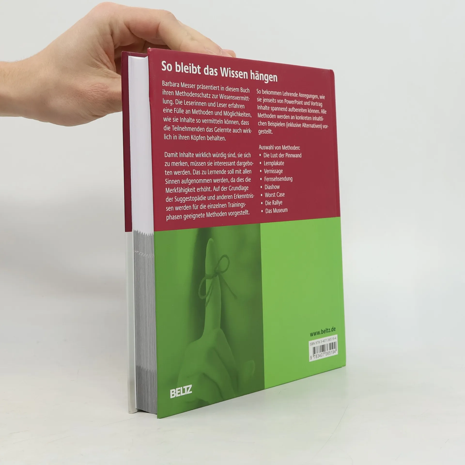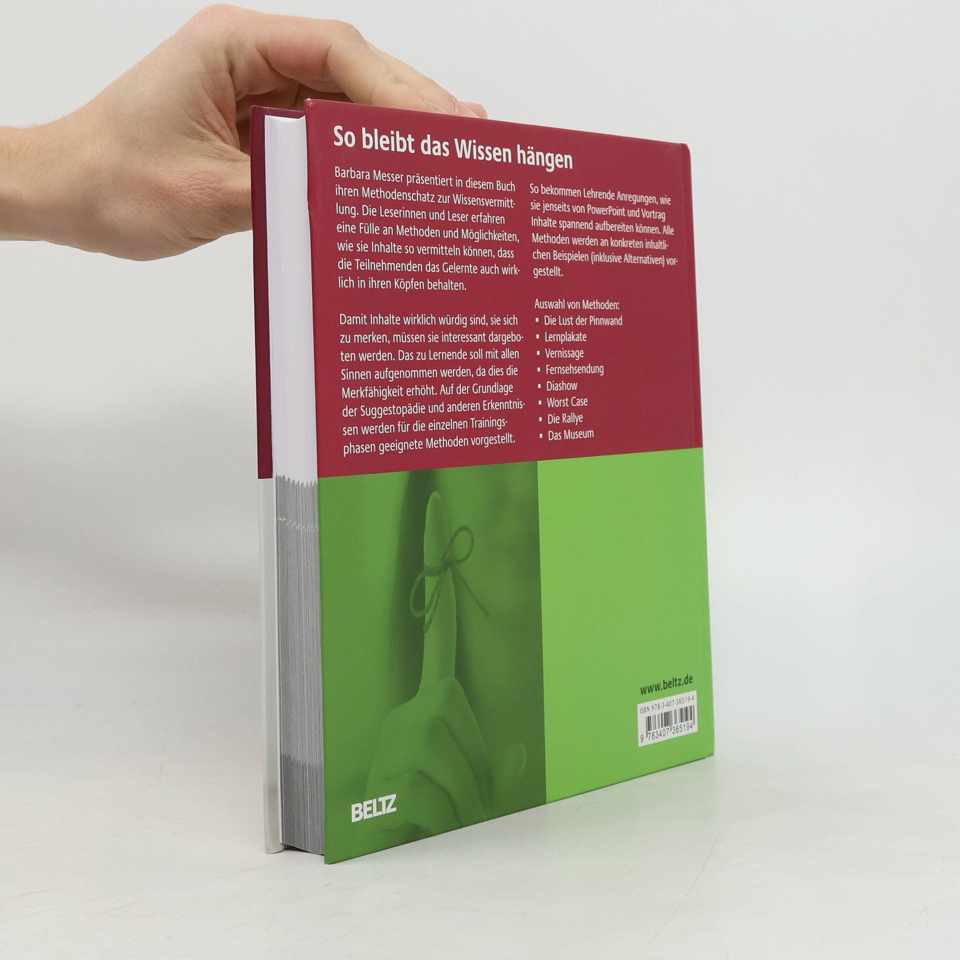 Barbara Messer präsentiert in diesem Buch ihren Methodenschatz zur Wissensvermittlung. Trainerinnen und Trainer erfahren eine Fülle an Methoden und Möglichkeiten, wie sie Inhalte so vermitteln können, dass die Teilnehmenden das Gelernte auch wirklich in ihren Köpfen behalten. Damit Inhalte wirklich würdig sind, sie sich zu merken, müssen sie interessant dargeboten werden. Das zu Lernende soll mit möglichst vielen Sinnen aufgenommen werden, da dies die Merkfähigkeit erhöht. Auf der Grundlage der Suggestopädie und der Gehirnforschung werden für die einzelnen Trainingsphasen geeignete Methoden vorgestellt. So bekommen Trainer Anregungen, wie sie jenseits von PowerPoint und Vortrag Inhalte spannend aufbereiten können. Alle Methoden werden an konkreten inhaltlichen Beispielen (inklusive Alternativen) vorgestellt. Methodenauswahl: Die Lust der Pinnwand Lernplakate Landkarte Vernissage Fernsehsendung Diashow