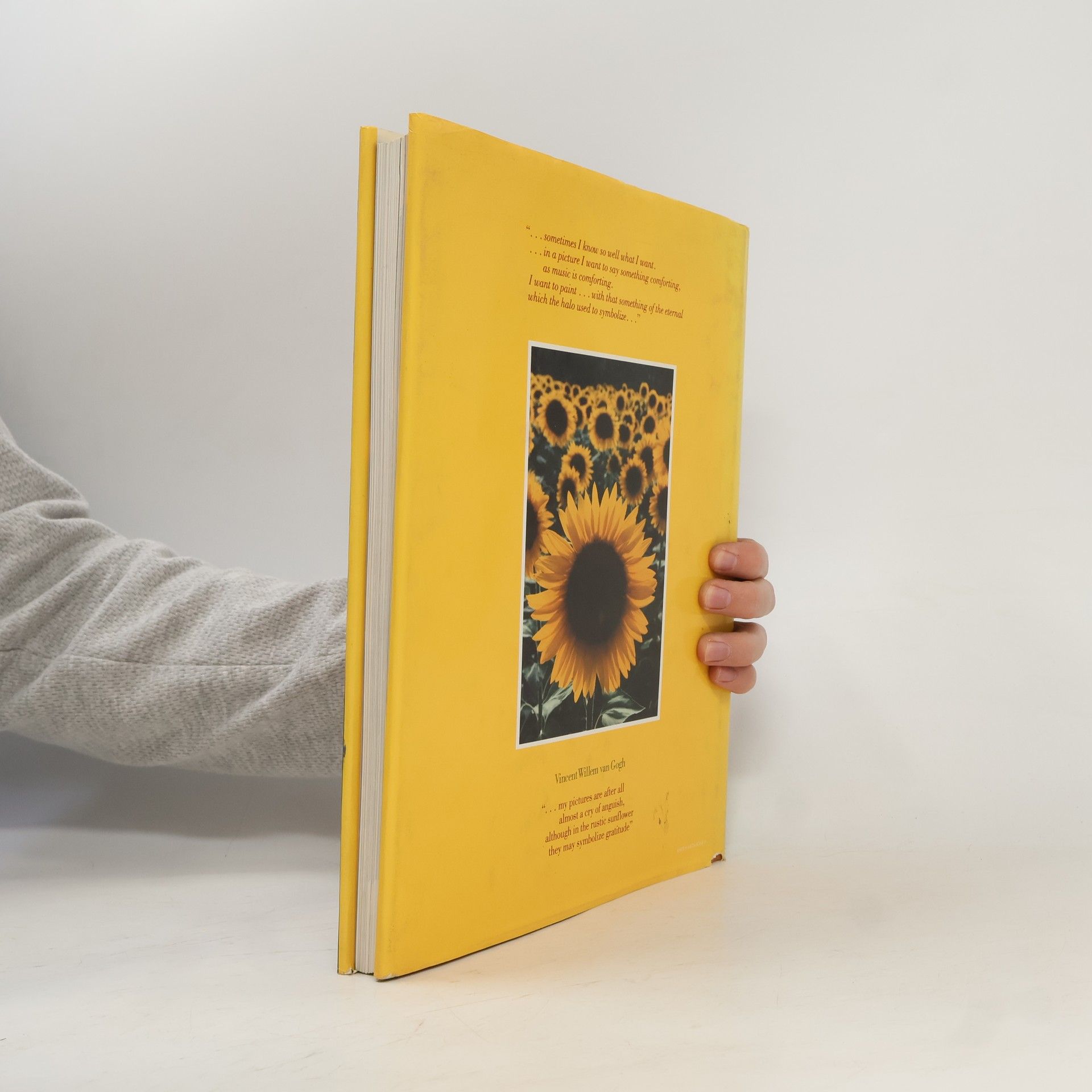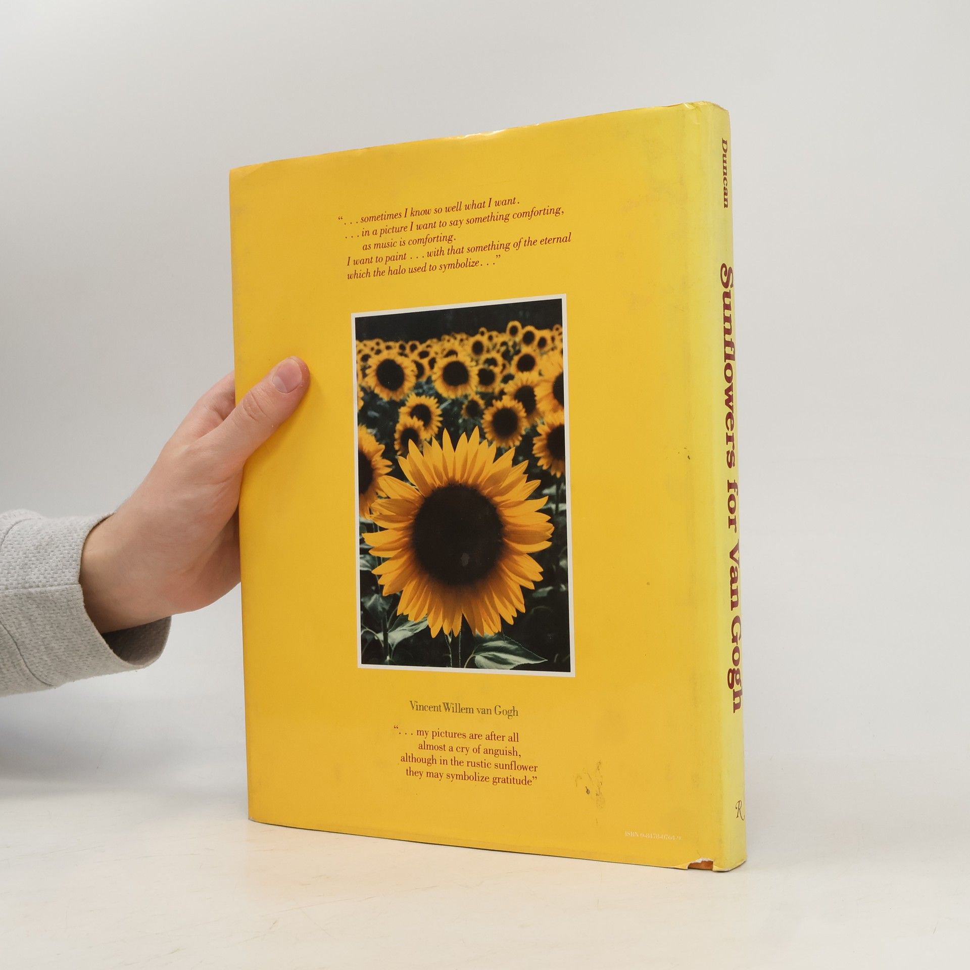 From the front flap of this 149-page "This romantic odyssey through all of Van Gogh's hauntingly beautiful sunflower paintings, and David Douglas Duncan's unknown poetic photography from the sunflower belt of southern France, pays tribute at once to the artist's achievement and the dazzling flower itself. Inspired by Van Gogh's vibrantly painted canvasses, Duncan set out on a journey to capture with color camera the plant that had so intrigued the artist. Scarce in Van Gogh's own time, the sunflower of today grows across Europe in ever-increasing numbers of fields to satisfy the commercial demand for vegetable oil. This vast floral extravaganza vies with the Dutch tulip fields for spectacular beauty and abundance, yet has been ignored until now. With photographs, Duncan reveals his own obsession to document the flower. He sought out the source of Van Gogh's inspiration at Arles, then farther afield, from Provence to the Atlantic. In the eleven known paintings of sunflowers by Van Gogh (reproduced here all together in color for the first time) and Duncan's dramatic pictures, this book celebrates a countryside flower through the eyes of two artists."