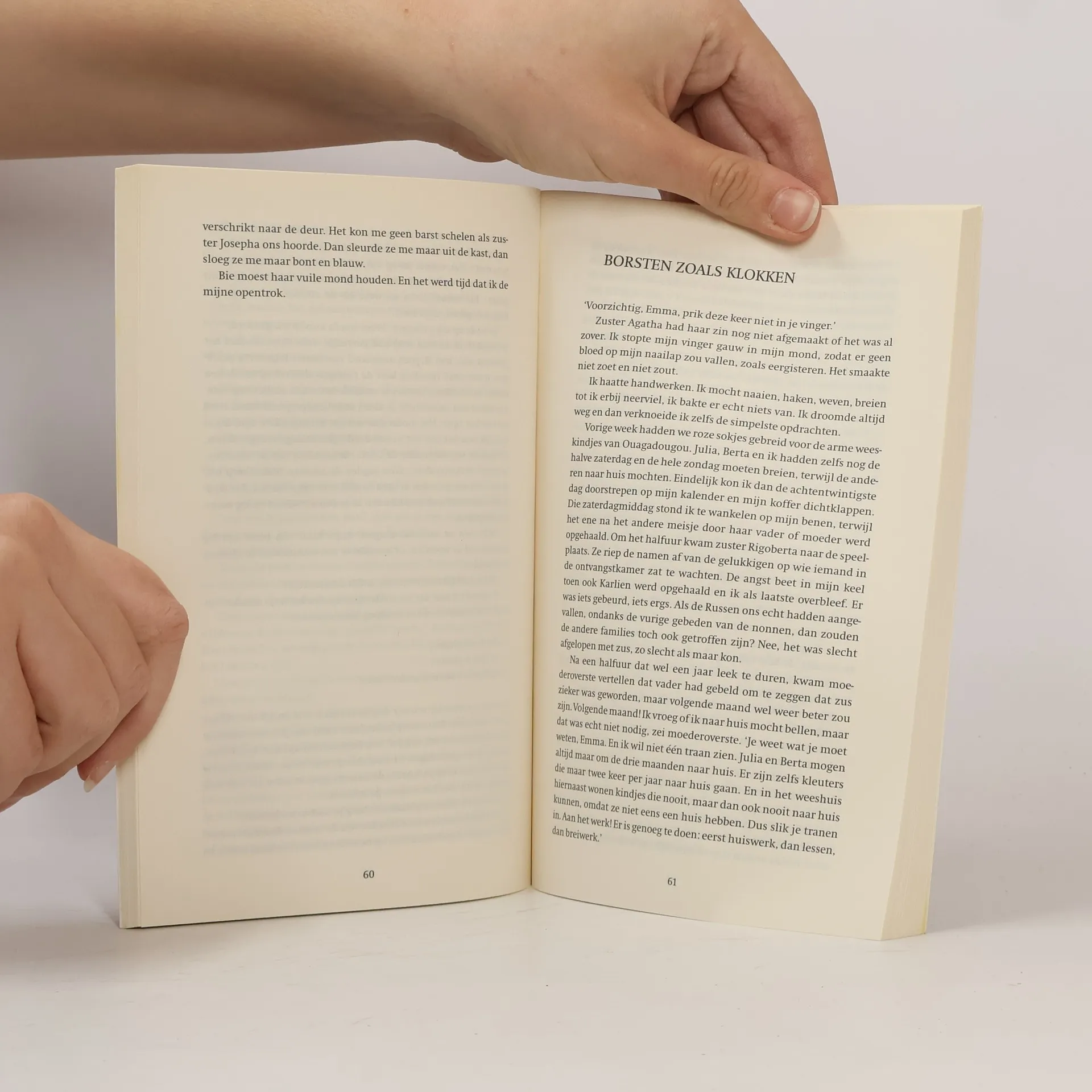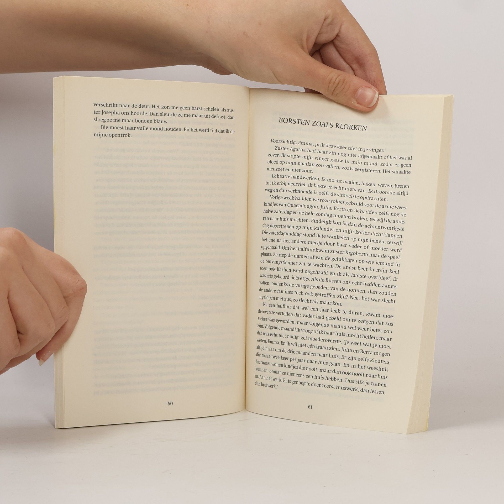 Emma (ca. 12, ik-figuur) moet naar een kostschool nu haar oudere zus ernstig ziek lijkt te zijn. De nonnen vertellen haar precies wat goed en slecht is, maar de meisjes overspoelen haar met andere verhalen. Vanaf ca. 12 jaar.