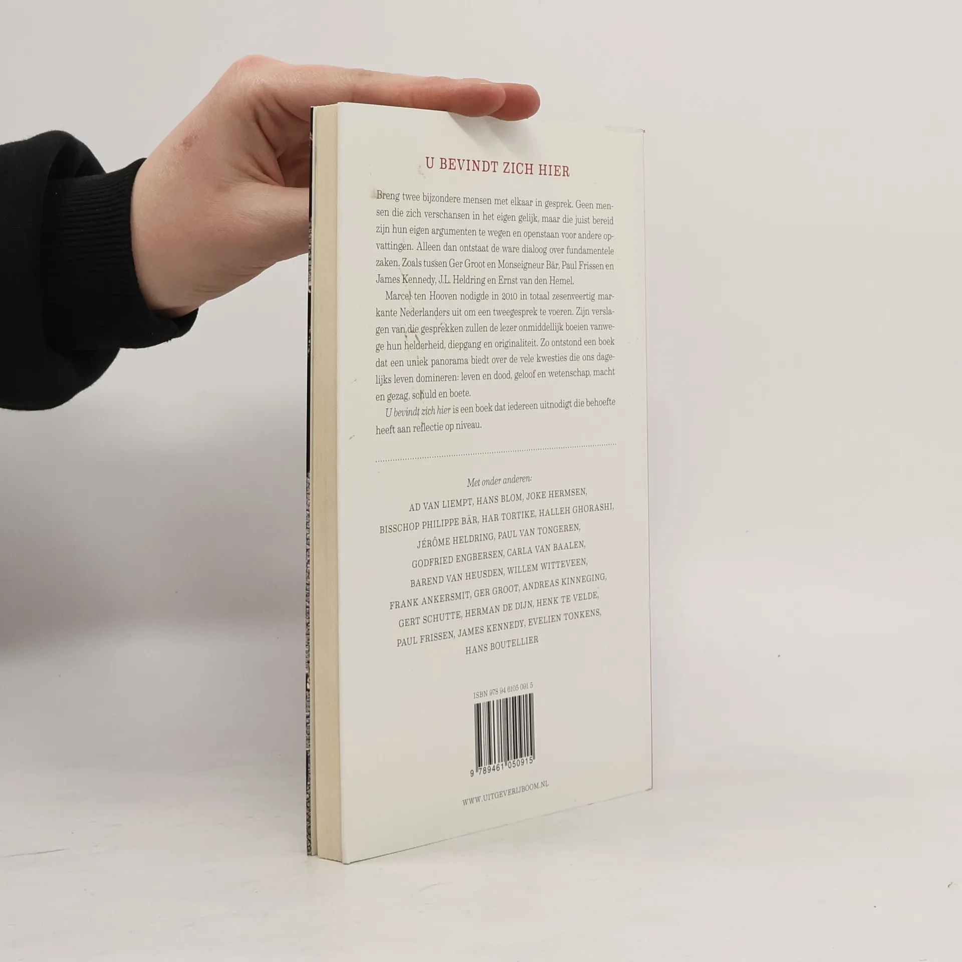 Kies twee bijzondere mensen uit en breng ze met elkaar in gesprek. Laat ze niet discussiëren of elkaars standpunten bestrijden, maar vraag ze om een dialoog te voeren. Een echt gesprek over fundamentele zaken. Zoals tussen Ger Groot en Monseigneur Bär, Paul Frissen en James Kennedy, J.L. Heldring en Ernst van den Hemel. Marcel ten Hooven nodigde in 2010 in totaal veertig markante Nederlanders uit om een tweegesprek te voeren. Van die gesprekken maakte hij formidabel geschreven verslagen, die de lezer onmiddellijk boeien vanwege hun helderheid, diepgang en originaliteit. Zo ontstond een prachtig boek, dat een uniek panorama biedt over de vele kwesties die ons dagelijks leven domineren: leven en dood, geloof of wetenschap, macht en gezag, schuld en boete. "U bevindt zich hier" is een boek dat iedereen uitnodigt die behoefte heeft aan reflectie op niveau.