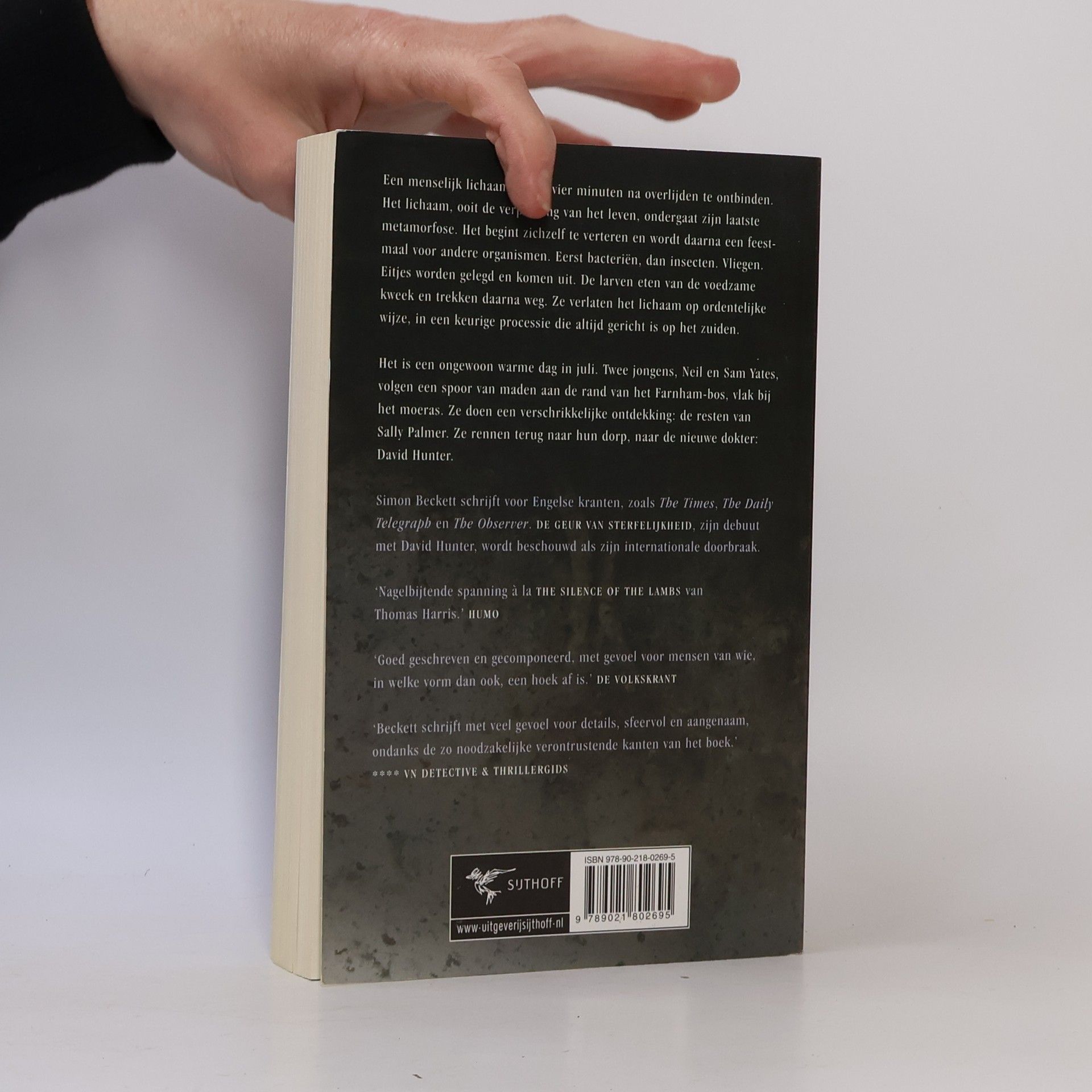 Tegen de tijd dat je dit gruwelijk spannende boek uit hebt ben je zo blij dat het een verzonnen verhaal is… Een menselijk lichaam begint vier minuten na overlijden te ontbinden. Het lichaam, ooit de verpakking van het leven, ondergaat zijn laatste metamorfose. Het begint zichzelf te verteren, en wordt daarna een roerloos feestmaal voor andere organismen. Eerst bacteriën, dan insecten. Vliegen. Eitjes worden gelegd en komen uit. De larven eten van de voedzame kweek en trekken daarna weg. Ze verlaten het lichaam op ordentelijke wijze, elkaar volgend in een keurige processie die altijd gericht is op het zuiden. Het is een ongewoon warme dag in juli. Twee jongens, Neil en Sam Yates, volgen een spoor van maden aan de rand van het Farnley-bos, vlak bij het moeras. Ze doen een verschrikkelijke ontdekking: de resten van Sally Palmer. Ze rennen terug naar hun dorp, naar de nieuwe dokter: David Hunter.