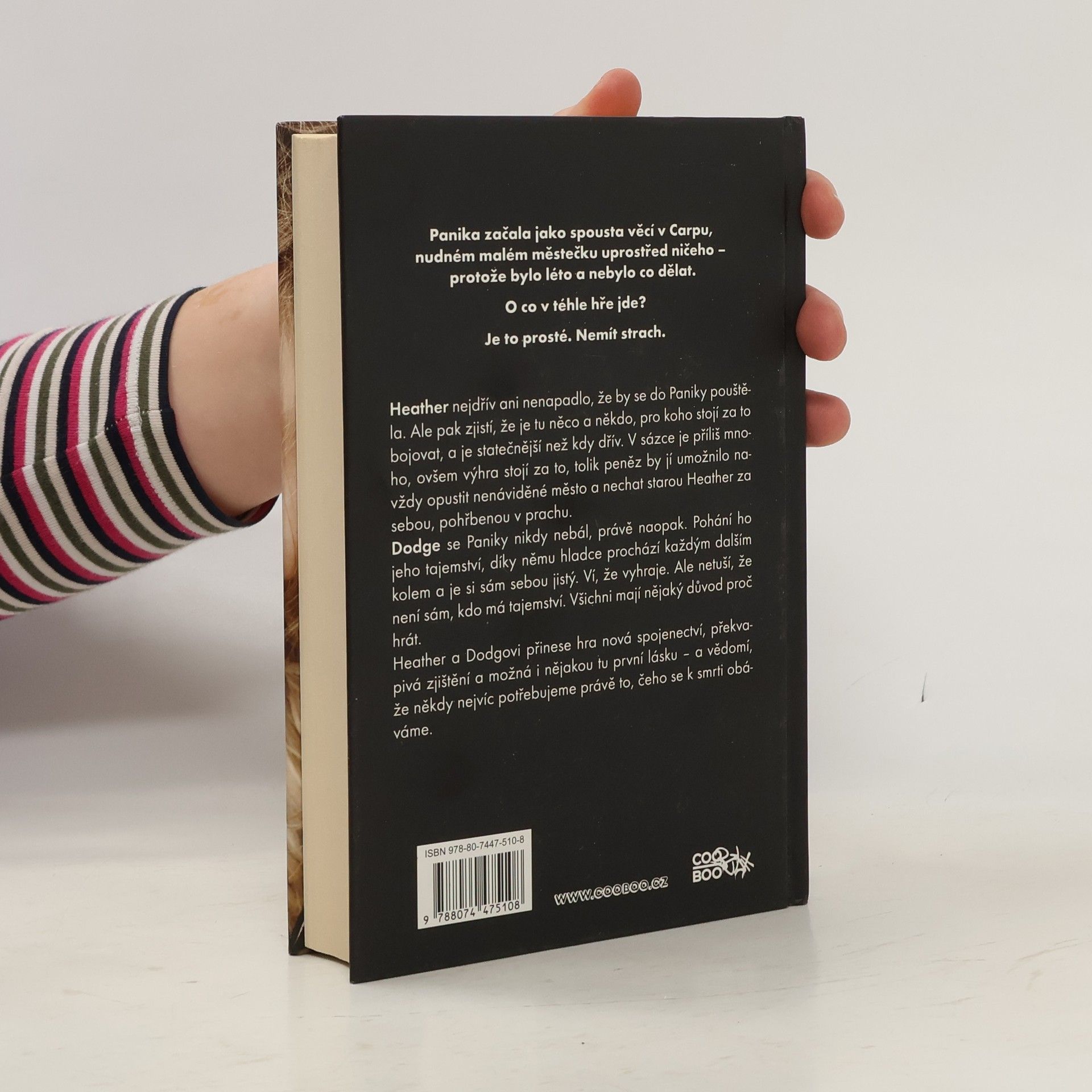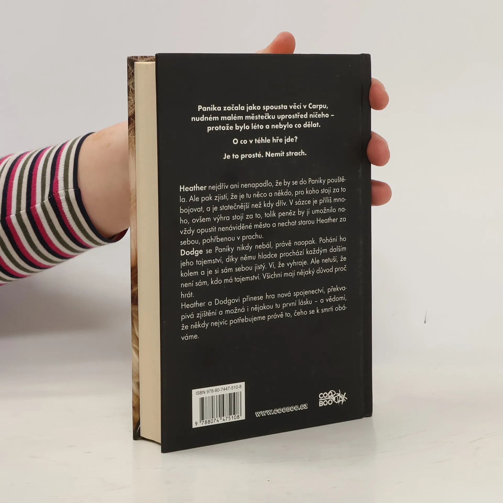 Panika začala jako spousta věcí v Carpu, nudném malém městečku uprostřed ničeho – protože bylo léto a nebylo co dělat. O co v téhle hře jde? Je to prosté. Nemít strach. Heather nejdřív ani nenapadlo, že by se do Paniky pouštěla. Nikdy by si nepomyslela, že je nebojácná a že by chtěla vyčnívat. Ale pak zjistí, že je tu něco a někdo, pro koho stojí za to bojovat, a je statečnější než kdy dřív. V sázce je příliš mnoho, ovšem výhra stojí za to, tolik peněz by jí umožnilo navždy opustit nenáviděné město a nechat starou Heather za sebou, pohřbenou v prachu. Dodge se Paniky nikdy nebál, právě naopak. Pohání ho jeho tajemství, díky němu hladce prochází každým dalším kolem a je si sám sebou jistý. Ví, že vyhraje. Ale netuší, že není sám, kdo má tajemství. Všichni mají nějaký důvod proč hrát. Heather a Dodgovi přinese hra nová spojenectví, překvapivá zjištění a možná i nějakou tu první lásku – a vědomí, že někdy nejvíc potřebujeme právě to, čeho se k smrti obáváme.