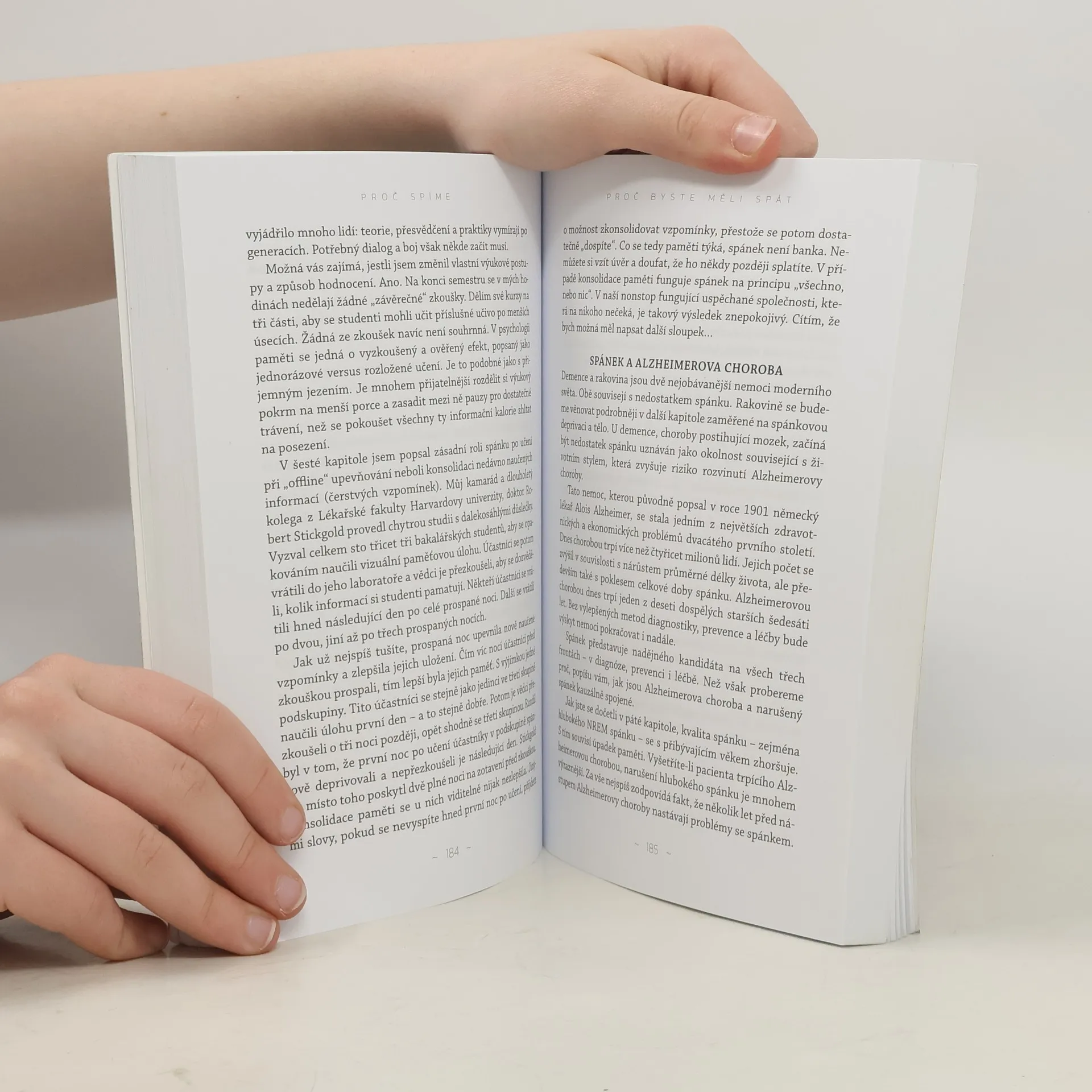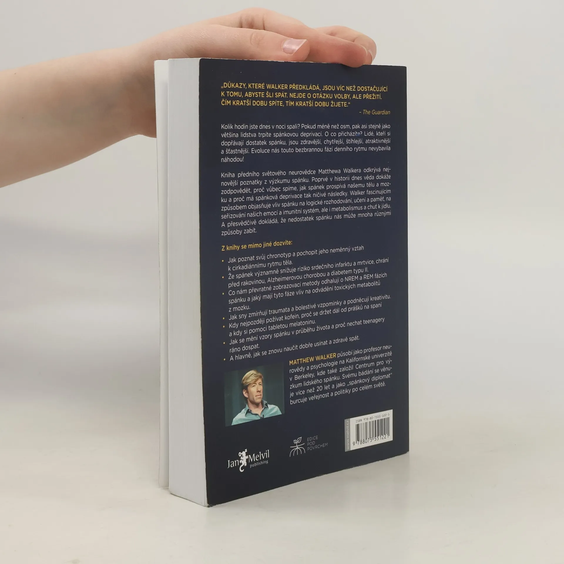 Kolik hodin jste dnes v noci spali? Pokud méně než osm, pak asi stejně jako většina lidstva trpíte spánkovou deprivací. O co přicházíte? Lidé, kteří si dopřávají dostatek spánku, jsou zdravější, chytřejší, štíhlejší, atraktivnější a šťastnější. Evoluce nás touto bezbrannou fází denního rytmu nevybavila náhodou! Kniha předního světového neurovědce Matthewa Walkera odkrývá nejnovější poznatky z výzkumu spánku. Poprvé v historii dnes věda dokáže zodpovědět, proč vůbec spíme, jak spánek prospívá našemu tělu a mozku a proč má spánková deprivace tak ničivé následky. Walker fascinujícím způsobem objasňuje vliv spánku na logické rozhodování, učení a paměť, na seřizování našich emocí a imunitní systém, ale i metabolismus a chuť k jídlu. A přesvědčivě dokládá, že nedostatek spánku nás může mnoha různými způsoby zabít.