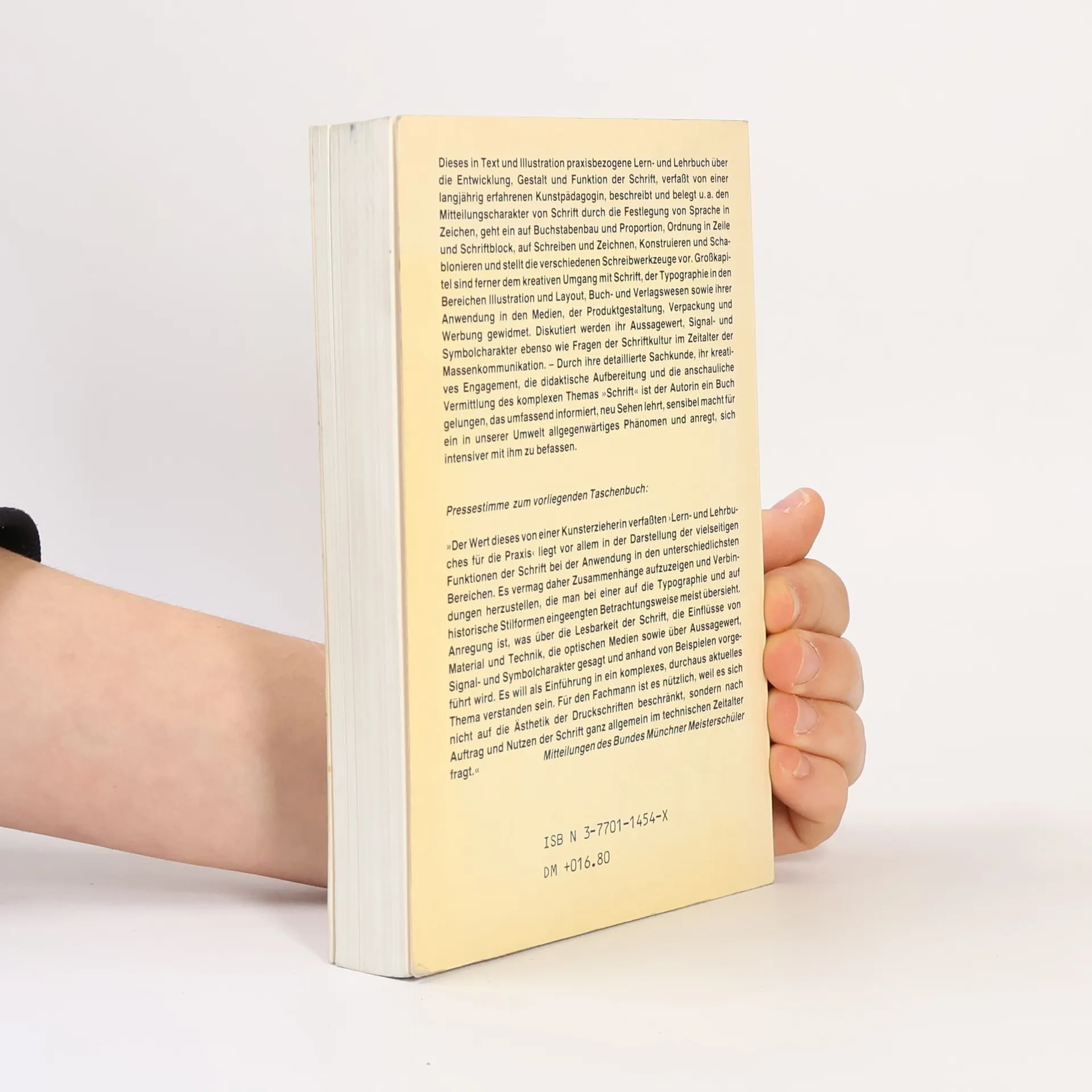 Dieses in Text und Illustration praxisbezogene Lern-und Lehrbuch über die Entwicklung, Gestalt und Funktion der Schrift, verfasst von einer langjährig erfahrenen Kunstpädagogin, beschreibt und belegt u. a. den Mitteilungscharakter von Schrift durch die Festlegung von Sprache in Zeichen, geht ein auf Buchstabenbau und Proportion, Ordnung in Zeile und Schriftblock, auf Schreiben und Zeichnen, Konstruieren und Schablonieren und stellt die verschiedenen Schreibwerkzeuge vor.