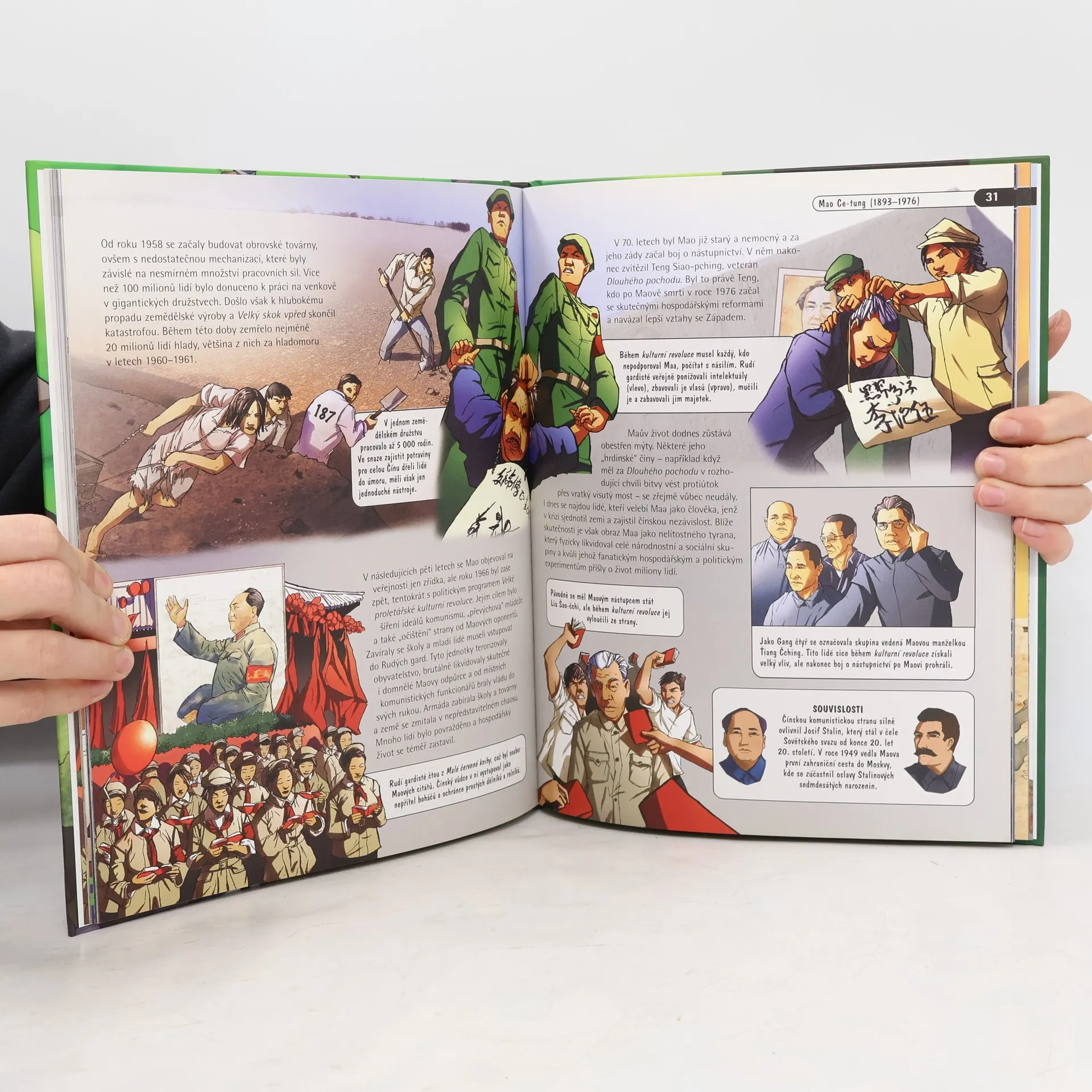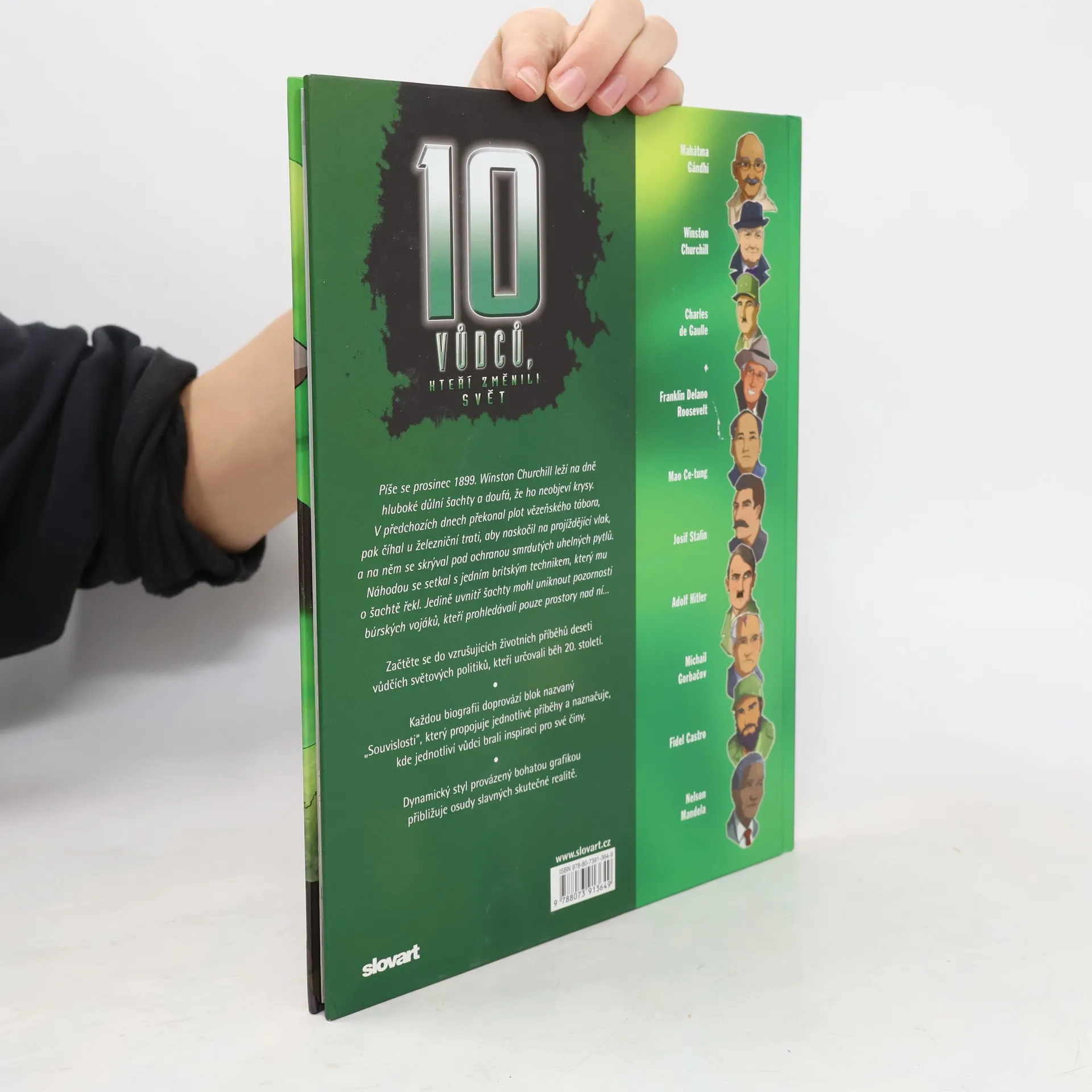 Fascinující příběhy vůdců využívají postupů „grafického románu“, mají rychlý spád a poutavou úpravu. Portréty politiků nadaných železnou vůlí, kteří vedli své národy v dobách válek, revolucí i hospodářských krizí, čtenáře zcela pohltí. Činy těchto osob vyústily někdy v triumf, jindy v katastrofu. Představeno nám je detailně 10 vůdců: Winston Churchill, Mahátma Gándhí, Josif Stalin, Fidel Castro, Adolf Hitler, Michail Gorbačov, Mao Ce-tung, Franklin Delano Roosevelt, Charles de Gaulle, Nelson Mandela. Závěrečná kapitola navíc stručněji vypráví ještě o dalších vůdcích.