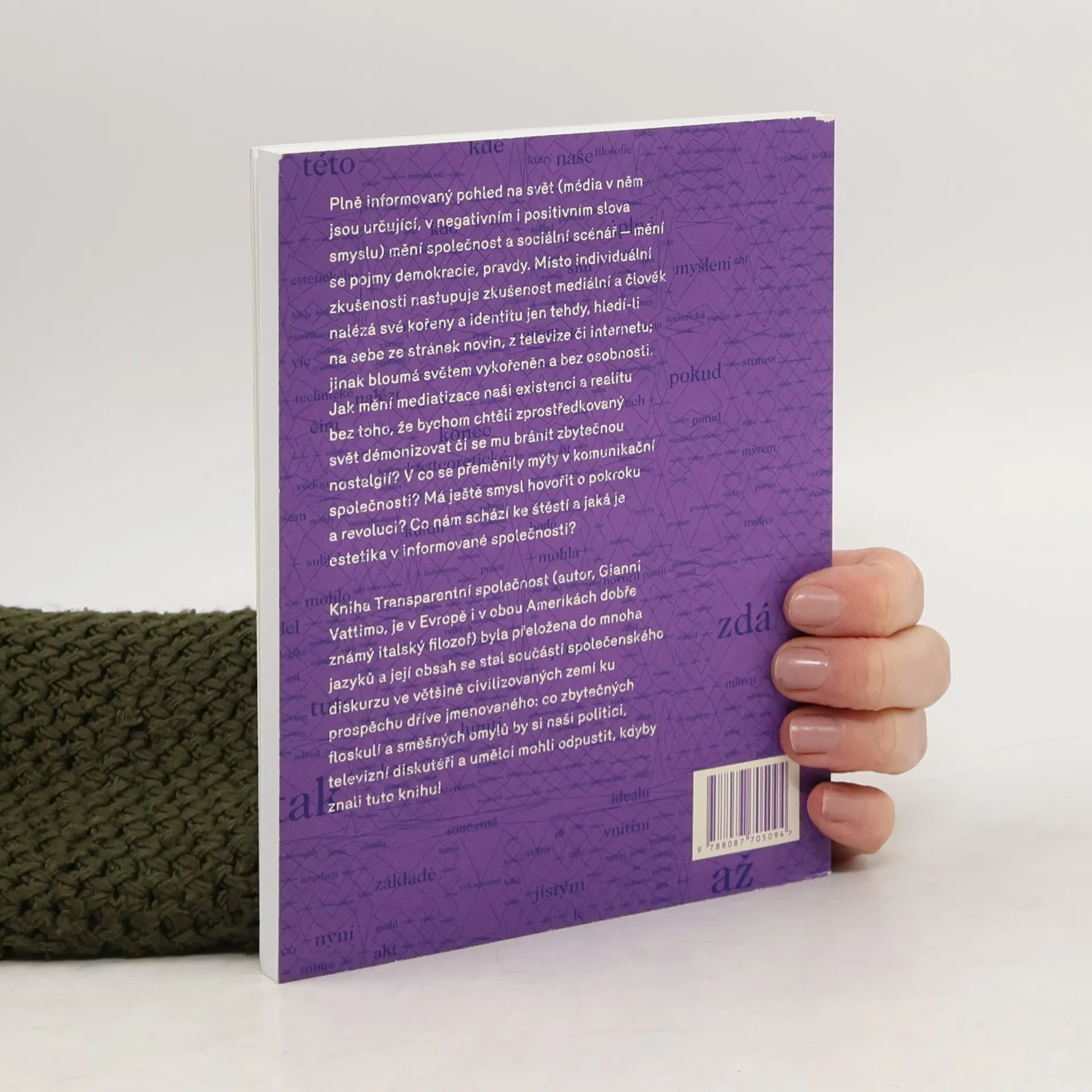 Plně informovaný pohled na svět (média v něm jsou určující, v negativním i positivním slova smyslu) mění společnost a sociální scénář - mění se pojmy demokracie, pravdy. Místo individuální zkušenosti nastupuje zkušenost mediální a člověk nalézá své kořeny a identitu jen tehdy, hledí-li na sebe ze stránek novin, z televize či internetu; jinak bloumá světem vykořeněn a bez osobnosti. Jak mění mediatizace naší existenci a realitu bez toho, že bychom chtěli zprostředkovaný svět démonizovat či se mu bránit zbytečnou nostalgii? V co se přeměnily mýty v komunikační společnosti? Má ještě smysl hovořit o pokroku a revoluci? Co nám schází ke štěstí a jaká je estetika v informované společnosti? Kniha Transparentní společnost (autor, Gianni Vattimo, je v Evropě i v obou Amerikách dobře známý italský filozof) byla přeložena do mnoha jazyků a její obsah se stal součástí společenského diskurzu ve většině civilizovaných zemí ku prospěchu dříve jmenovaného: co zbytečných floskulí a směšných omylů by si naši politici, televizní diskutéři a umělci mohli odpustit, kdyby znali tuto knihu!