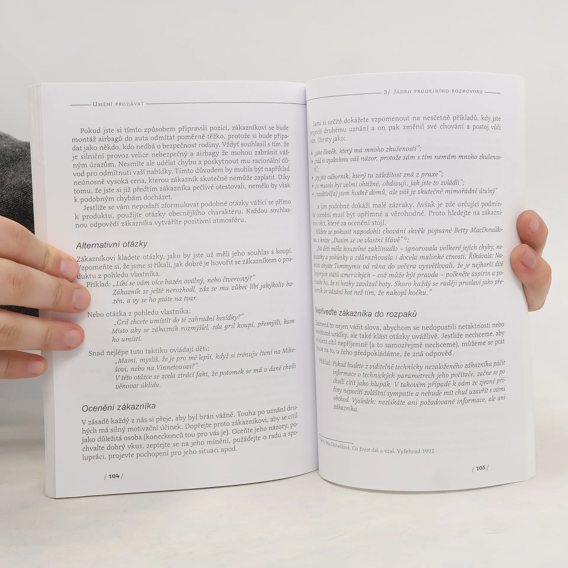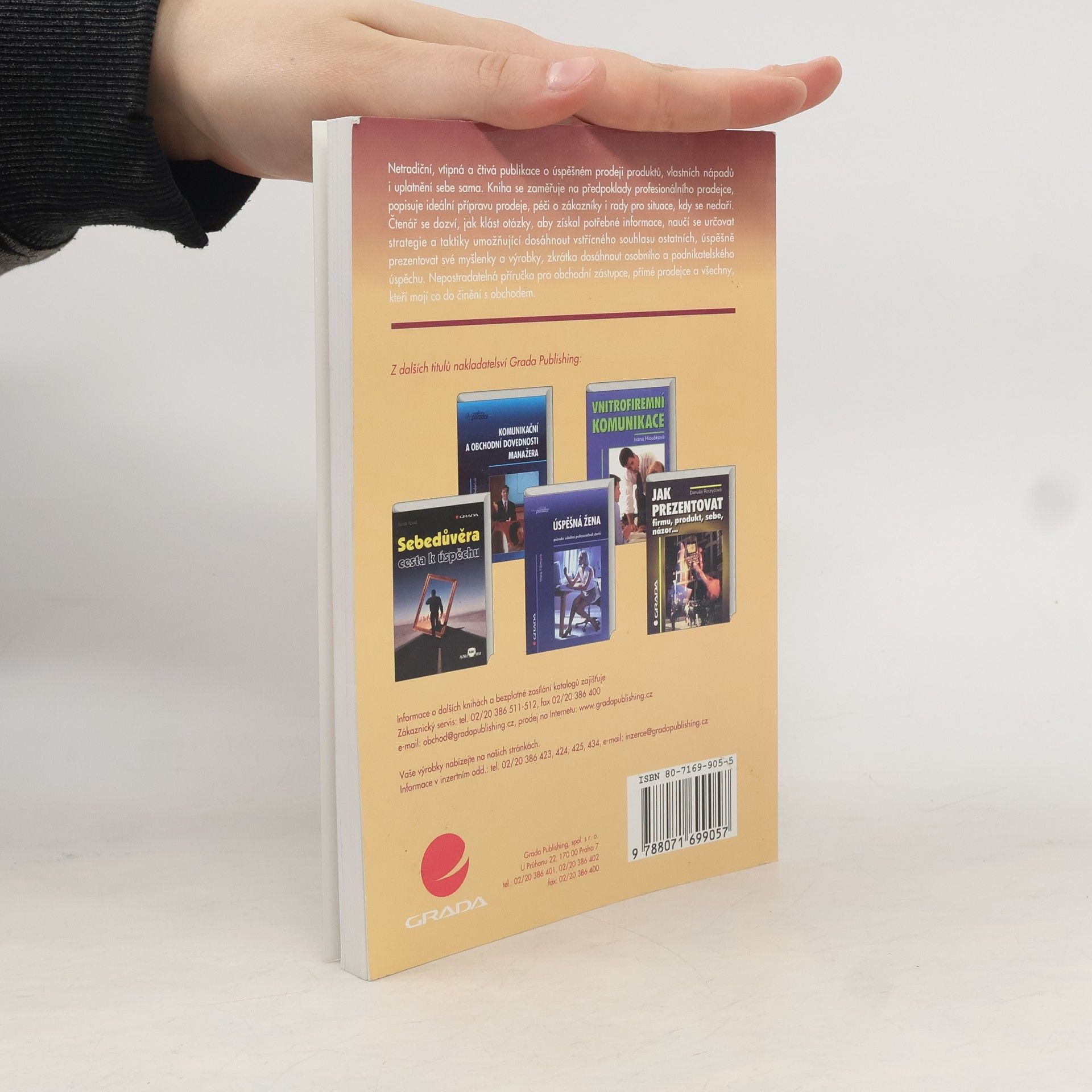 Kniha vám přiblíží samotný proces prodeje a jeho přípravu a lidi, kteří se tohoto procesu účastní: prodejce a zákazníky. Naučí vás používat různé strategie a taktiky při prodeji tak, abyste byli schopni vybrat tu nejvhodnější pro jednání s konkrétním zákazníkem a dosáhli při jednání svých cílů. Dozvíte se, jak reagovat na problematické zákazníky, jak efektivně čelit aroganci a agresivitě při vyjednávání. Poznáte také, jak vůbec zjistit, co je vhodné zákazníkům nabízet a jakým způsobem, tak aby výsledkem byla spokojenost na straně zákazníka i prodejce. Kromě toho autorka nabízí i tipy, jak lépe prezentovat nabízené produkty, svoji práci i jak svou práci lépe řídit. Díky testům a úlohám zaměřeným na sebepoznání se zároveň dozvíte i něco o sobě a svých schopnostech. Knížku určitě ocení nejen všichni ti, kteří mají co do činění s obchodem, ale užitečně rady a tipy v ní najde každý, kdo někomu něco nabízí - svoje nápady, svoji práci, svoje schopnosti a dovednosti.