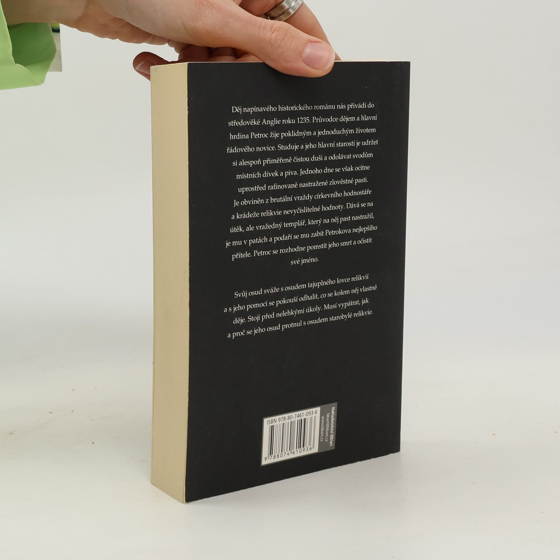 Příběh plný nečekaných zvratů se odehrává ve 13. století. Mladý mnich Petroc se krádeží vzácné relikvie zaplete do ďábelských plánů zrůdného templářského rytíře. Aby si zachránil život, putuje pašeráckou lodí po celé Evropě od Grónska přes Francii, až po Řecko. Než dojde ke konečnému zúčtování, našemu hrdinovi se podaří získat i lásku krásné princezny. Děj napínavé románové prvotiny nás přivádí do středověké Anglie roku 1235. Průvodce dějem a hlavní hrdina se jmenuje Petroc a žije poklidným a jednoduchým životem řádového novice. Studuje a jeho hlavní starostí je udržet si alespoň přiměřeně čistou duši a odolávat svodům místních dívek a piva. Jednoho dne se však ocitne uprostřed rafinovaně nastražené zlověstné pasti. Je obviněn z brutální vraždy církevního hodnostáře a krádeže relikvie nevyčíslitelné hodnoty. Dává se na útěk, ale vražedný templář, který na něj past nastražil, je mu v patách a podaří se mu zabít Petrocova nejlepšího přítele. Petroc se rozhodne pomstít jeho smrt a očistit své jméno. Svůj osud sváže s osudem tajuplného lovce relikvií a s jeho pomocí se pokouší odhalit, co se kolem něj vlastně děje. Stojí před nelehkými úkoly. Musí vypátrat, jak a proč se jeho osud protnul s osudem starobylé relikvie a musí pomstít smrt přítele. Současně se musí vyhýbat nástrahám lásky, která přichází v podobě překrásné řecké princezny.