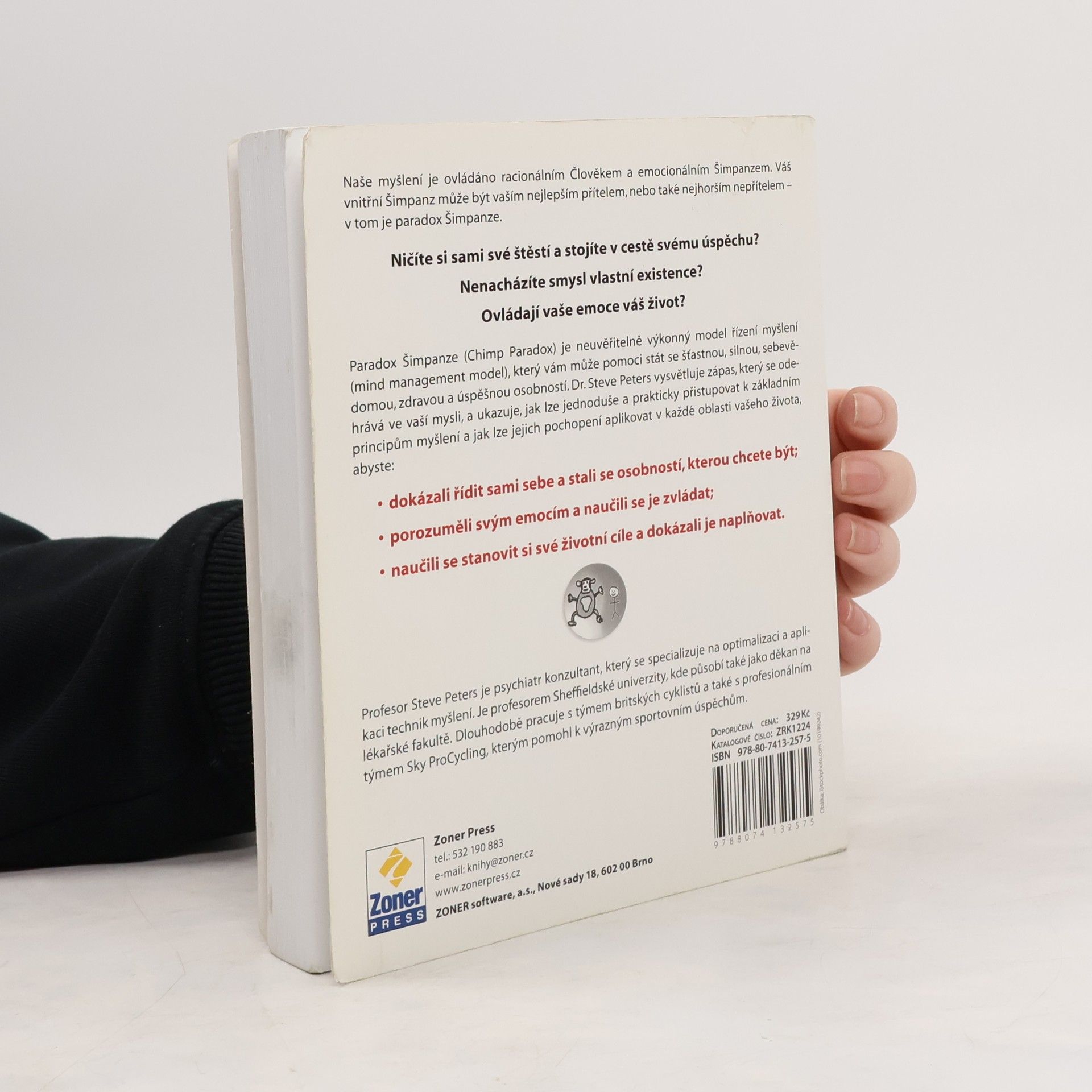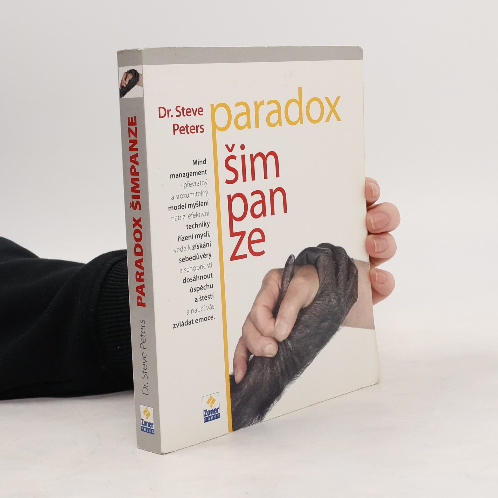 Lidskou mysl ovládají racionální Člověk a emocionální Šimpanz, který může být vaším nejlepším přítelem nebo nejhorším nepřítelem. Existuje mnoho příruček, které radí, jak se stát dokonalým člověkem a zbavit se různých nectností, avšak efekt je často sporadický. Problém spočívá v tom, že tyto knihy poskytují pouze návody, ale skutečně účinné změny vyžadují pochopení nejen JAK, ale i PROČ. Britský psychiatr prof. Steve Peters vyvinul srozumitelný model lidského myšlení, nazvaný Paradox Šimpanze. Tento model zahrnuje tři centra: logického Člověka, emocionálního Šimpanze a Počítač, který uchovává naše zkušenosti. Naše myšlení a jednání odpovídají buď Člověku, nebo Šimpanzi. Rychlý Šimpanz reaguje okamžitě, ale ne vždy adekvátně, což může vést k pozdějším výčitkám. Také brání rozhodování v důležitých situacích, zatímco jinde jedná bez rozmýšlení. Kniha prof. Peterse nabízí nový pohled na fungování lidské mysli a ukazuje, jak zvládnout svého Šimpanze, aby nepřevzal moc. Petersův model přispěl k úspěchům britských cyklistů na olympiádě a pomohl snookerové hvězdě Ronnie O’Sullivanovi k návratu na světový trůn.