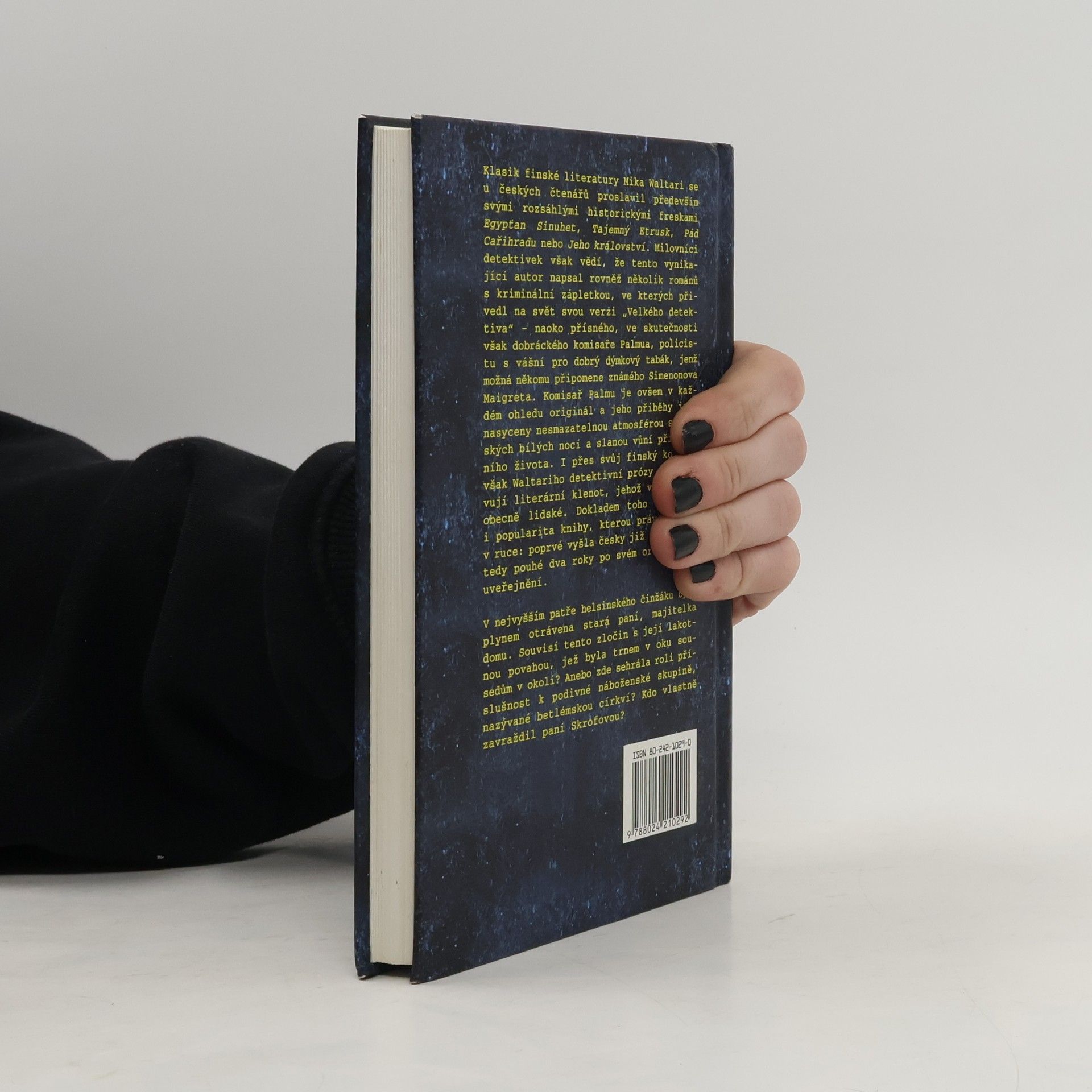 Klasik finské literatury Mika Waltari se u českých čtenářů proslavil především svými rozsáhlými historickými freskami Egypťan Sinuhet, Tajemný Etrusk, Pád Cařihradu nebo Jeho království. Milovníci detektivek však vědí, že tento vynikající autor napsal rovněž několik románů s kriminální zápletkou, ve kterých přivedl na svět svou verzi „Velkého Detektiva“ – dobráckého, i když naoko přísného komisaře Palmua, policistu s vášní pro dobrý dýmkový tabák, jenž možná někomu připomene Simenonova Maigreta. Komisař Palmu je ovšem v každém ohledu originál a jeho příběhy jsou nasyceny nesmazatelnou atmosférou severských bílých nocí a slanou vůní přístavního života. I přes svůj finské kolorit však Waltariho detektivní prózy představují literární klenot, jehož vyznění je obecně lidské. Dokladem toho může být i popularita knihy, kterou právě držíte v ruce: poprvé vyšla česky již roku 1941, tedy pouhé dva roky po svém originálním uveřejnění. V nejvyšším patře helsinského činžáku byla plynem otrávena stará paní, majitelka domu. Souvisí tento zločin s její lakotnou povahou, jež byla trnem v oku sousedům v okolí? Anebo zde sehrála roli příslušnost k podivné náboženské skupině, nazývané betlémskou církví? Kdo vlastně zavraždil paní Skrofovou?