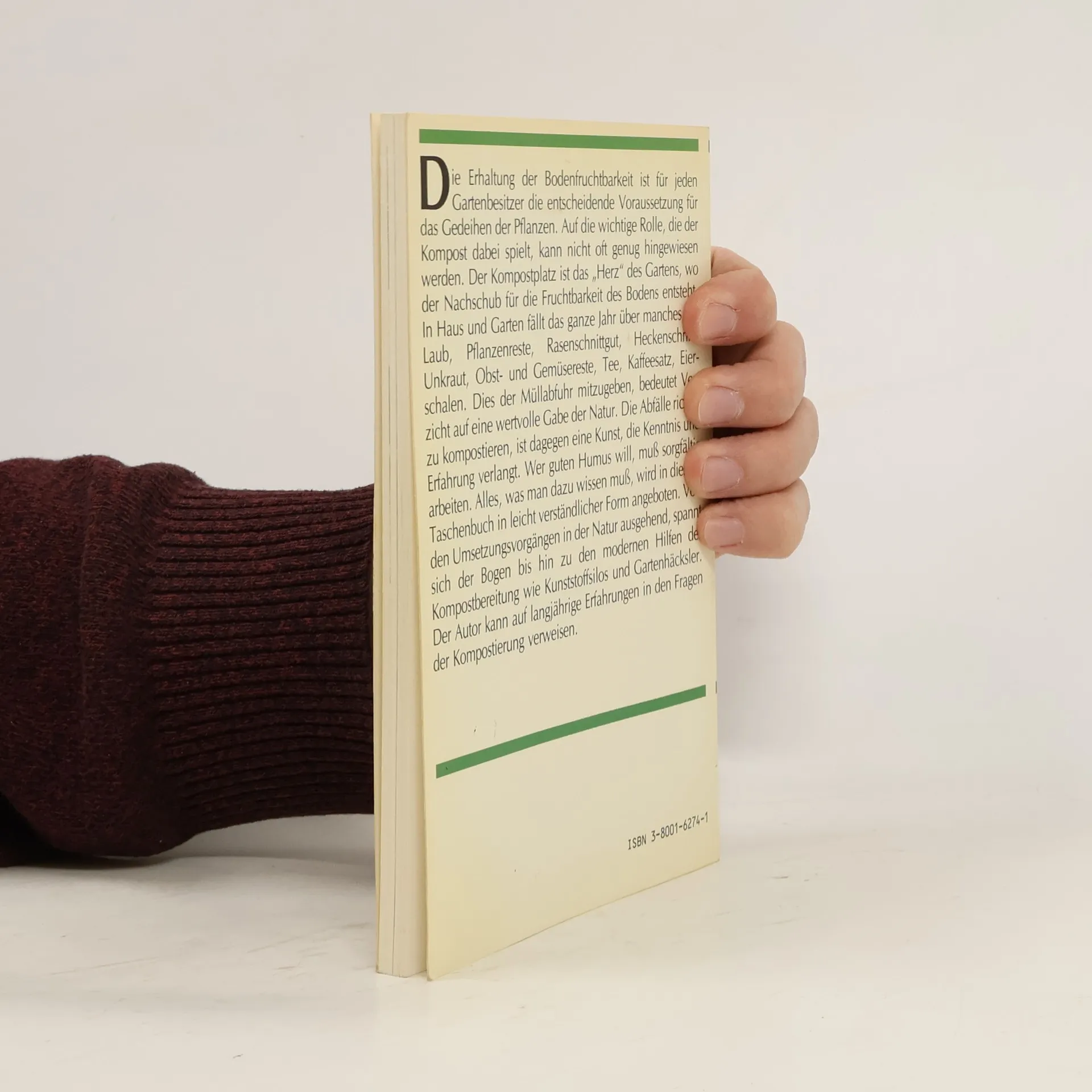Dieses Buch behandelt die Kompost- und Erdbereitung, von der Planung und Anlage zum eigenen Kompostplatz, von den biologischen Vorgänge in Kompost und Boden, von Pflege und Geräte bis hin zur Anwendung des Kompostes im Garten. Das Buch ist mit vielen Fotos illustriert und zeigt sehr detailliert Schritt für Schritt zum guten Kompost.