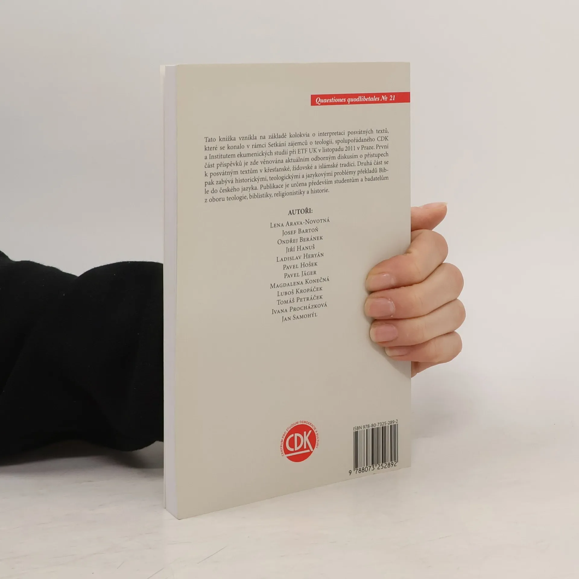 Čtení, překlad a výklad posvátných textů v křesťanství, židovství a islámu. Tato knížka vznikla na základě kolokvia o interpretaci posvátných textů, které se konalo v rámci Setkání zájemců o teologii, spolupořádaného CDK a Institutem ekumenických studií při ETF UK v listopadu 2011 v Praze. První část příspěvků je zde věnována aktuálním odborným diskusím o přístupech k posvátným textům v křesťanské, židovské a islámské tradici. Druhá část se pak zabývá historickými, teologickými a jazykovými problémy překladů Bible do českého jazyka. Publikace je určena především studentům a badatelům z oboru teologie, biblistiky, religionistiky a historie.