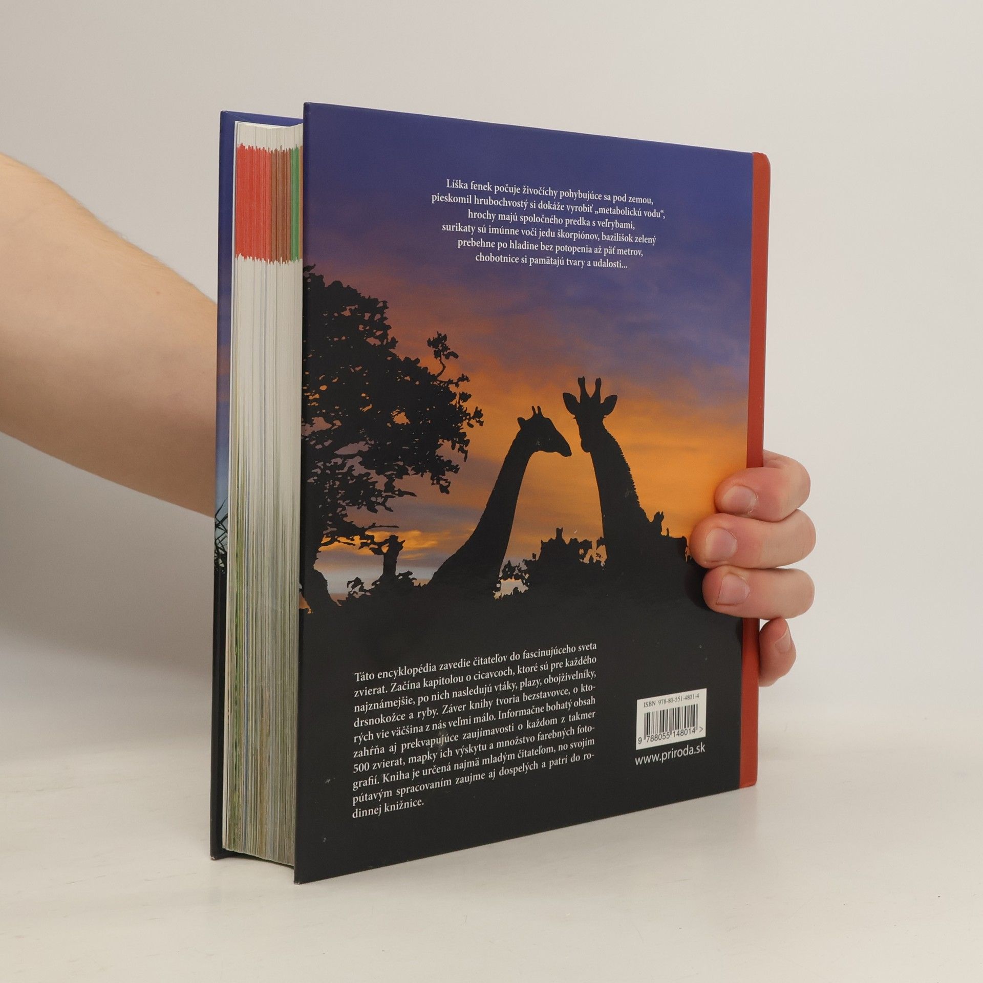 Hrochy majú spoločného predka s veľrybami, surikaty sú imúnne voči jedu škorpiónov, chobotnice si pamätajú tvary a udalosti... Encyklopédia zavedie čitateľov do fascinujúceho sveta zvierat. Začína kapitolou o cicavcoch, ktoré sú pre každého najznámejšie, po nich nasledujú vtáky, plazy, obojživelníky, drsnokožce, ryby a na záver bezstavovce. Informačne bohatý obsah zahŕňa aj prekvapujúce zaujímavosti o každom z takmer 500 zvierat, mapky ich výskytu a množstvo farebných fotografií. Kniha je určená najmä mladým čitateľom, no svojím pútavým spracovaním zaujme aj dospelých a patrí do rodinnej knižnice.
