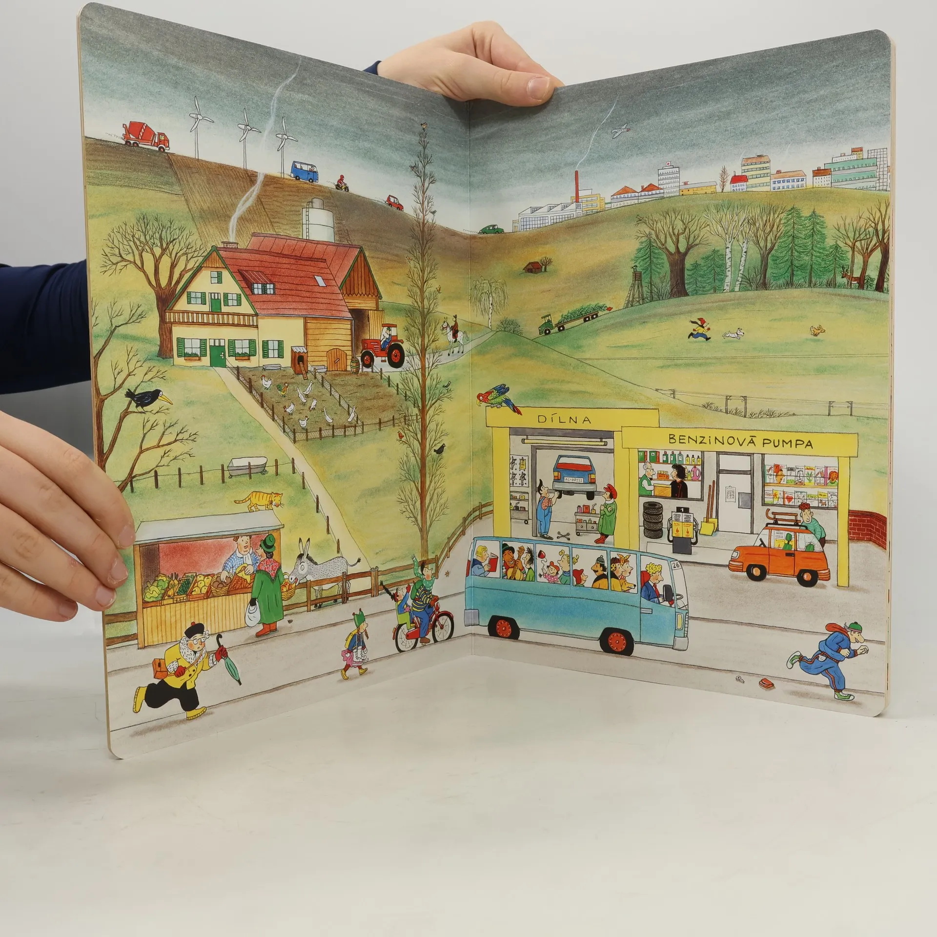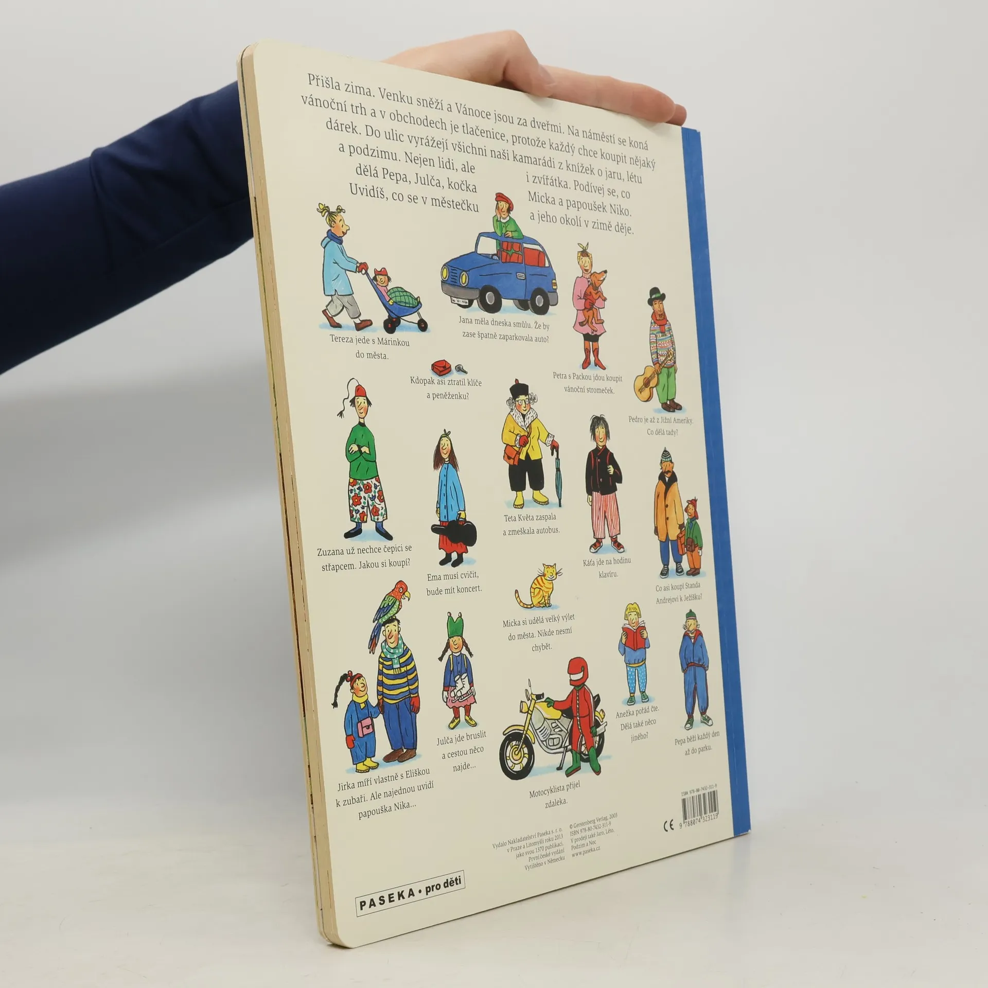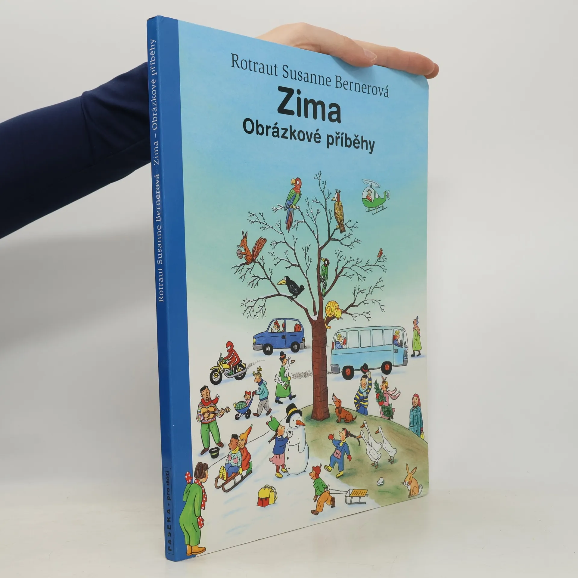Po knížce o jaru, létu a podzimu přichází Zima. Rotraut Suzanne Bernerová na obrázcích znovu vypráví své malé, vtipné příběhy všedního dne, které poutají a bystří pozornost, podněcují fantazii a řečové schopnosti, ale hlavně baví malé i větší děti. V předvánoční atmosféře se opět setkáte s některými starými známými a kamarády z předchozích tří úspěšných knížek. Přibudou další postavy, věci a zvířátka. Jen místo zůstává stejné: město s ulicemi, domy, s tržištěm, obchody, k tomu park a nedaleký statek. Podívejte se, co všechno se v Zimě děje!