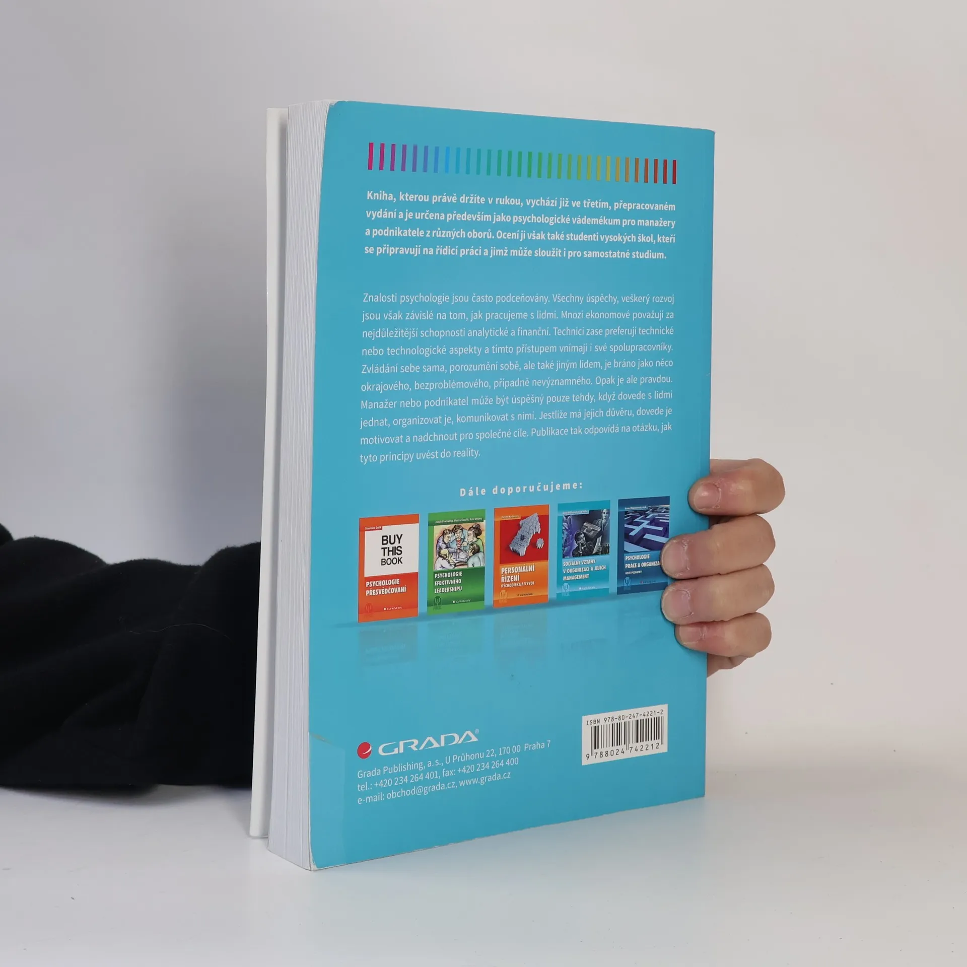 Kniha vychází již ve třetím, upraveném vydání a je určena především jako psychologické vádemékum pro manažery a podnikatele z různých oborů. Ocení ji však také studenti vysokých škol, kteří se připravují na řídicí práci a jimž může sloužit i pro samostatné studium. Znalosti psychologie jsou často podceňovány. Všechny úspěchy, veškerý rozvoj jsou však závislé na tom, jak pracujeme s lidmi. Mnozí ekonomové považují za nejdůležitější schopnosti analytické a finanční. Technici zase preferují technické nebo technologické aspekty a tímto přístupem vnímají i své spolupracovníky. Zvládání sebe sama, porozumění sobě, ale také jiným lidem, je bráno jako něco okrajového, bezproblémového, případně nevýznamného. Opak je ale pravdou. Manažer nebo podnikatel může být úspěšný pouze tehdy, když dovede s lidmi jednat, organizovat je, komunikovat s nimi. Jestliže má jejich důvěru, dovede je motivovat a nadchnout pro společné cíle. Publikace tak odpovídá na otázku, jak tyto principy uvést do reality.