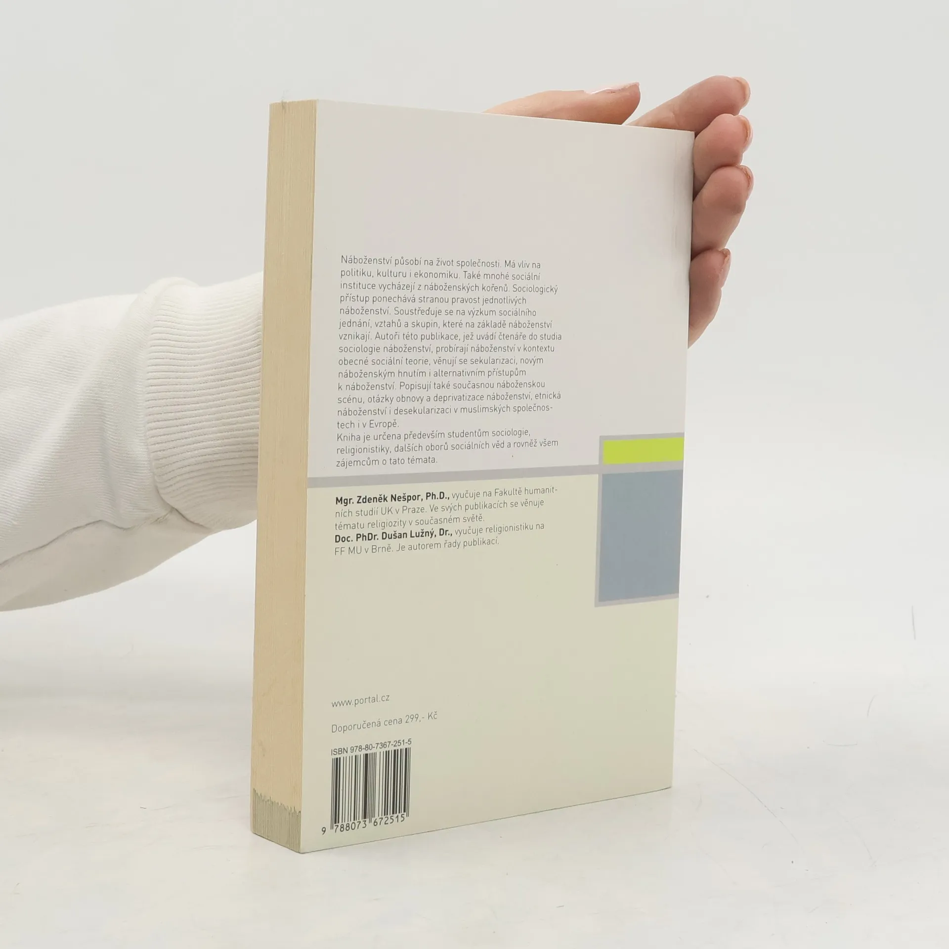 Náboženství působí na život společnosti. Má vliv na politiku, kulturu i ekonomiku. Také mnohé sociální instituce vycházejí z náboženských kořenů. Sociologický přístup ponechává stranou pravost jednotlivých náboženství. Soustředí se na výzkum sociálního jednání, vztahů a skupin, které na základě náboženství vznikají. Tato publikace uvádí čtenáře do studia sociologie náboženství. Autoři probírají náboženství v kontextu obecné sociální teorie, věnují se sekularizaci, novým náboženským hnutím i alternativním přístupům k náboženství. Popisují také současnou náboženskou scénu, otázky obnovy a deprivatizace náboženství, etnická náboženství i desekularizaci v muslimských společnostech i v Evropě. Kniha je určena především studentům religionistiky, sociologie a dalších oborů sociálních věd.