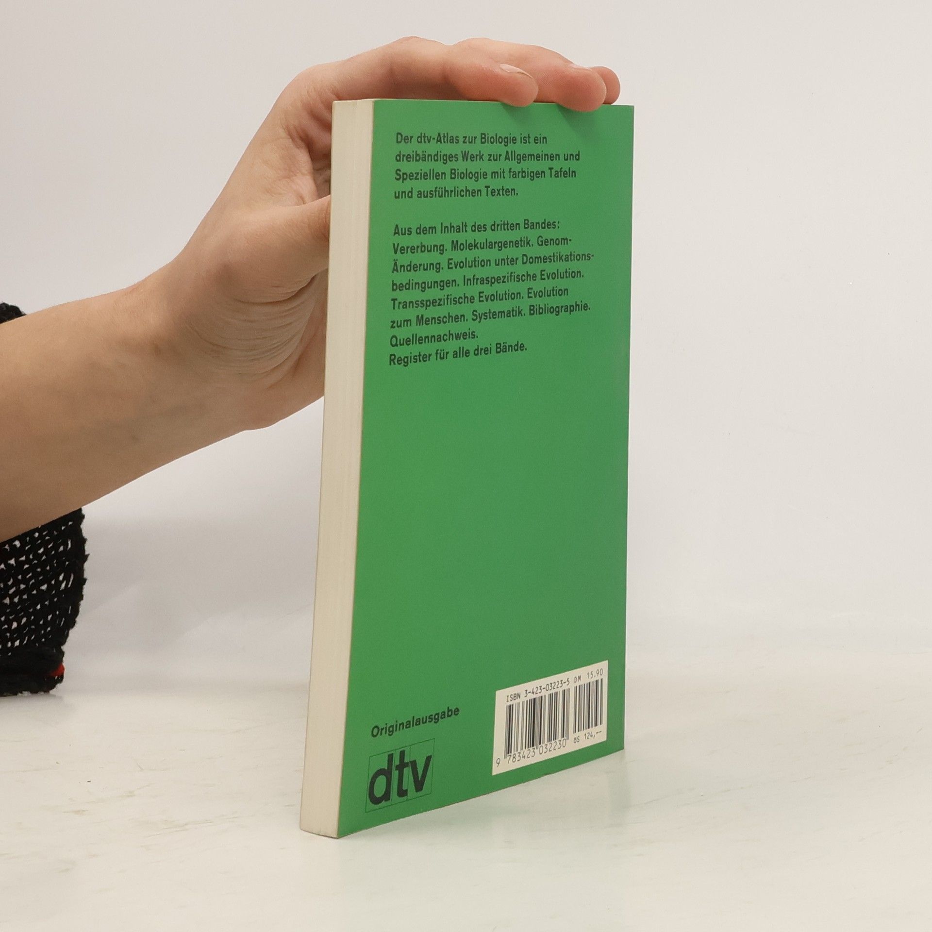 Alternative edition for ISBN 3423032235 (ISBN13: 9783423032230) Der in drei Bänden vorliegende \"dtv-Atlas Biologie\" ist nicht nur eine Einführung in die Biologie, sondern zugleich auch eine Wissenschaftskunde und ein Nachschlagewerk. Der Atlas dient vor allem Schülern der gymnasialen Oberstufe und Studenten aller Naturwissenschaften als Kompendium, Leitfaden und als Hilfsmittel zur Prüfungsvorbereitung. Aber auch alle an der Wissenschaft vom Lebendigen Interessierten erhalten einen umfassenden, wissenschaftlich exakten und verständlichen Überblick. Aus dem Inhalt des dritten Bandes: Vererbung. Molekulargenetik. Genom-Änderung. Evolution unter Domestikationsbedingungen. Infraspezifische Evolution. Transspezifische Evolution. Evolution zum Menschen. Systematik.