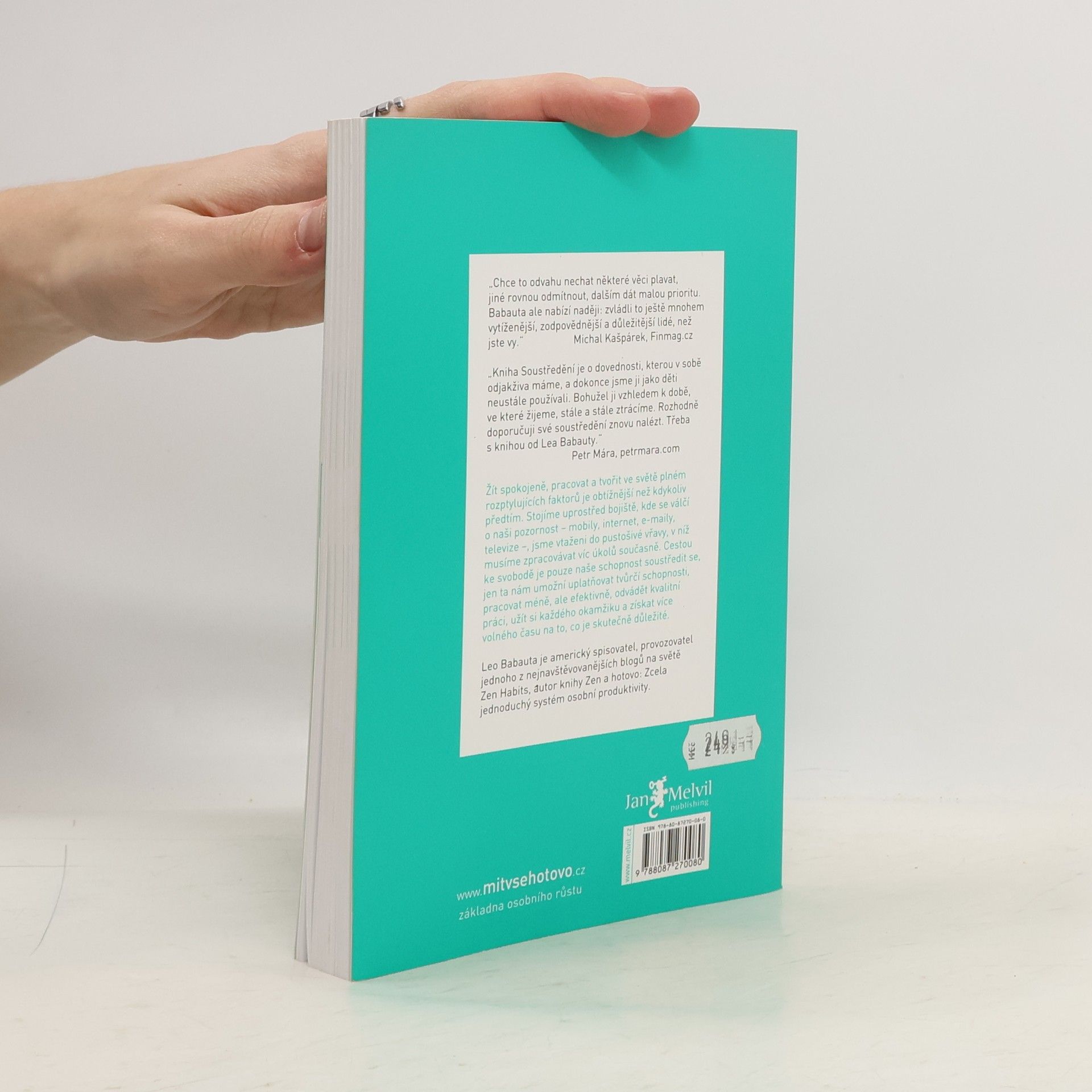 Ruku na srdce: dokážete se ještě vůbec soustředit jako za starých časů? Dokážete rozpoznat, co je pro vás opravdu důležité, a podle toho se rozhodnout o naplnění další minuty, hodiny, dne, roku vašeho života? Nebo jste tak závislí, nesoustředění a multitaskující jako velká část naší generace? Knížka pro všechny, kteří se jen stěží vzpamatovávají po zásahu kouzlem internetu, sociálních sítí a nepřetržité online dosažitelnosti. Další skvělá, praktická a inspirativní kniha Leo Babauty, jehož krédem je životní minimalismus. Naučte se znovu něco, co jste kdysi uměli od přírody: soustředit se a žít.