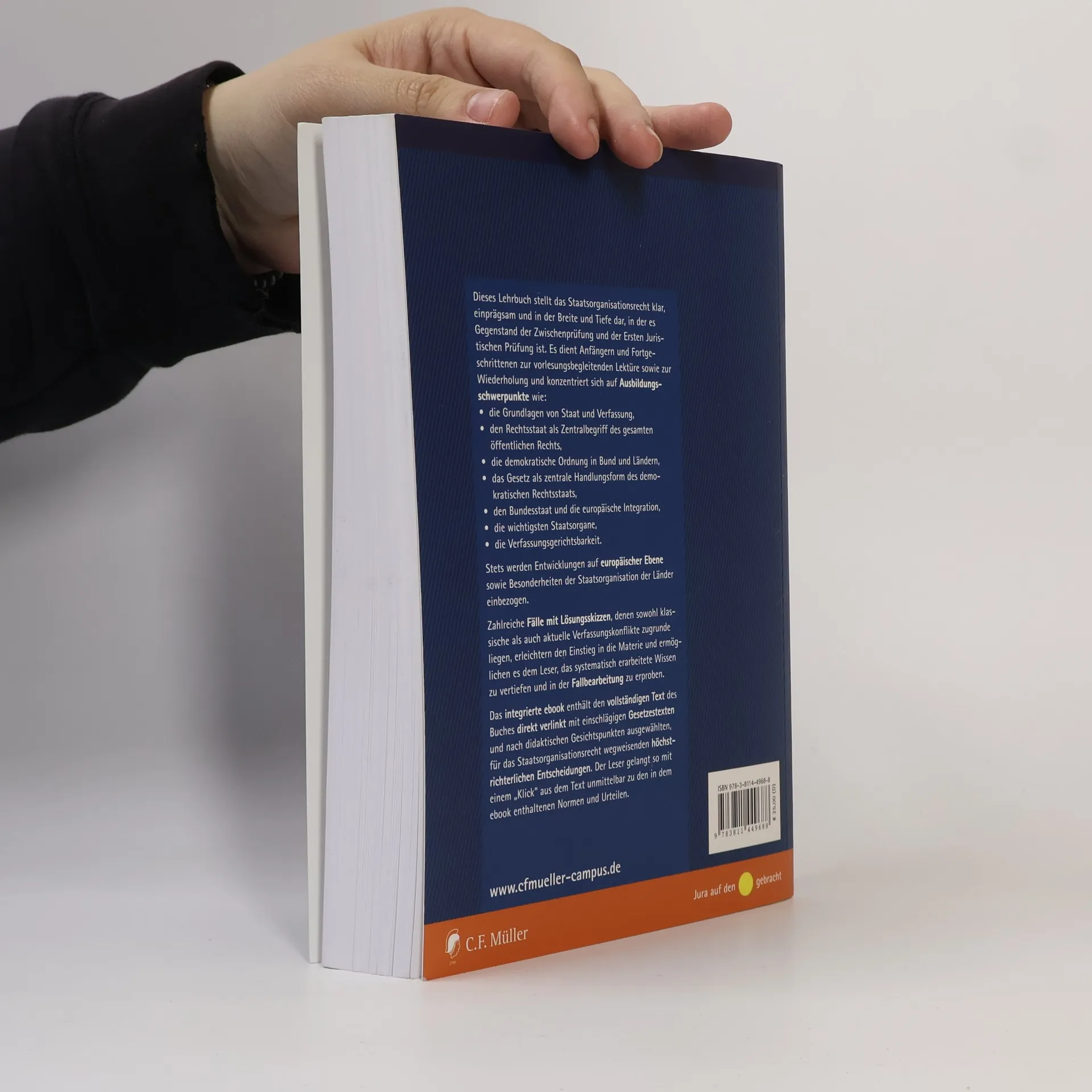 Das Lehrbuch bietet eine klare und umfassende Darstellung des Staatsorganisationsrechts, das für die Erste Juristische Prüfung im Pflichtfach relevant ist. Es richtet sich an Studierende im Anfangs- und Fortgeschrittenensemester und dient als begleitende Lektüre. Wichtige Schwerpunkte sind die Grundlagen von Staat und Verfassung, der Rechtsstaat als zentraler Begriff des öffentlichen Rechts, die demokratische Ordnung in Bund und Ländern, das Gesetz als zentrale Handlungsform, der Bundesstaat und die europäische Integration sowie die wichtigsten Staatsorgane und die Verfassungsgerichtsbarkeit. Zudem werden relevante Entwicklungen auf europäischer Ebene berücksichtigt. Nahezu 80 Fälle mit Lösungsskizzen, die Leitentscheidungen des BVerfG nachgebildet sind, erleichtern den Zugang zum Staatsorganisationsrecht und vertiefen das erlernte Wissen. Das integrierte eBook enthält den vollständigen Text, relevante Gesetzestexte und wichtige höchstrichterliche Entscheidungen im Volltext. Verlinkungen ermöglichen den direkten Zugriff auf Normen und Urteile. Dadurch wird das Nachschlagen von Gesetzestexten und das Lesen der Entscheidungen über PC, Tablet oder Smartphone erleichtert. Die ausgewählten Entscheidungen des Bundesverfassungsgerichts und anderer Obergerichte sind mit Genehmigung der juris GmbH veröffentlicht.