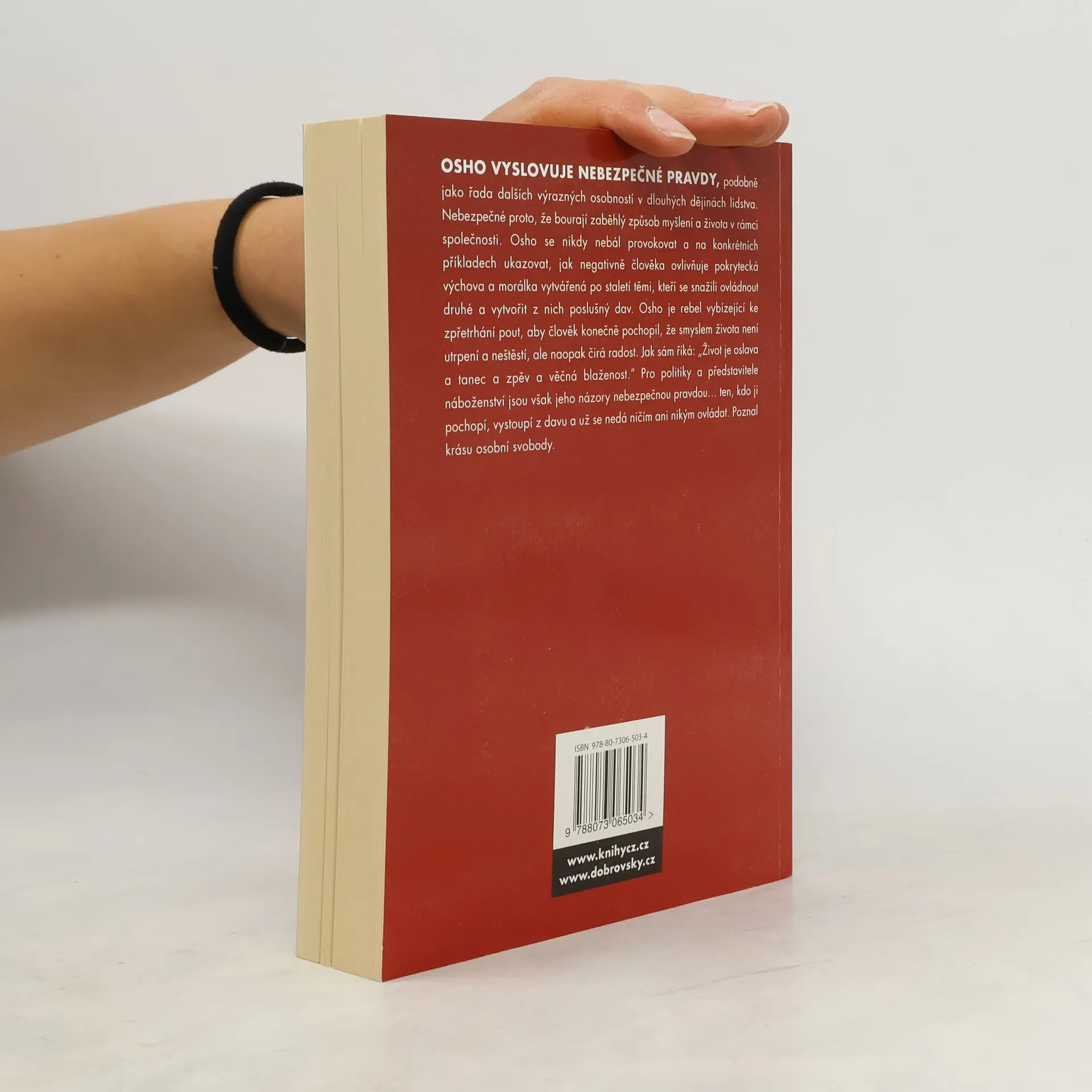 Odvaha přijmout nepoznatelné V celých dějinách lidstva se setkáváme s jedinci, kteří říkali nebezpečnou pravdu. Nebezpečnou proto, že bourá zaběhlý způsob myšlení a života v rámci lidské společnosti. Osho patří mezi osobnosti, které se nikdy nebály provokovat a na konkrétních příkladech ukazovat, jak negativně člověka ovlivňuje pokrytecká výchova a morálka vytvářená po staletí lidmi, kteří se snažili ovládnout druhé a vytvořit z nich poslušný dav. Osho je rebel vybízející ke zpřetrhání pout, aby člověk konečně poznal, že smyslem života není utrpení a neštěstí, ale právě naopak radost a blaženost. Jak sám říká: „Život je oslava a tanec a zpěv a věčná blaženost - prožívání života Zorby Buddhy, který spojuje vše krásné, co nabízí tento svět, s nejvyšším poznání jednoty člověka a celého vesmíru.“ Pro politiky a představitele náboženství je to ale nebezpečná pravda, protože ten, kdo ji pochopí, vystoupí z davu a už se nedá ničím ani nikým ovládat, protože poznal krásu osobní svobody.