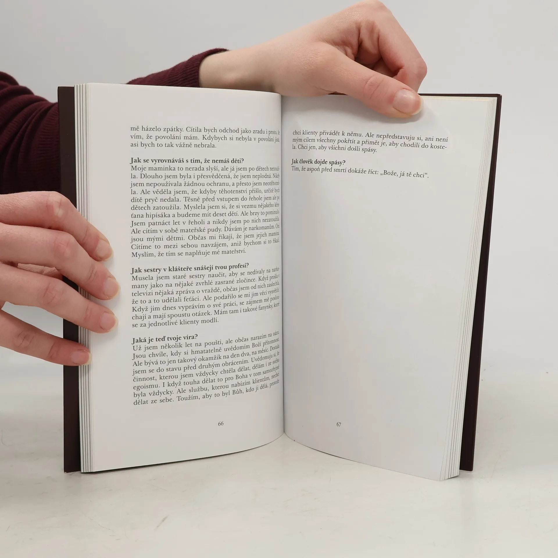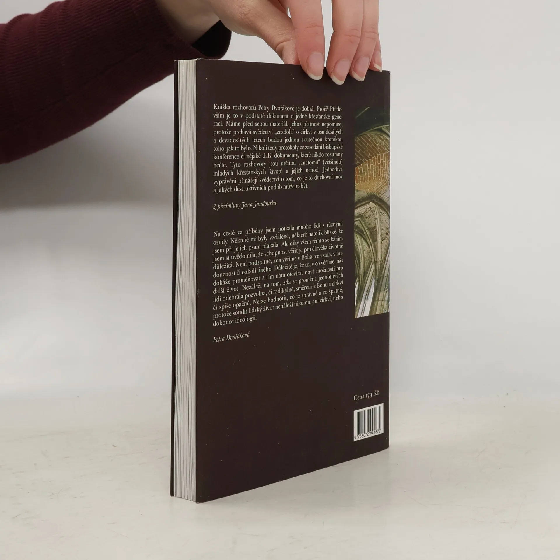 Máme před sebou materiál, jehož platnost nepomine, protože prchavá svědectví „zezdola“ o církvi v osmdesátých a devadesátých letech budou jednou skutečnou kronikou toho, jak to bylo. Nikoli tedy protokoly ze zasedání biskupské konference či nějaké další dokumenty, které nikdo rozumný nečte. Tyto rozhovory jsou určitou „anatomií“ (vetšinou) mladých křesťanských životů a jejich nehod. Jednotlivá vyprávění přinášejí svědectví o tom, co je to duchovní moc a jakých destruktivních podob může nabýt. JAN JANDOUREK Díky všem těmto setkáním jsem si uvědomila, že schopnost věřit je pro člověka životně důležitá. Není podstatné, zda věříme v Boha, ve vztah, v budoucnost či cokoli jiného. Důležité je, že to, v co věříme, nás dokáže proměňovat a tím nám otevírat nové možnosti pro další život. Nezáleží na tom, zda se proměna jednotlivých lidí odehrála pozvolna nebo radikálně, směrem k Bohu a církvi, či spíše opačně. Nelze hodnotit, co je správné a co špatné, protože soudit lidský život nenáleží nikomu, ani církvi, nebo dokonce ideologii. PETRA DVOŘÁKOVÁ