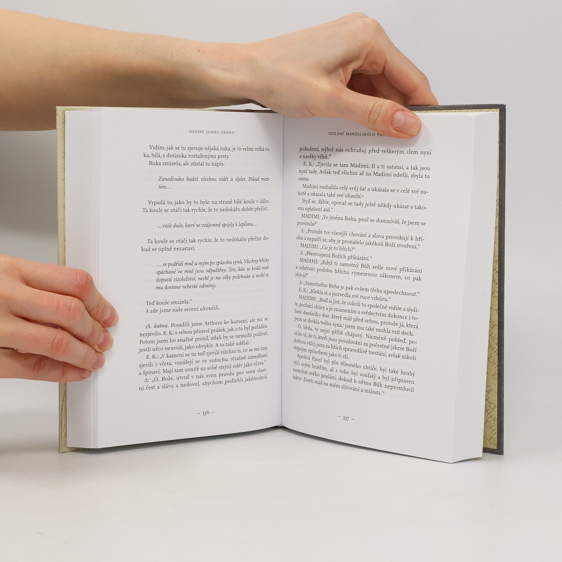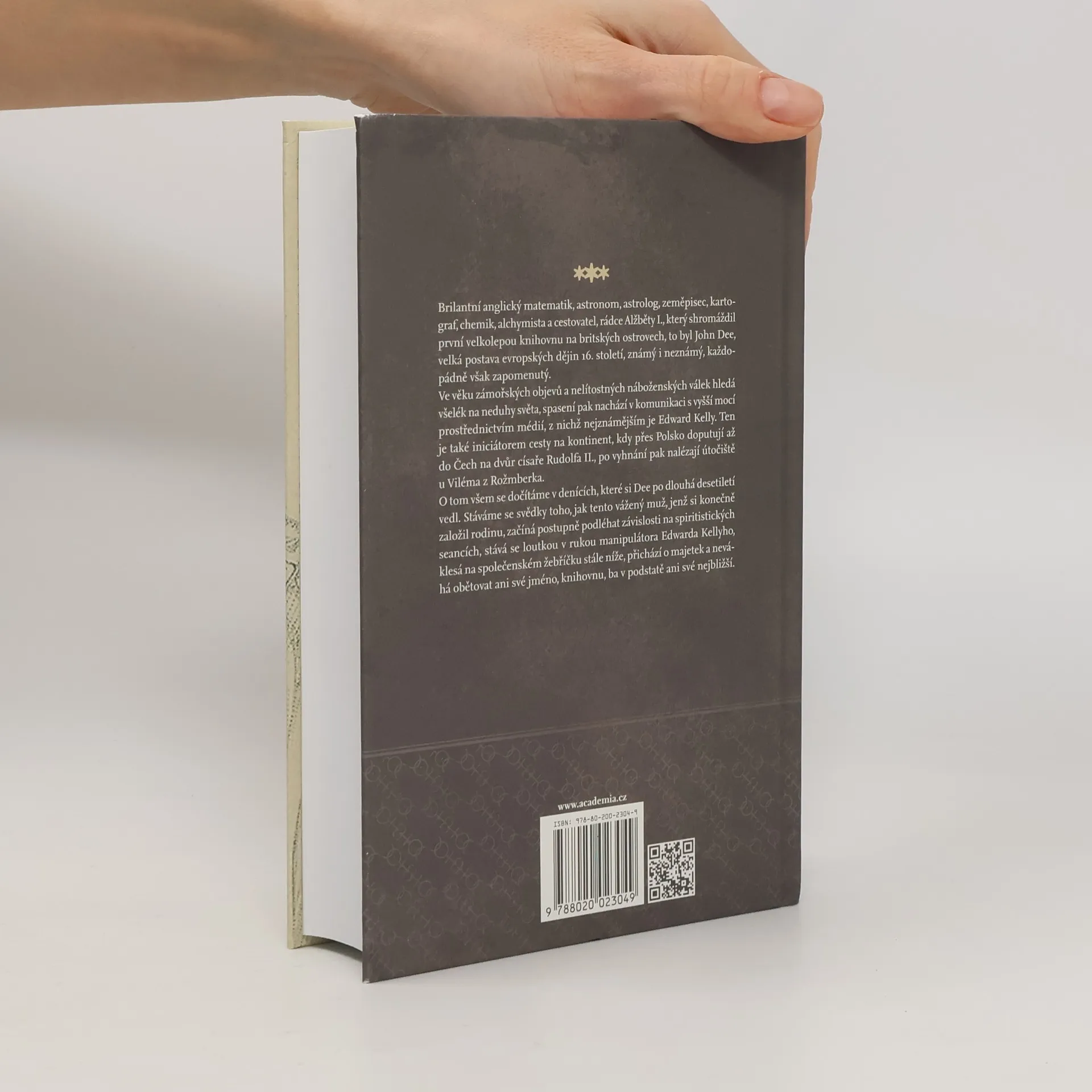 Brilantní matematik, astronom, astrolog, zeměpisec, kartograf, chemik, alchymista a cestovatel, rádce Alžběty I., který shromáždil první velkolepou knihovnu na Britských ostrovech, to byl John Dee, velká postava britských i evropských dějin šestnáctého století, známý i neznámý, každopádně však zapomenutý. Ve věku zámořských objevů a nelítostných náboženských válek hledá všelék na neduhy světa, spasení pak nachází v komunikaci s vyšší mocí prostřednictvím médií, z nichž nejznámějším je Edward Kelly. Ten je také iniciátorem cesty na kontinent, kdy přes Polsko doputují až do Čech na dvůr císaře Rudolfa II., aby pak po vyhnání nalezli útočiště u Viléma z Rožmberku. O tom všem se dočítáme v denících, které si Dee po dlouhá desetiletí vedl. Stáváme se svědky toho, jak tento vážený muž, jenž si konečně založil rodinu, začíná postupně podléhat závislosti na spiritistických seancích, stává se loutkou v rukou manipulátora Edwarda Kellyho, klesá na společenském žebříčku stále níže, přichází o majetek, a neváhá obětovat ani své jméno, knihovnu, ba v podstatě ani své nejbližší. Přeložili Derek Paton a Marzia Paton.