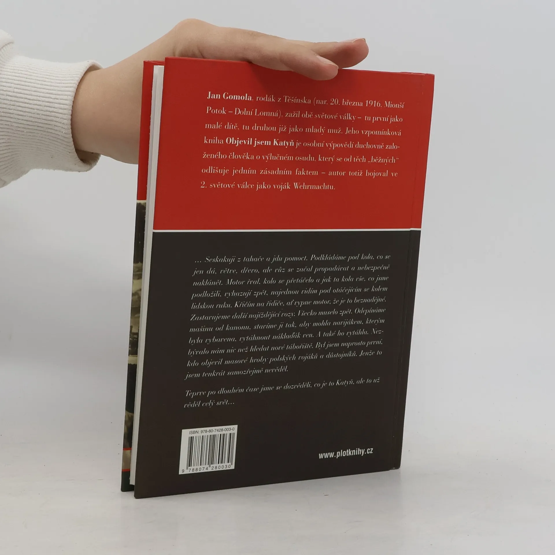 Jan Gomola, rodák z Těšínska (nar. 20. března 1916, Mionší Potok – Dolní Lomná), zažil obě světové války – tu první jako malé dítě, tu druhou již jako mladý muž. Jeho vzpomínková kniha Objevil jsem Katyň je osobní výpovědí duchovně založeného člověka o výlučném osudu, který se od těch „běžných“ odlišuje jedním zásadním faktem – autor totiž bojoval ve 2. světové válce jako voják Wehrmachtu.