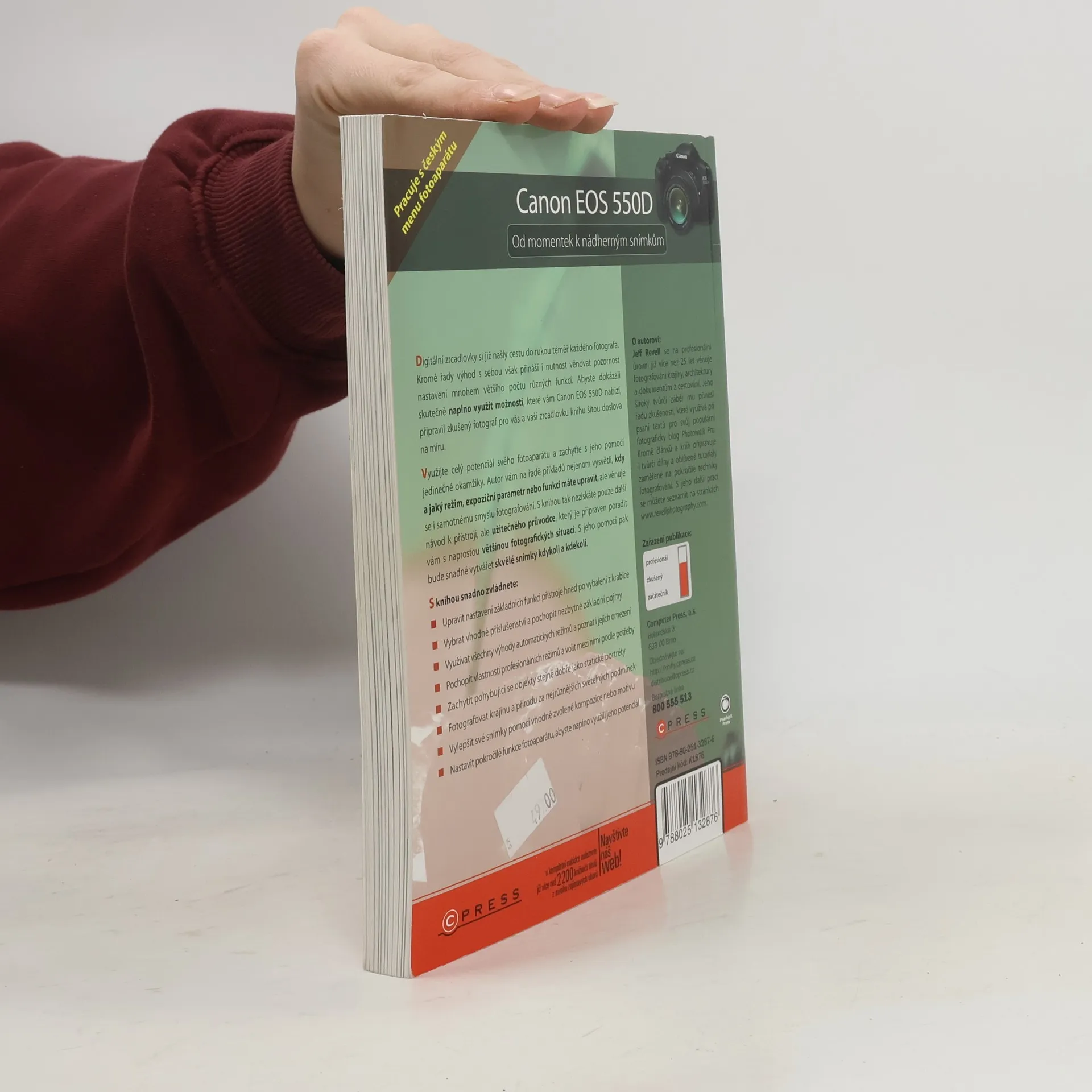 Digitální zrcadlovky si již našly cestu do rukou téměř každého fotografa. Kromě řady výhod s sebou však přináší i nutnost věnovat pozornost nastavení mnohem většího počtu různých funkcí. Abyste dokázali skutečně naplno využít možnosti, které vám Canon EOS 550D nabízí, připravil zkušený fotograf pro vás a vaši zrcadlovku knihu šitou doslova na míru. Využijte celý potenciál svého fotoaparátu a zachyťte s jeho pomocí jedinečné okamžiky. Autor vám na řadě příkladů nejenom vysvětlí, kdy a jaký režim, expoziční parametr nebo funkci máte upravit, ale věnuje se i samotnému smyslu fotografování. S knihou tak nezískáte pouze další návod k přístroji, ale užitečného průvodce, který je připraven poradit vám s naprostou většinou fotografických situací. S jeho pomocí pak bude snadné vytvářet skvělé snímky kdykoli a kdekoli. S knihou snadno zvládnete: * Upravit nastavení základních funkcí přístroje hned po vybalení z krabice * Vybrat vhodné příslušenství a pochopit nezbytné základní pojmy * Využívat všechny výhody automatických režimů a poznat i jejich omezení * Pochopit vlastnosti profesionálních režimů a volit mezi nimi podle potřeby * Zachytit pohybující se objekty stejně dobře jako statické portréty * Fotografovat krajinu a přírodu za nejrůznějších světelných podmínek * Vylepšit své snímky pomocí vhodně zvolené kompozice nebo motivu * Nastavit pokročilé funkce fotoaparátu, abyste naplno využili jeho potenciál