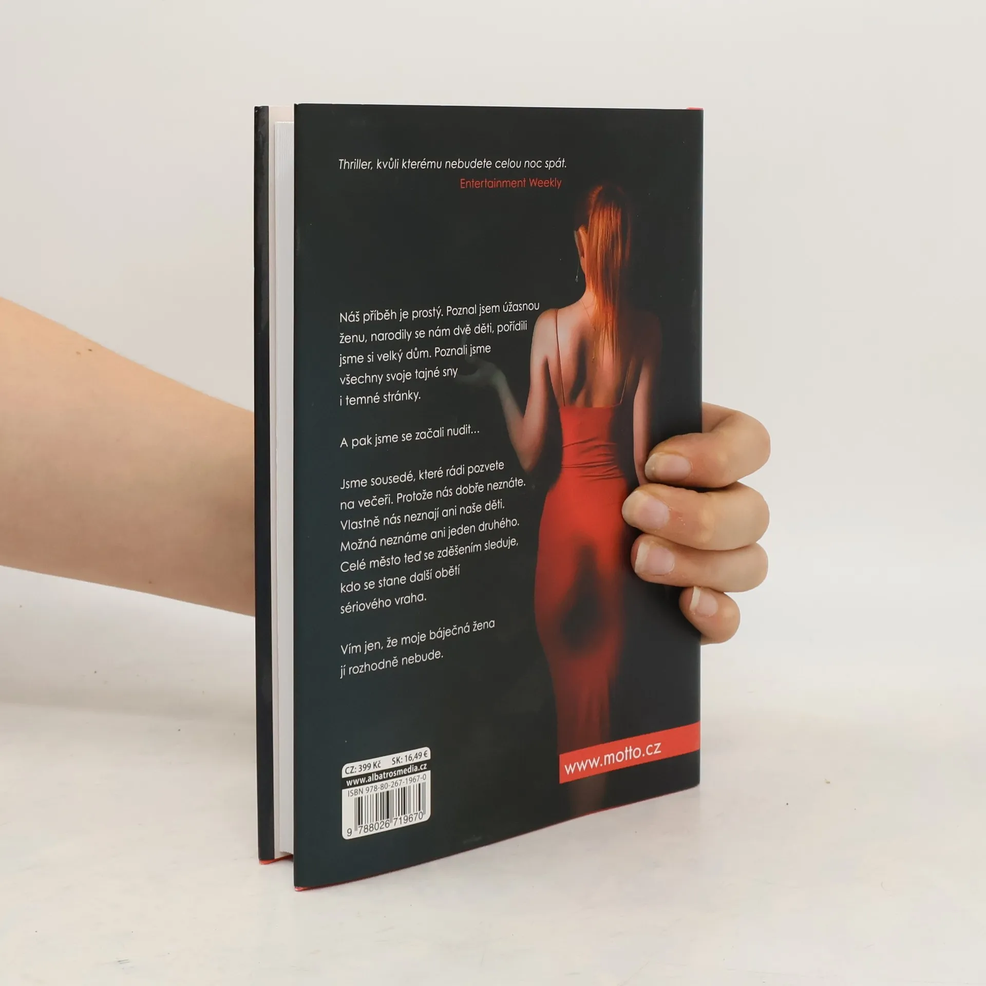 Každý pár má své tajemství. Tím naším je vražda. Náš příběh je prostý. Poznal jsem úžasnou ženu, narodily se nám dvě děti, pořídili jsme si velký dům. Poznali jsme všechny svoje tajné sny i temné stránky. A pak jsme se začali nudit… Jsme sousedé, které rádi pozvete na večeři. Protože nás dobře neznáte. Vlastně nás neznají ani naše děti. Možná neznáme ani jeden druhého. Celé město teď se zděšením sleduje, kdo se stane další obětí sériového vraha. Vím jen, že moje báječná žena jí rozhodně nebude.