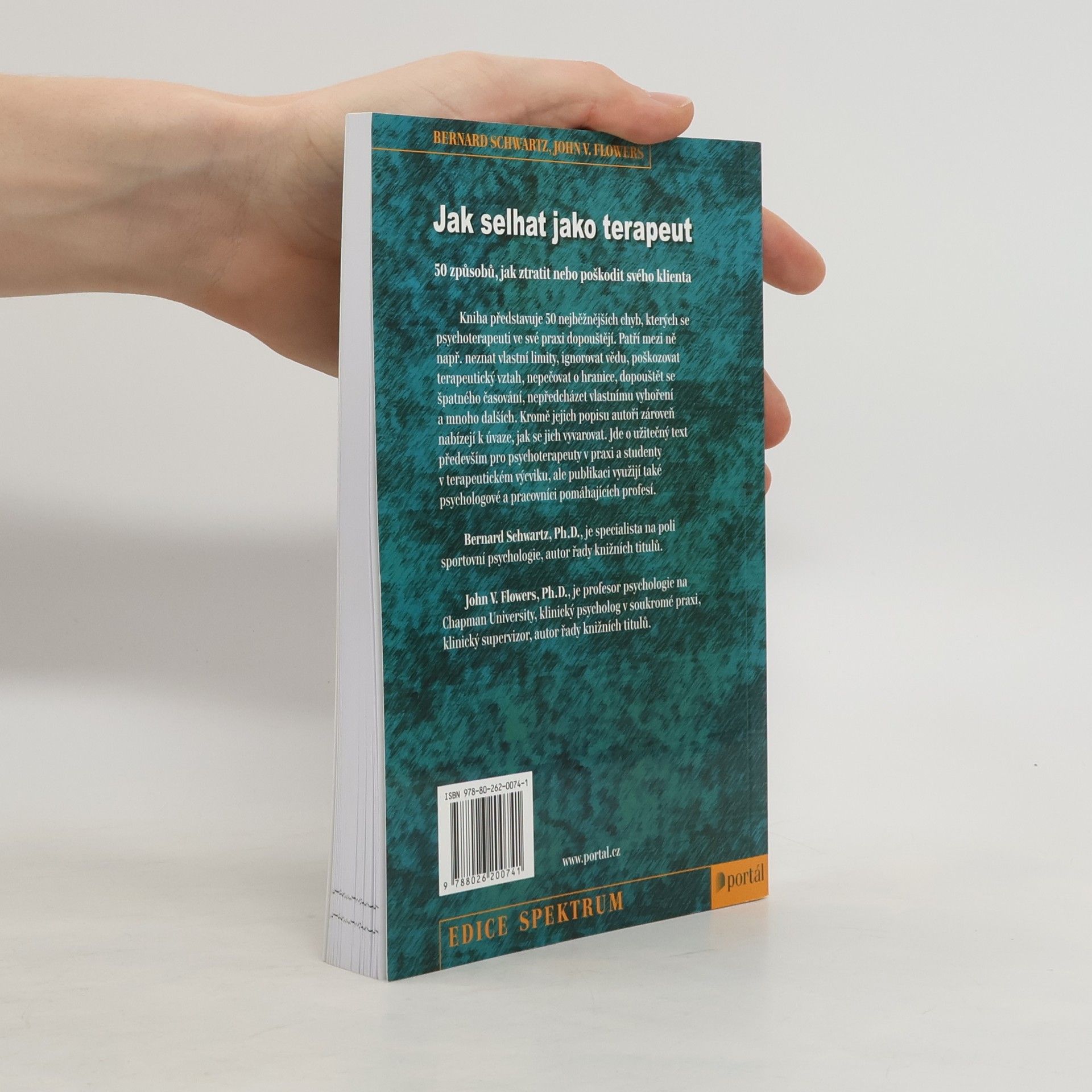 50 způsobů, jak ztratit nebo poškodit svého klienta. Kniha představuje 50 nejběžnějších chyb, kterých se psychoterapeuti ve své praxi dopouštějí. Patří mezi ně např. neznat vlastní limity, ignorovat vědu, poškozovat terapeutický vztah, nepečovat o hranice, dopouštět se špatného časování, nepředcházet vlastnímu vyhoření a mnoho dalších. Kromě jejich popisu autoři zároveň nabízejí k úvaze, jak se jich vyvarovat. Jde o užitečný text především pro psychoterapeuty v praxi a studenty v terapeutickém výcviku, ale publikaci využijí také psychologové a pracovníci pomáhajících profesí. Bernard Schwartz, Ph.D., je specialista na poli sportovní psychologie, autor řady knižních titulů. John V. Flowers, Ph.D., je profesor psychologie na Chapman University, klinický psycholog v soukromé praxi, klinický supervizor, autor řady knižních titulů.