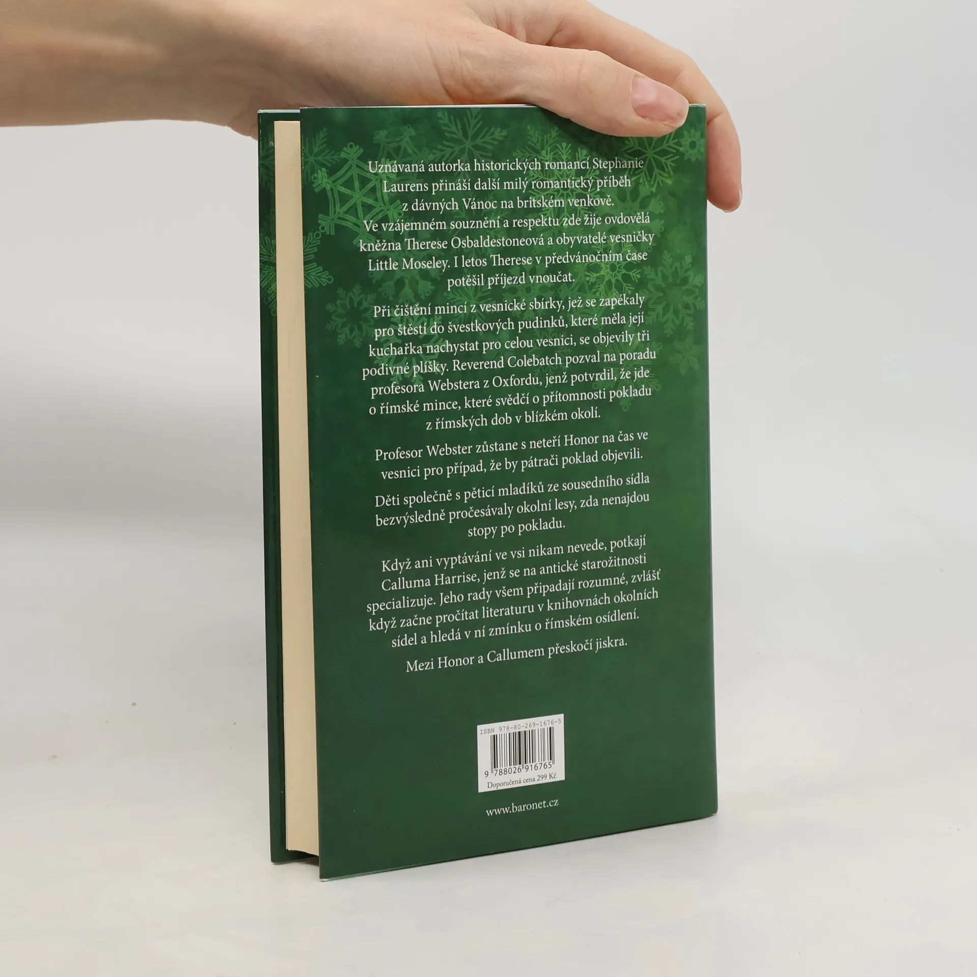 Uznávaná autorka historických romancí Stephanie Laurens přináší další příběh z dávných Vánoc na britském venkově, kde lady Therese Osbaldestoneová žije v harmonii s obyvateli vesničky Little Moseley. V předvánočním čase ji navštíví vnoučata Jamie, George a Lottie, kteří se rádi zapojují do příprav na svátky. Letos se k nim přidává Melissa, dcera Theresiny starší dcery, a její sestra Amanda. Děti se nadšeně účastní tradičních akcí, a Therese se rozhodne upéct švestkové pudinky pro celou vesnici. Při čištění sbírky mincí se objeví tři podivné plíšky, které reverend Colebatch identifikuje jako římské mince, což naznačuje přítomnost pokladu v okolí vesnice. Profesor Webster z Oxfordu přijíždí, aby pomohl s pátráním. Děti a mladíci z okolí procházejí lesy a vyptávají se vesničanů, ale nikdo o mincích neví. Naštěstí potkají Calluma Harrise, specialistu na antické starožitnosti, jehož rady jsou cenné. Mezitím mezi Honor a Callumem vzniká jiskra, ale jejich románek je komplikován potřebou usmíření s Honoriným strýcem. Therese se rozhodne pomoci, aby mladí lidé mohli následovat své srdce. Čas se krátí; stihnou objevit vzácný římský poklad a vyznat si lásku před Vánocemi? Tento příběh o pokladu a přítomné lásce patří do řady romantických příběhů oblíbené autorky.