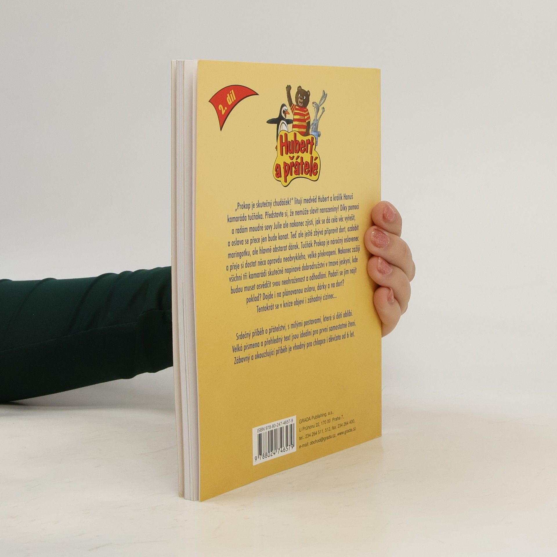 „Prokop je skutečný chudáček!“ litují medvěd Hubert a králík Hanuš kamaráda tučňáka. Představte si, že nemůže slavit narozeniny! Díky pomoci a radám moudré sovy Julie ale nakonec zjistí, jak se dá celá věc vyřešit, a oslava se přece jen bude konat. Teď ale ještě zbývá připravit dort, ozdobit maringotku, ale hlavně obstarat dárek. Tučňák Prokop je náročný oslavenec a přeje si dostat něco opravdu neobvyklého, velké překvapení. Nakonec zažijí všichni tři kamarádi skutečně napínavé dobrodružství v tmavé jeskyni, kde budou muset osvědčit svou neohroženost a odhodlání. Podaří se jim najít poklad? Dojde i na plánovanou oslavu, dárky a na dort? Tentokrát se v knize objeví i záhadný cizinecůSrdečný příběh o přátelství, s milými postavami, které si děti oblíbí. Velká písmena a přehledný text jsou ideální pro první samostatné čtení. Zábavný a okouzlující příběh je vhodný pro chlapce i děvčata od 6 let.