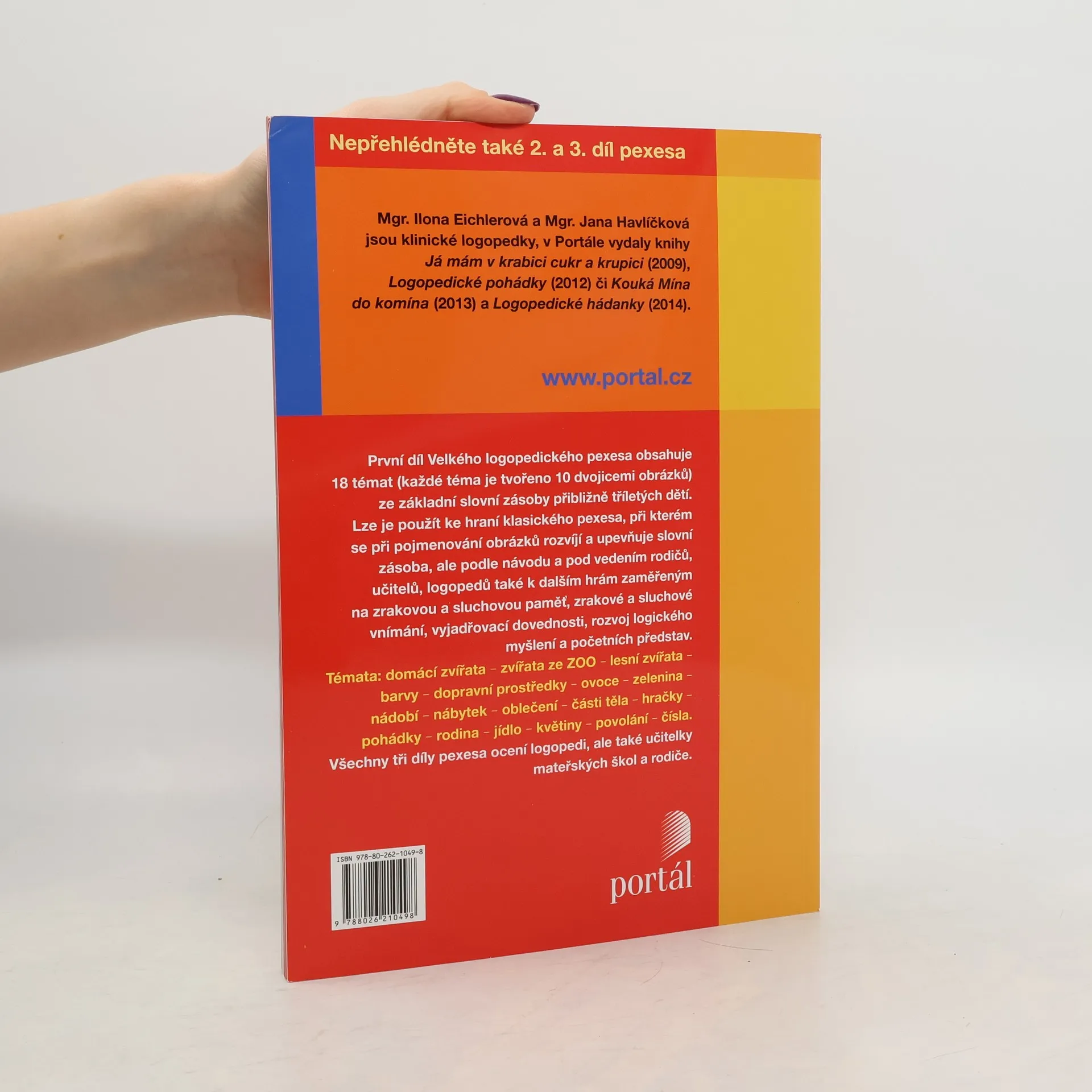 Velké logopedické pexeso obsahuje ve třech dílech 54 témat ze základní slovní zásoby přibližně tříletých dětí. Každé téma je tvořeno 10 dvojicemi obrázků. Lze je použít ke hraní klasického pexesa, při kterém se při pojmenování obrázků rozvíjí a upevňuje slovní zásoba, ale podle návodu a pod vedením rodičů, učitelů či logopedů také k dalším hrám zaměřeným na zrakovou a sluchovou paměť, zrakové a sluchové vnímání, vyjadřovací dovednosti, rozvoj logického myšlení a početních představ. Mezi využitá témata patří domácí zvířata, dopravní prostředky, ovoce, nábytek, oblečení, hudební nástroje, sporty, hmyz, stromy, dopravní značky, počasí, protiklady ad. Knihu ocení logopedi, ale také učitelky mateřských škol. Seznam témat třetího dílu: ovoce, škola, budovy a obydlí, boty, šperky, dopravní značky, přírodní útvary, počasí, plavidla, elektrospotřebiče, sladkosti, povolání, slovesa, zvířecí příbytky, mláďata, předložky, pravo-levá orientace, části domu. Mgr. Ilona Eichlerová a Mgr. Jana Havlíčková jsou klinické logopedky, autorky knihy Já mám v krabici cukr a krupici (Portál, 2009).