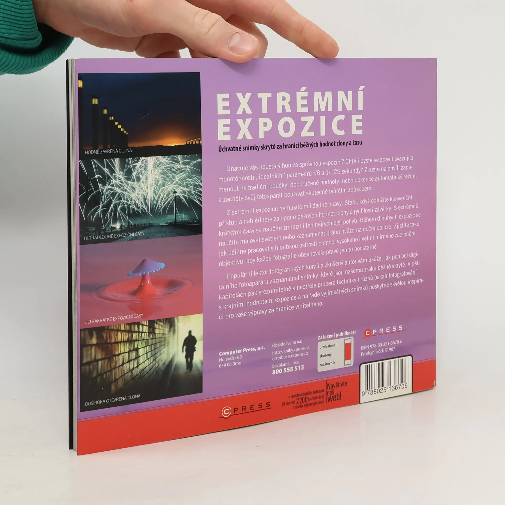 V některých případech běžné poučky o správných hodnotách clony a rychlosti závěrky nestačí a automatické expoziční režimy fotoaparátu si s danou scénou neporadí. Zkušený autor v knize vysvětlí, jak zmrazit i ten nejrychlejší pohyb, nebo malovat světlem během dlouhých expozic. Zjistíte také, jak účinně pracovat s hloubkou ostrosti, nebo s vysokým i velmi mírným zacloněním objektivu.